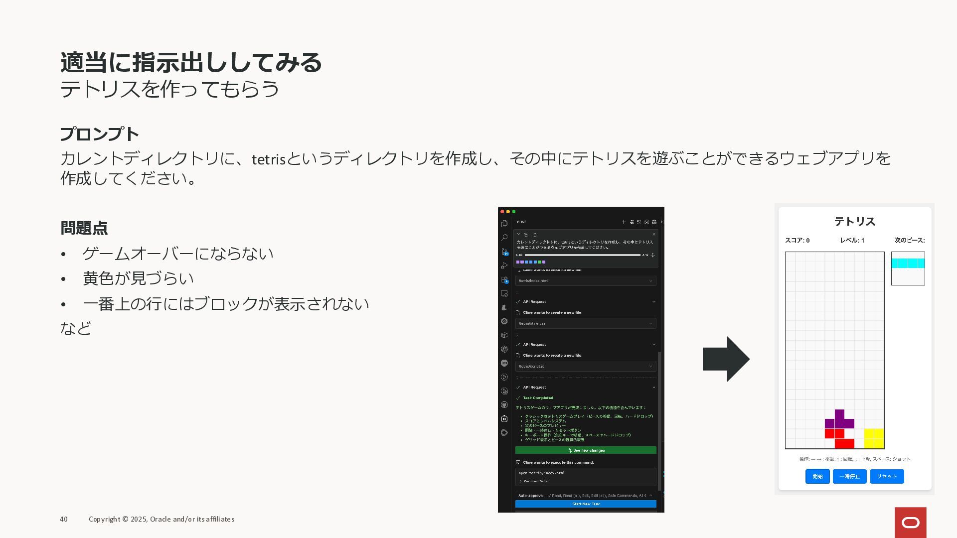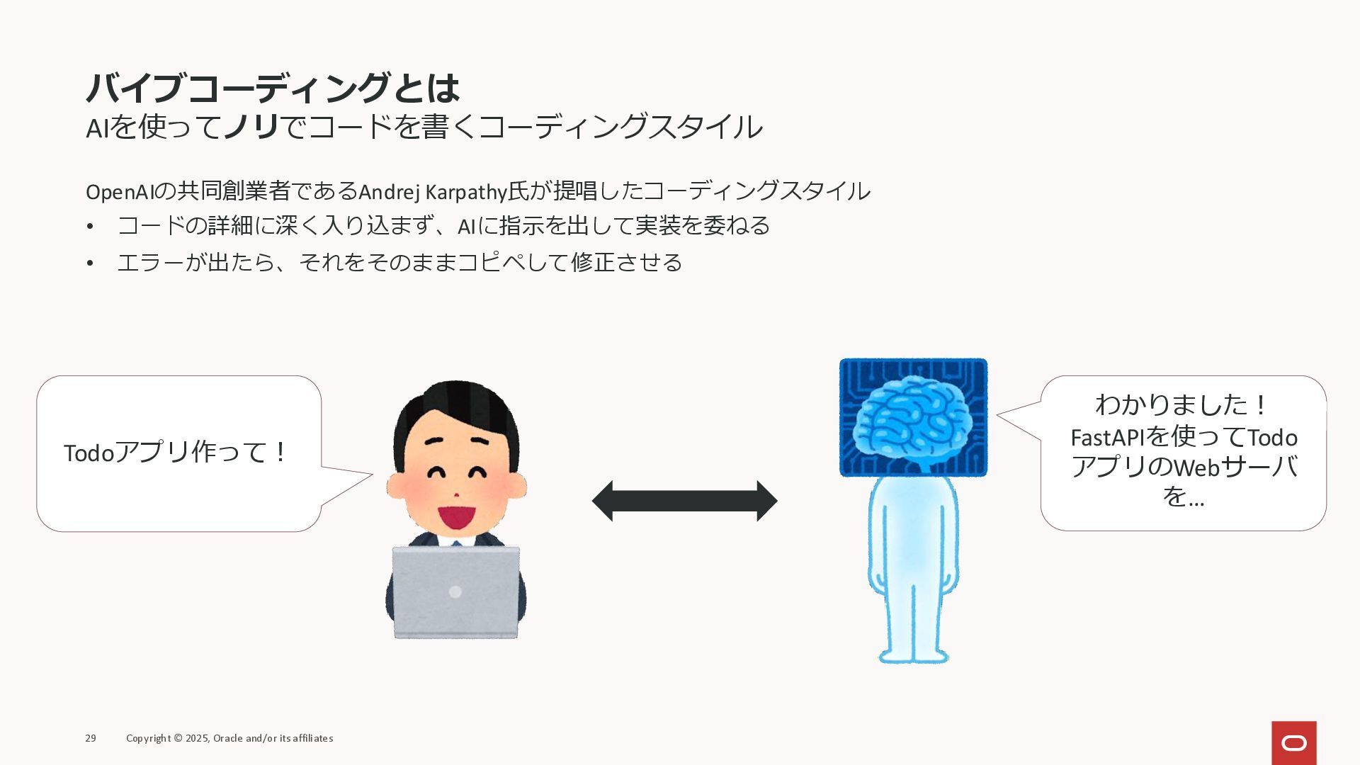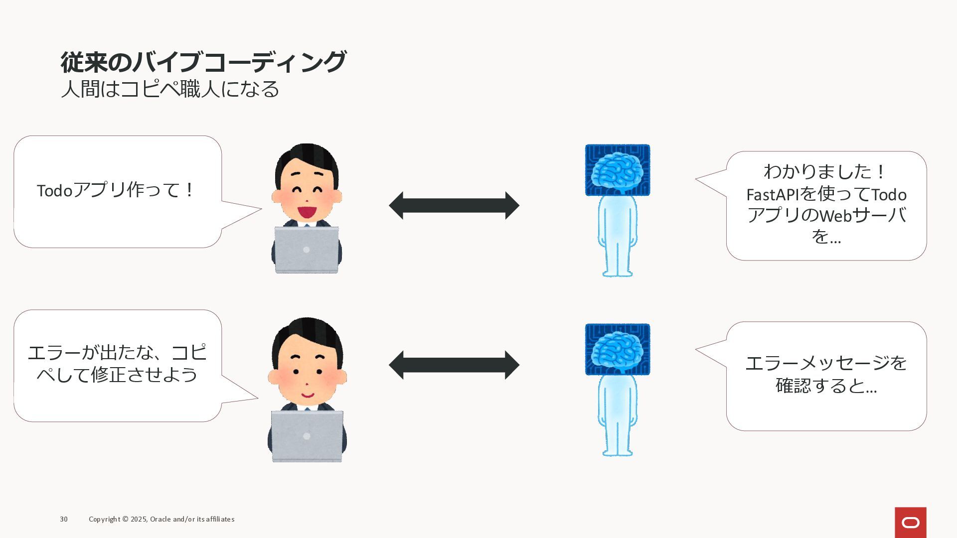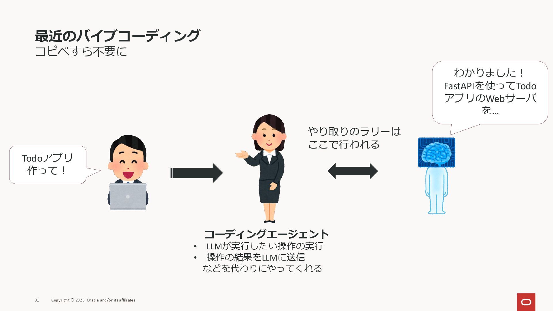 従来のバイブコーディング 人間はコピペ職人になる 30 Copyright © 2025, Oracle and/or its affiliates