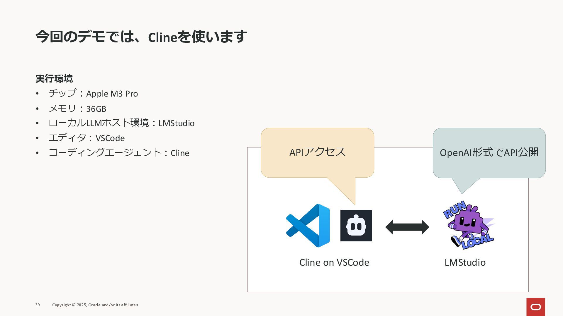 • エディタ:VSCode • コーディングエージェント:Cline 39 Copyright © 2025, Oracle and/or its affiliates Cline on VSCode LMStudio OpenAI形式でAPI公開 APIアクセス