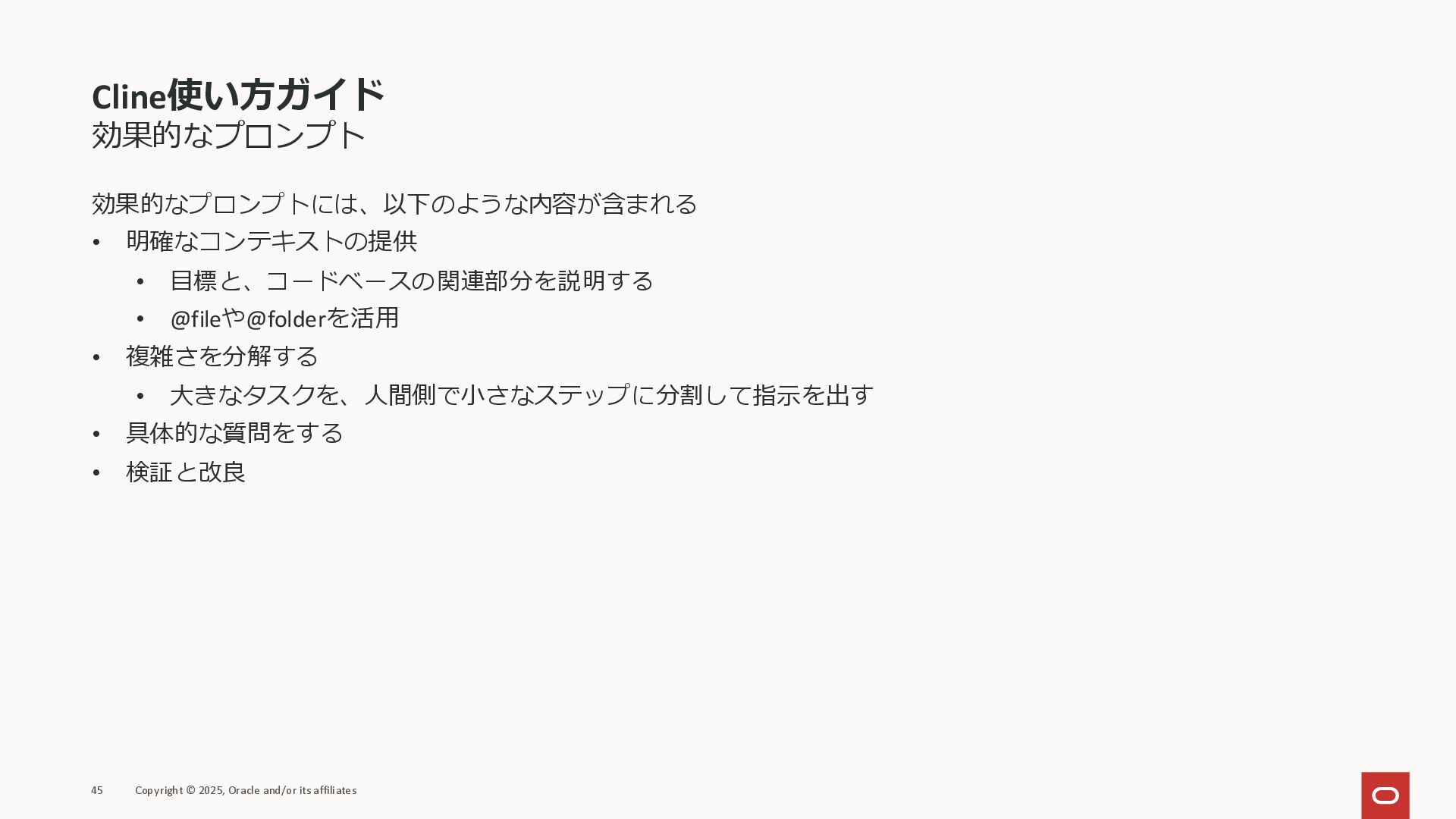 複雑さを分解する • 大きなタスクを、人間側で小さなステップに分割して指示を出す • 具体的な質問をする • 検証と改良 45 Copyright © 2025, Oracle and/or its affiliates