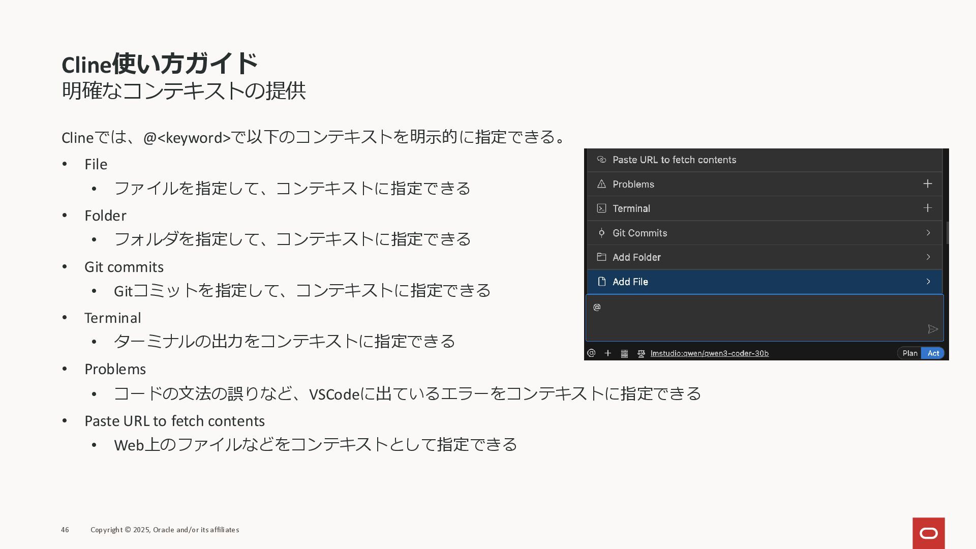 フォルダを指定して、コンテキストに指定できる • Git commits • Gitコミットを指定して、コンテキストに指定できる • Terminal • ターミナルの出力をコンテキストに指定できる • Problems • コードの文法の誤りなど、VSCodeに出ているエラーをコンテキストに指定できる • Paste URL to fetch contents • Web上のファイルなどをコンテキストとして指定できる 46 Copyright © 2025, Oracle and/or its affiliates