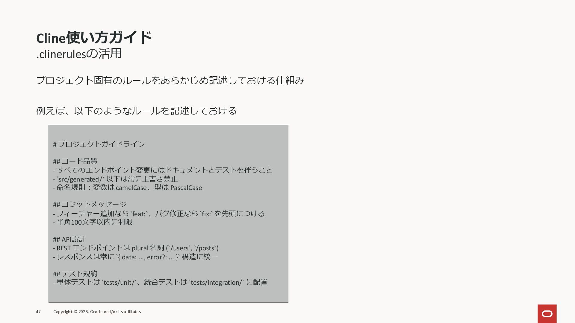 Cline使い方ガイド .clinerulesの活用 プロジェクト固有のルールをあらかじめ記述しておける仕組み 例えば、以下のようなルールを記述しておける 47 Copyright © 2025, Oracle and/or