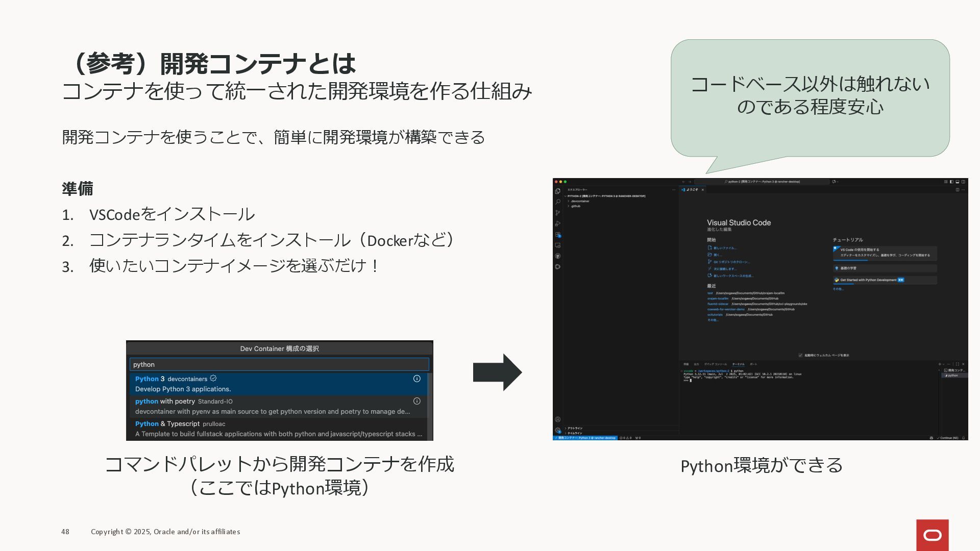 48 Copyright © 2025, Oracle and/or its affiliates コマンドパレットから開発コンテナを作成 (ここではPython環境) Python環境ができる コードベース以外は触れない のである程度安心