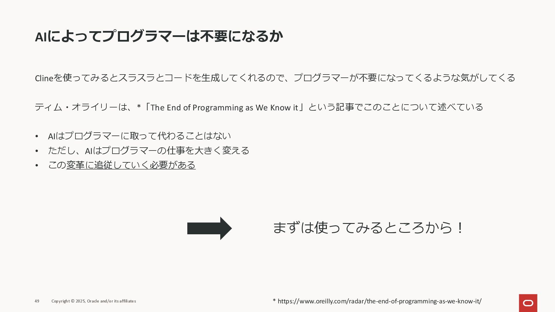 • AIはプログラマーに取って代わることはない • ただし、AIはプログラマーの仕事を大きく変える • この変革に追従していく必要がある 49 Copyright © 2025, Oracle and/or its affiliates * https://www.oreilly.com/radar/the-end-of-programming-as-we-know-it/ まずは使ってみるところから!