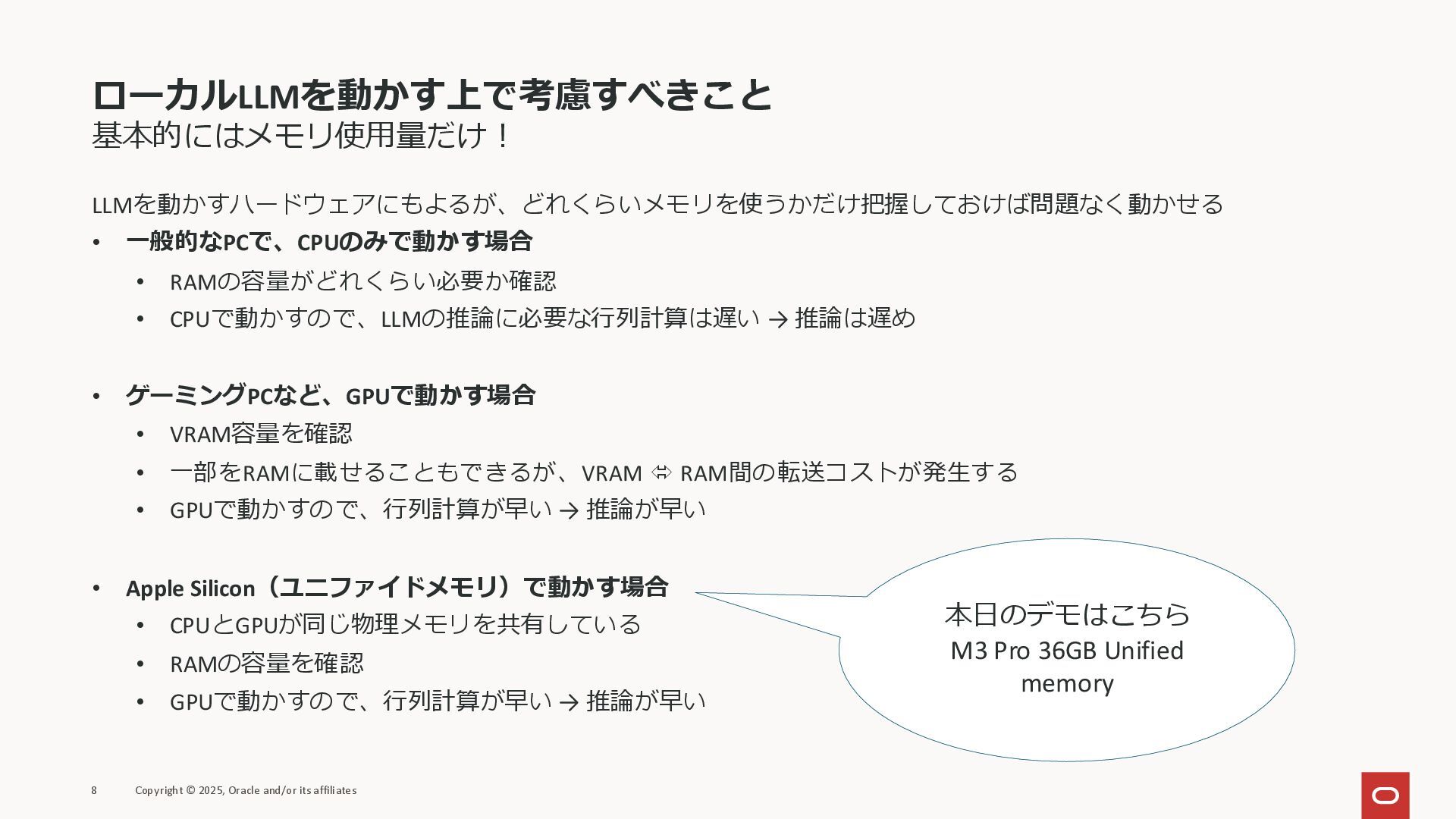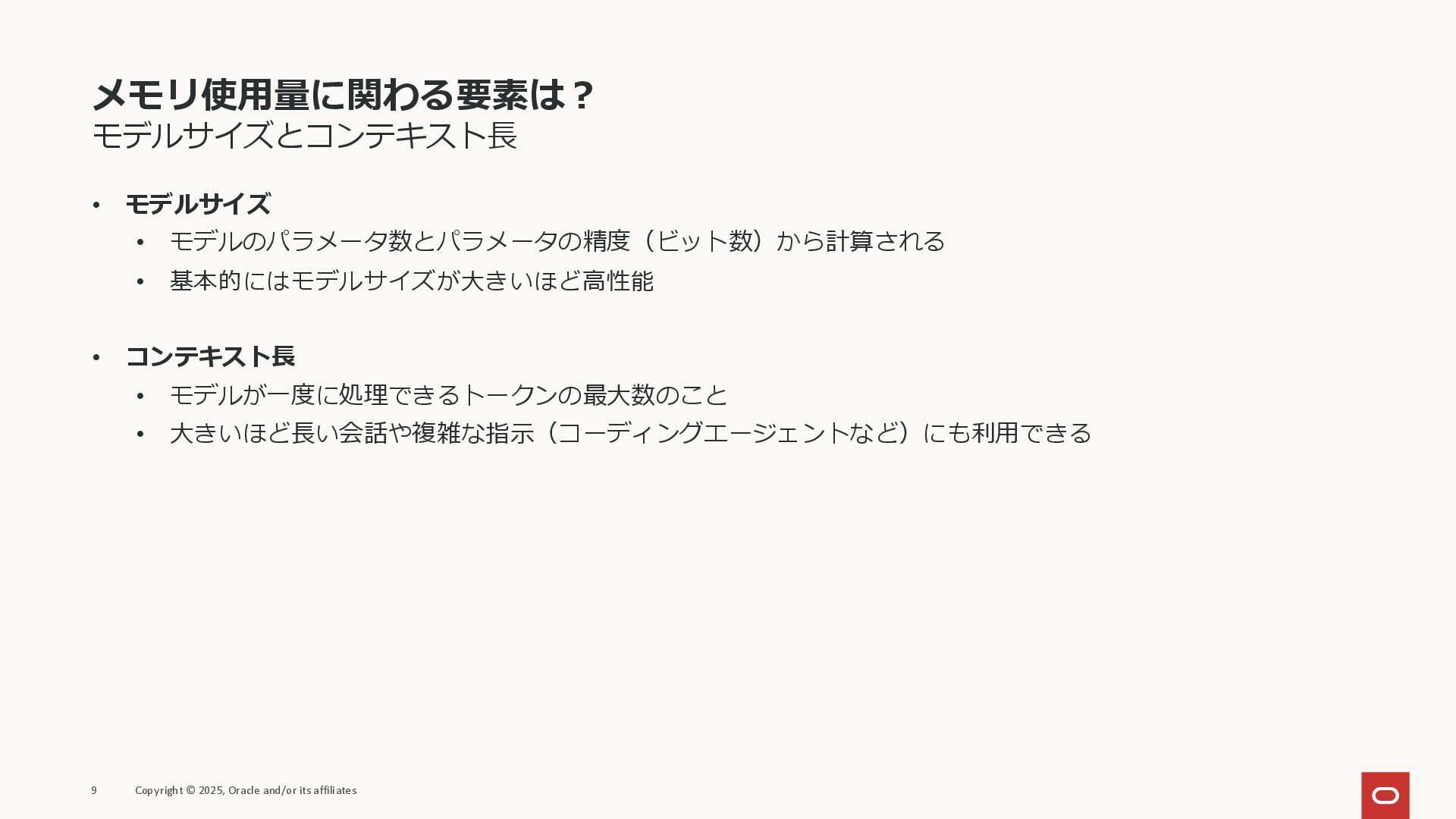 推論は遅め • ゲーミングPCなど、GPUで動かす場合 • VRAM容量を確認 • 一部をRAMに載せることもできるが、VRAM RAM間の転送コストが発生する • GPUで動かすので、行列計算が早い → 推論が早い • Apple Silicon(ユニファイドメモリ)で動かす場合 • CPUとGPUが同じ物理メモリを共有している • RAMの容量を確認 • GPUで動かすので、行列計算が早い → 推論が早い 8 Copyright © 2025, Oracle and/or its affiliates 本日のデモはこちら M3 Pro 36GB Unified memory
