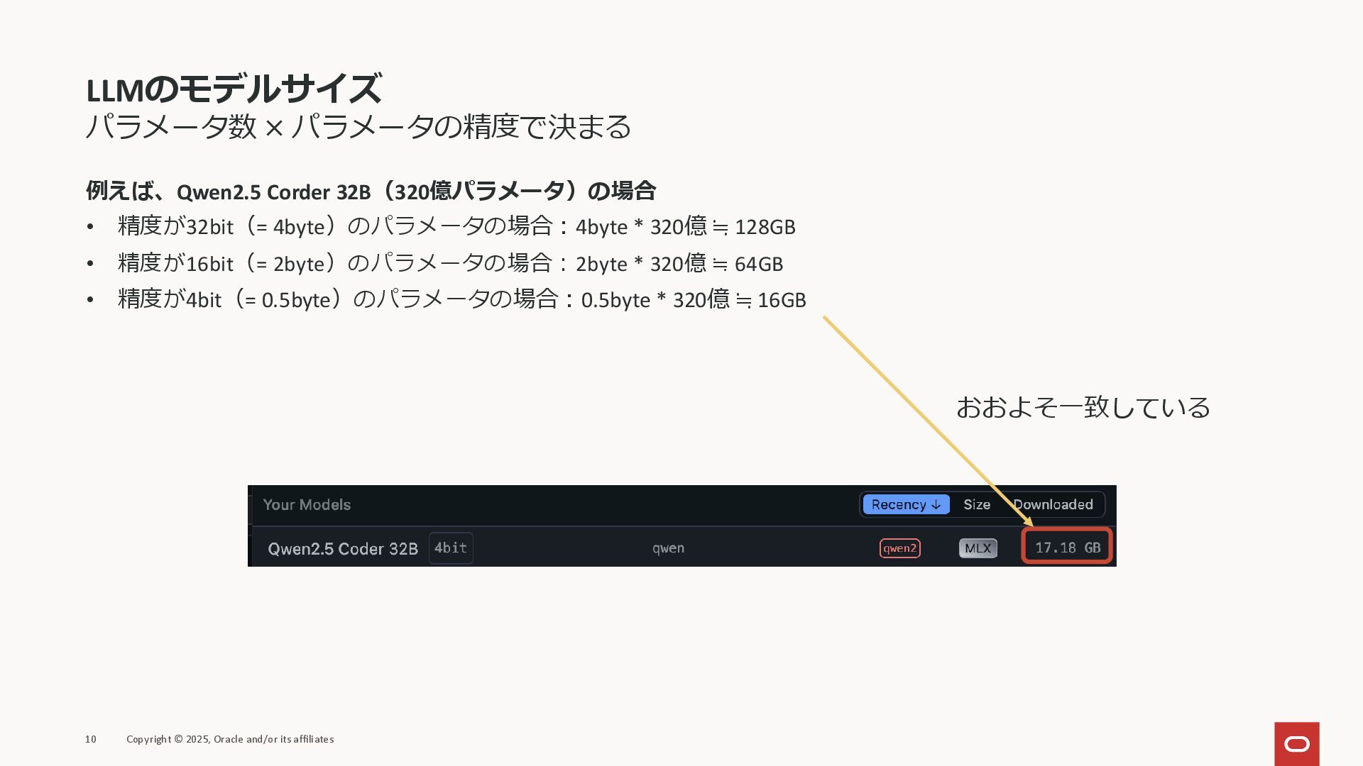 * 320億 ≒ 128GB • 精度が16bit(= 2byte)のパラメータの場合:2byte * 320億 ≒ 64GB • 精度が4bit(= 0.5byte)のパラメータの場合:0.5byte * 320億 ≒ 16GB 10 Copyright © 2025, Oracle and/or its affiliates おおよそ一致している