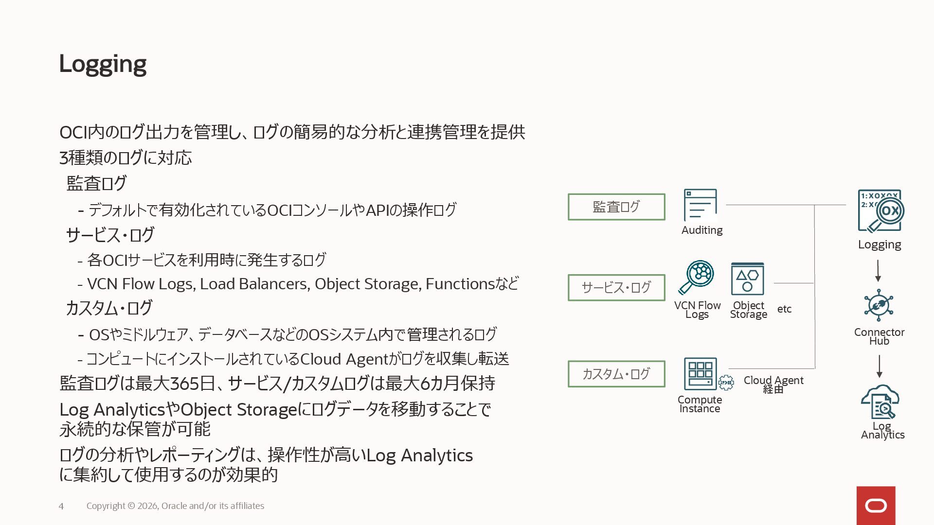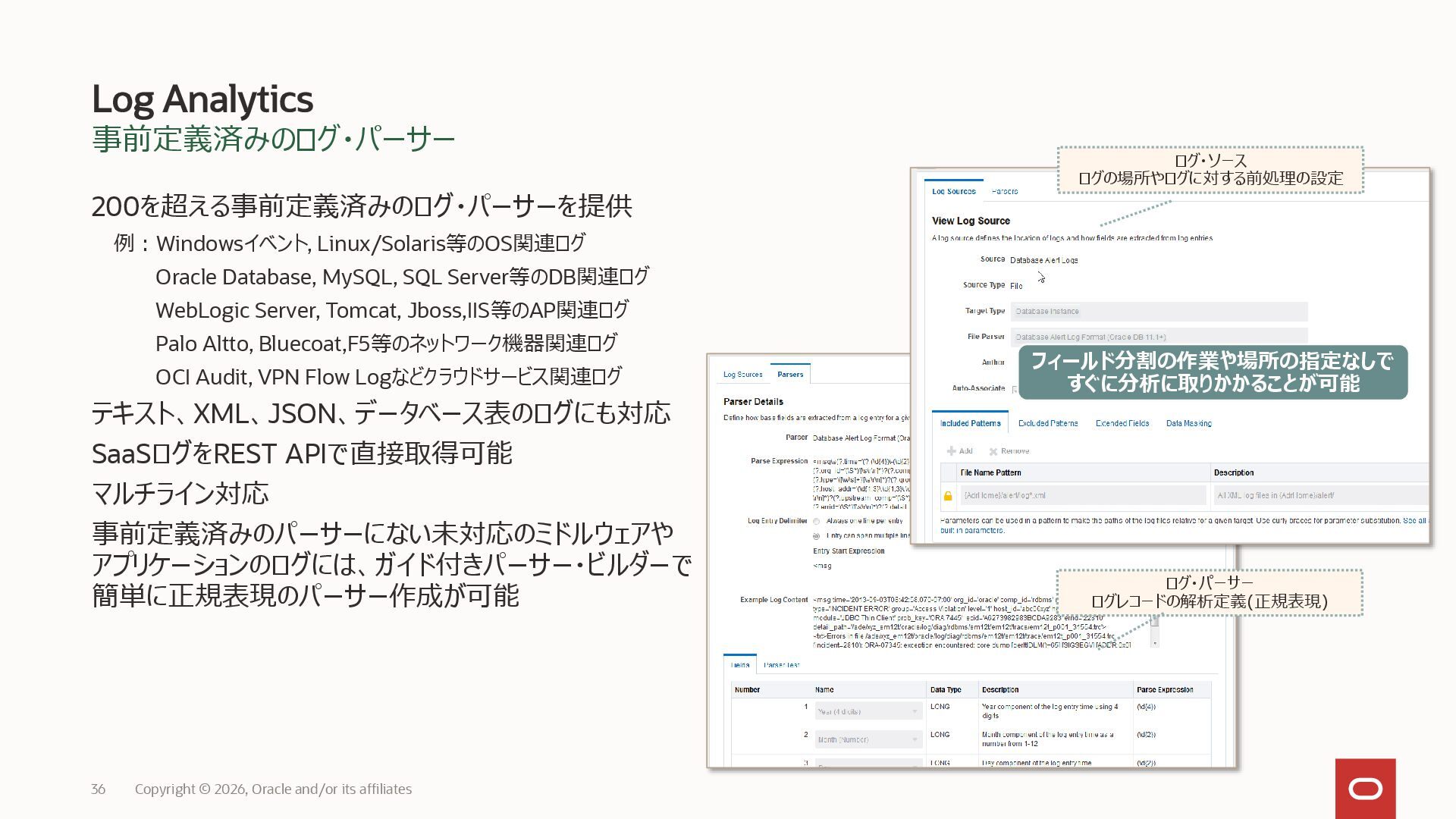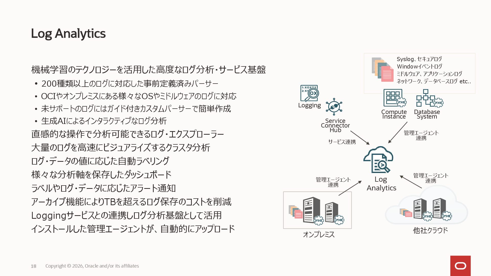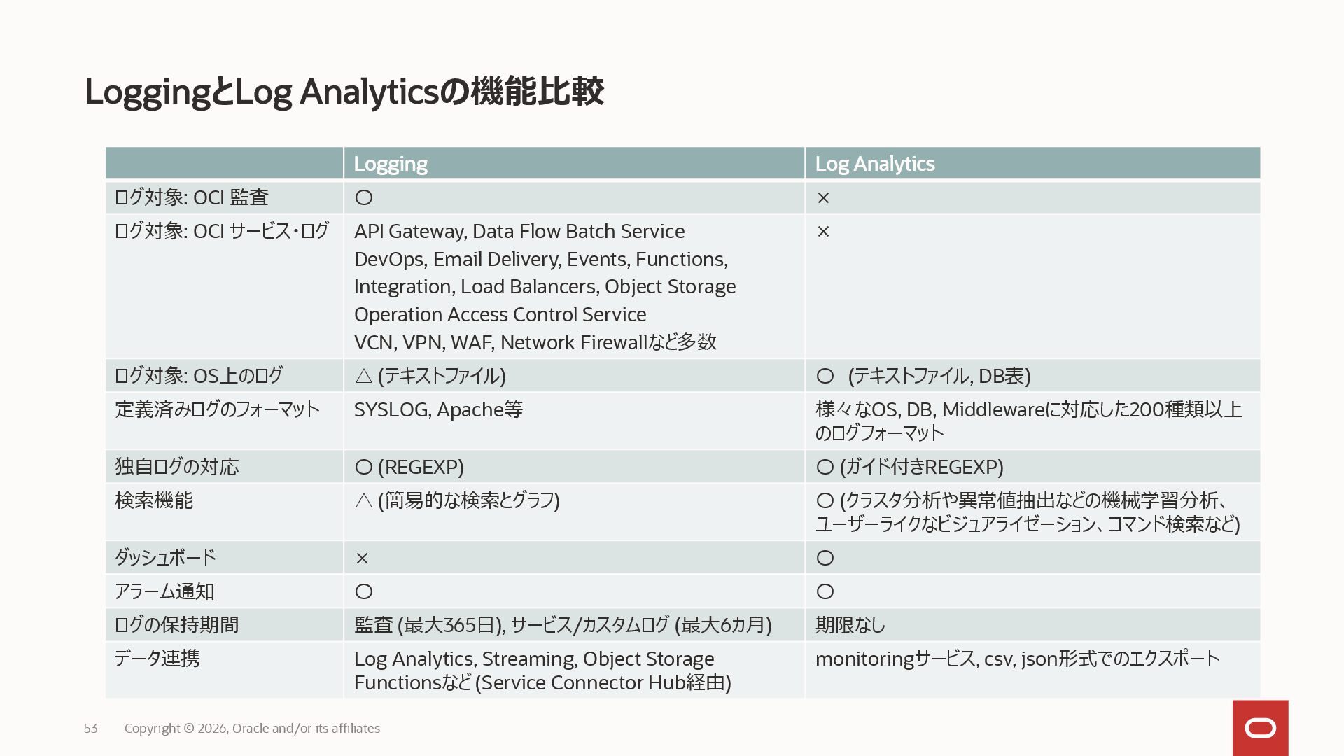 × ログ対象: OCI サービス・ログ API Gateway, Data Flow Batch Service DevOps, Email Delivery, Events, Functions, Integration, Load Balancers, Object Storage Operation Access Control Service VCN, VPN, WAF, Network Firewallなど多数 × ログ対象: OS上のログ △ (テキストファイル) 〇 (テキストファイル, DB表) 定義済みログのフォーマット SYSLOG, Apache等 様々なOS, DB, Middlewareに対応した200種類以上 のログフォーマット 独自ログの対応 〇 (REGEXP) 〇 (ガイド付きREGEXP) 検索機能 △ (簡易的な検索とグラフ) 〇 (クラスタ分析や異常値抽出などの機械学習分析、 ユーザーライクなビジュアライゼーション、コマンド検索など) ダッシュボード × 〇 アラーム通知 〇 〇 ログの保持期間 監査 (最大365日), サービス/カスタムログ (最大6カ月) 期限なし データ連携 Log Analytics, Streaming, Object Storage Functionsなど (Service Connector Hub経由) monitoringサービス, csv, json形式でのエクスポート Copyright © 2026, Oracle and/or its affiliates