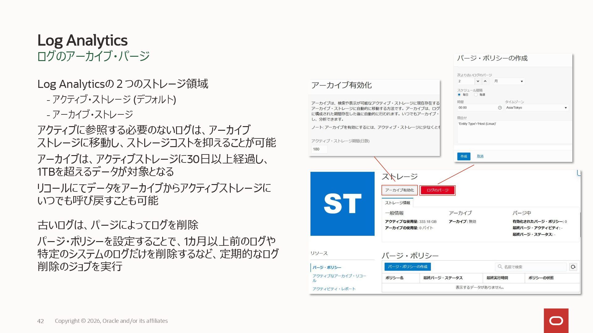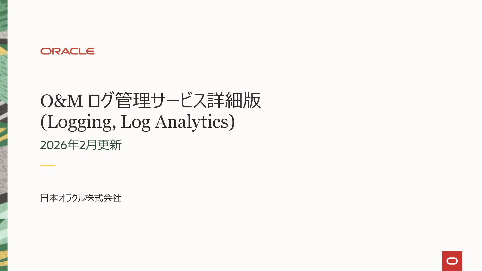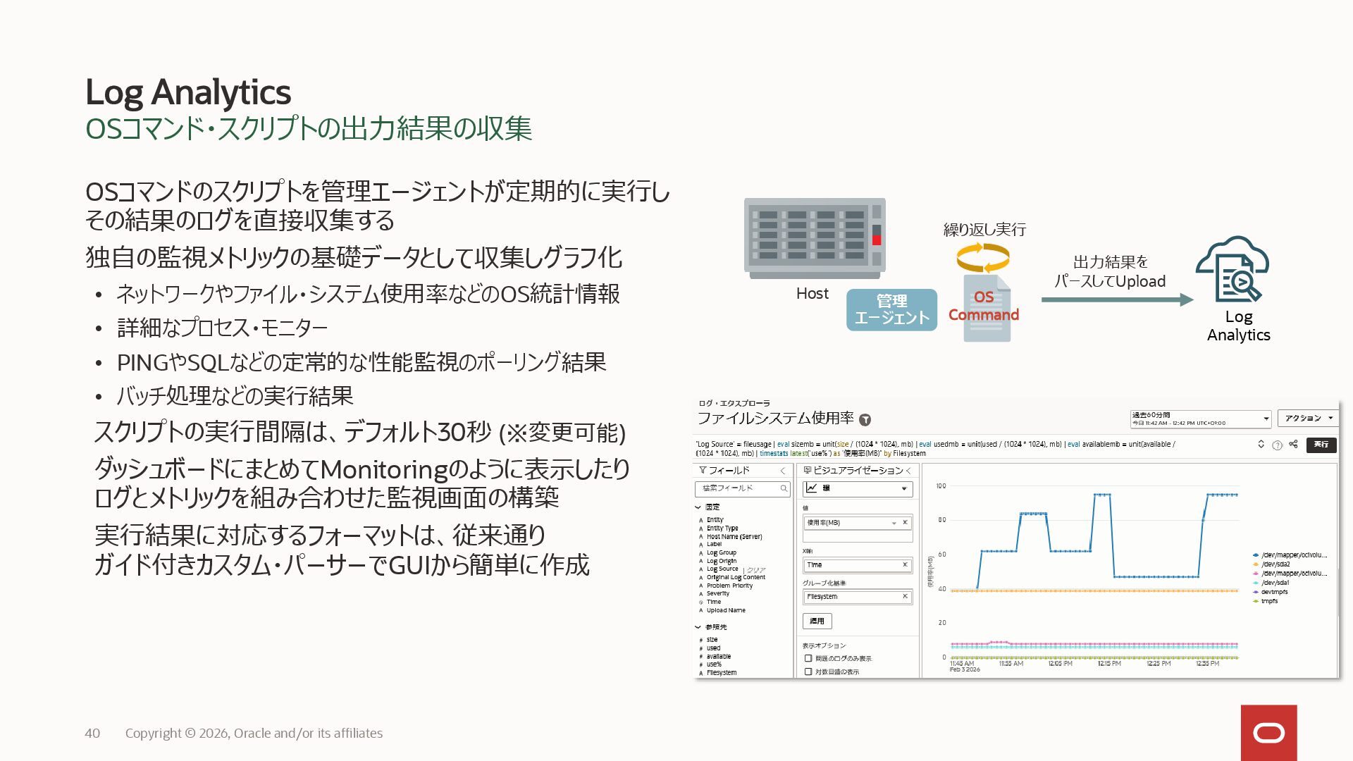 × ログ対象: OCI サービス・ログ API Gateway, Data Flow Batch Service DevOps, Email Delivery, Events, Functions, Integration, Load Balancers, Object Storage Operation Access Control Service VCN, VPN, WAF, Network Firewallなど多数 × ログ対象: OS上のログ △ (テキストファイル) 〇 (テキストファイル, DB表) 定義済みログのフォーマット SYSLOG, Apache等 様々なOS, DB, Middlewareに対応した200種類以上 のログフォーマット 独自ログの対応 〇 (REGEXP) 〇 (ガイド付きREGEXP) 検索機能 △ (簡易的な検索とグラフ) 〇 (クラスタ分析や異常値抽出などの機械学習分析、 ユーザーライクなビジュアライゼーション、コマンド検索など) ダッシュボード × 〇 アラーム通知 〇 〇 ログの保持期間 監査 (最大365日), サービス/カスタムログ (最大6カ月) 期限なし データ連携 Log Analytics, Streaming, Object Storage Functionsなど (Service Connector Hub経由) monitoringサービス, csv, json形式でのエクスポート Copyright © 2026, Oracle and/or its affiliates
