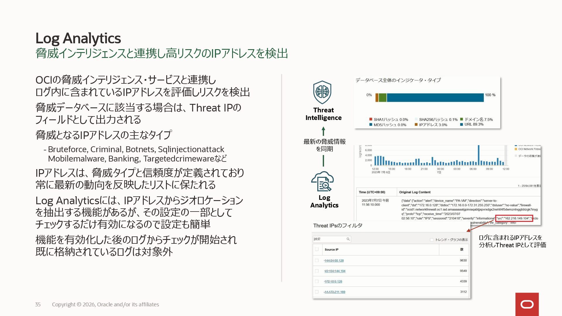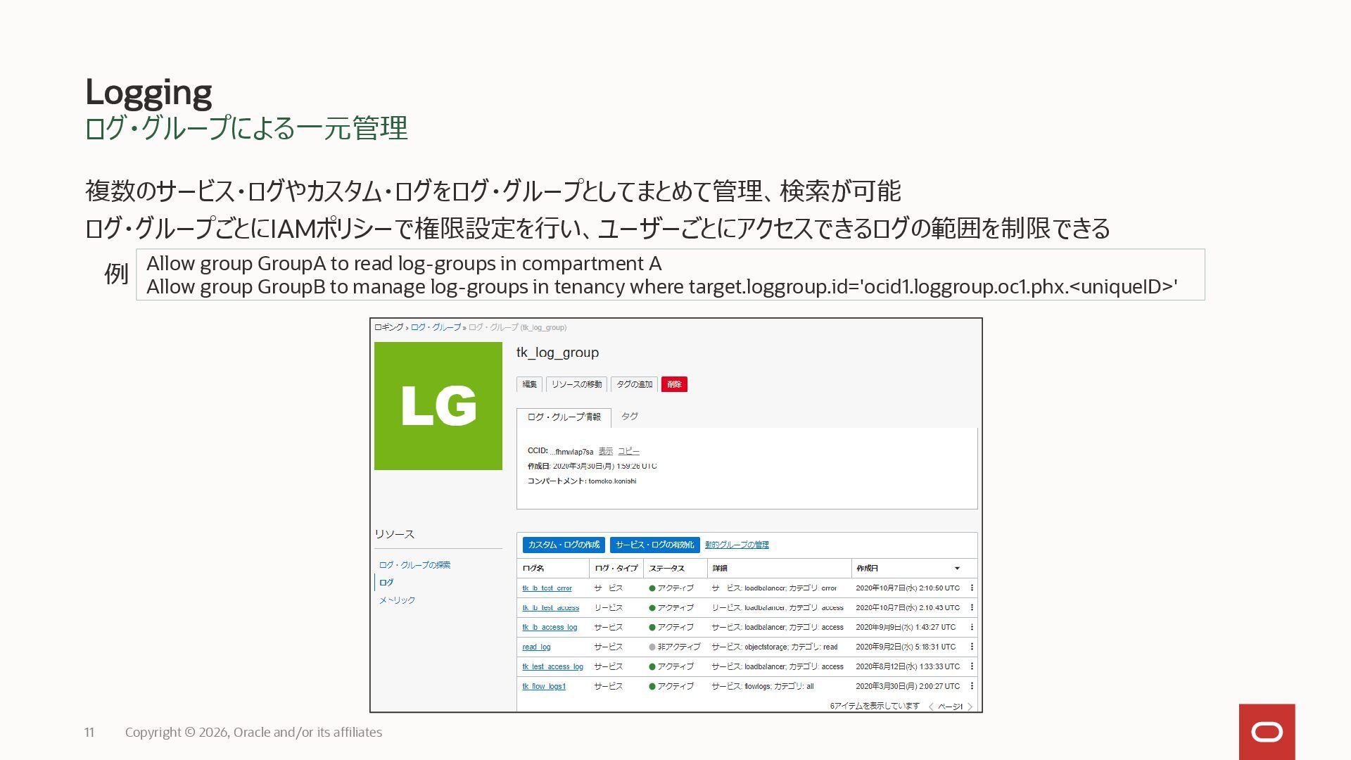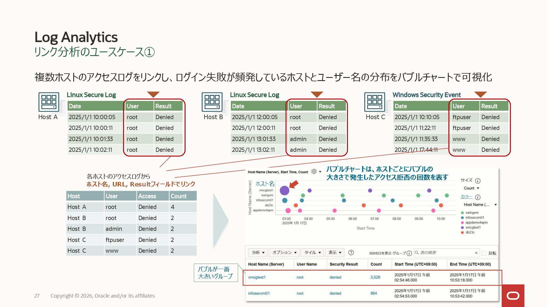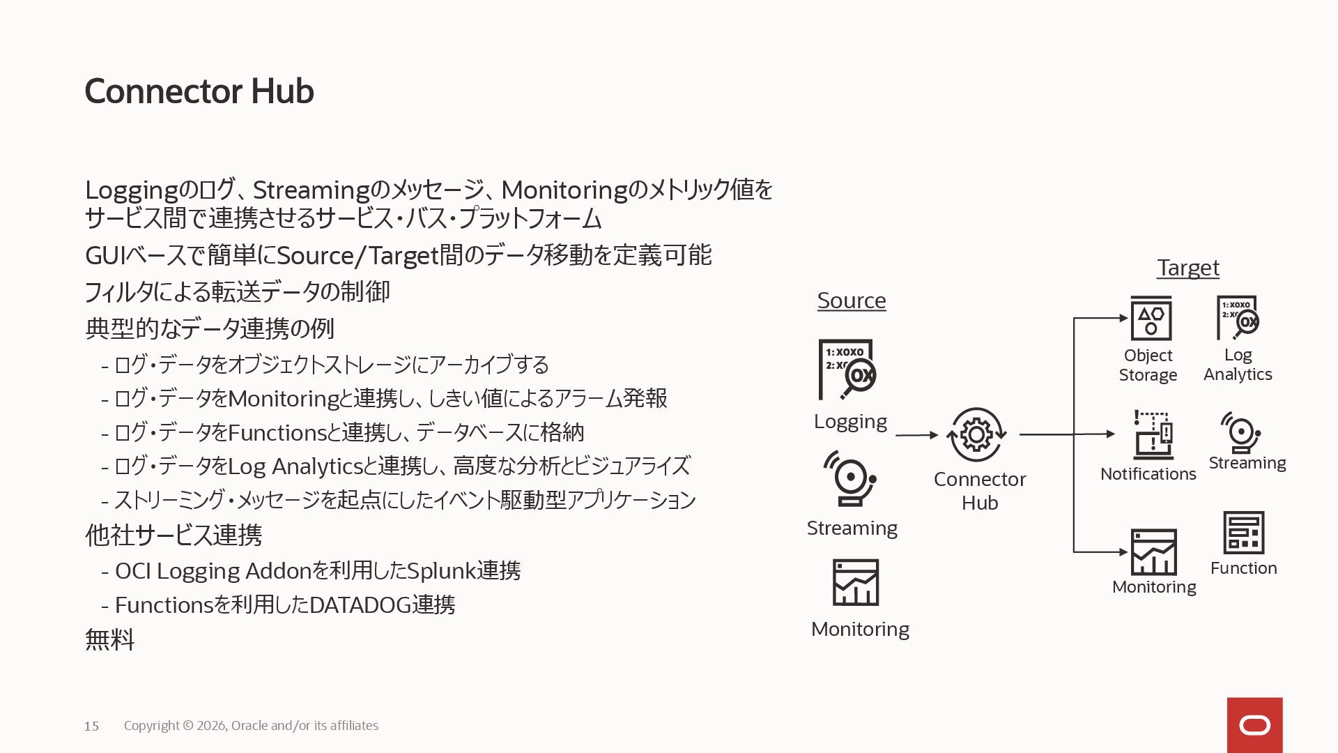 × ログ対象: OCI サービス・ログ API Gateway, Data Flow Batch Service DevOps, Email Delivery, Events, Functions, Integration, Load Balancers, Object Storage Operation Access Control Service VCN, VPN, WAF, Network Firewallなど多数 × ログ対象: OS上のログ △ (テキストファイル) 〇 (テキストファイル, DB表) 定義済みログのフォーマット SYSLOG, Apache等 様々なOS, DB, Middlewareに対応した200種類以上 のログフォーマット 独自ログの対応 〇 (REGEXP) 〇 (ガイド付きREGEXP) 検索機能 △ (簡易的な検索とグラフ) 〇 (クラスタ分析や異常値抽出などの機械学習分析、 ユーザーライクなビジュアライゼーション、コマンド検索など) ダッシュボード × 〇 アラーム通知 〇 〇 ログの保持期間 監査 (最大365日), サービス/カスタムログ (最大6カ月) 期限なし データ連携 Log Analytics, Streaming, Object Storage Functionsなど (Service Connector Hub経由) monitoringサービス, csv, json形式でのエクスポート Copyright © 2026, Oracle and/or its affiliates