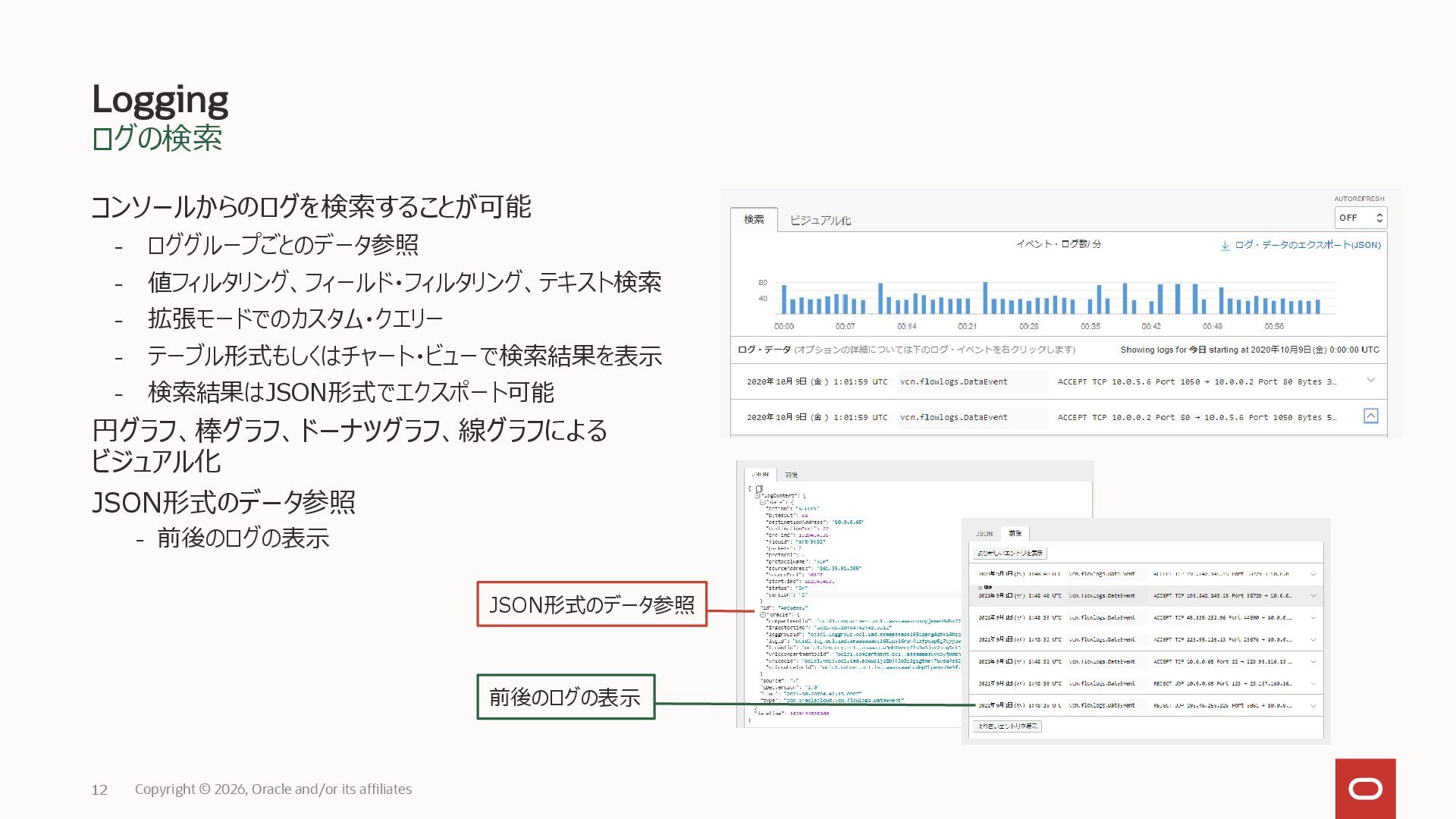 - 検索結果はJSON形式でエクスポート可能 円グラフ、棒グラフ、ドーナツグラフ、線グラフによる ビジュアル化 JSON形式のデータ参照 - 前後のログの表示 Logging 12 JSON形式のデータ参照 前後のログの表示 Copyright © 2026, Oracle and/or its affiliates