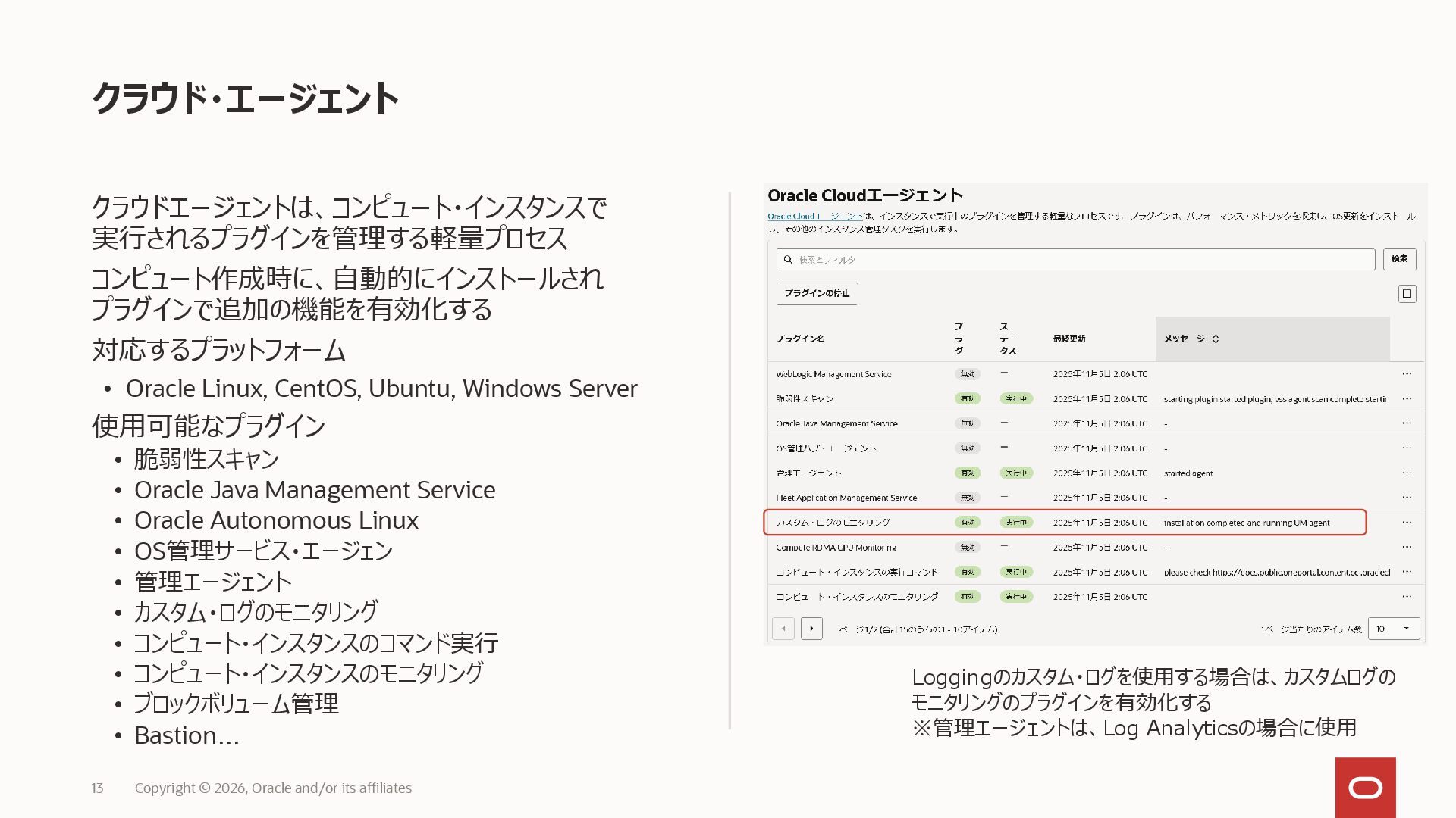 Windows Server 使用可能なプラグイン • 脆弱性スキャン • Oracle Java Management Service • Oracle Autonomous Linux • OS管理サービス・エージェン • 管理エージェント • カスタム・ログのモニタリング • コンピュート・インスタンスのコマンド実行 • コンピュート・インスタンスのモニタリング • ブロックボリューム管理 • Bastion… クラウド・エージェント 13 Loggingのカスタム・ログを使用する場合は、カスタムログの モニタリングのプラグインを有効化する ※管理エージェントは、Log Analyticsの場合に使用 Copyright © 2026, Oracle and/or its affiliates