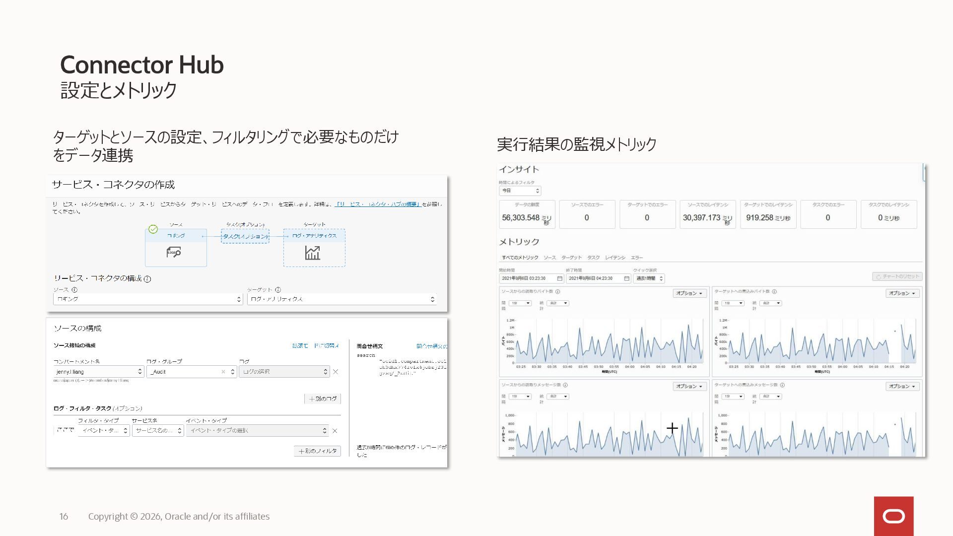 ログ・データをFunctionsと連携し、データベースに格納 - ログ・データをLog Analyticsと連携し、高度な分析とビジュアライズ - ストリーミング・メッセージを起点にしたイベント駆動型アプリケーション 他社サービス連携 - OCI Logging Addonを利用したSplunk連携 - Functionsを利用したDATADOG連携 無料 Connector Hub 15 Logging Connector Hub Monitoring Log Analytics Notifications Function Streaming Source Object Storage Streaming Target Monitoring Copyright © 2026, Oracle and/or its affiliates