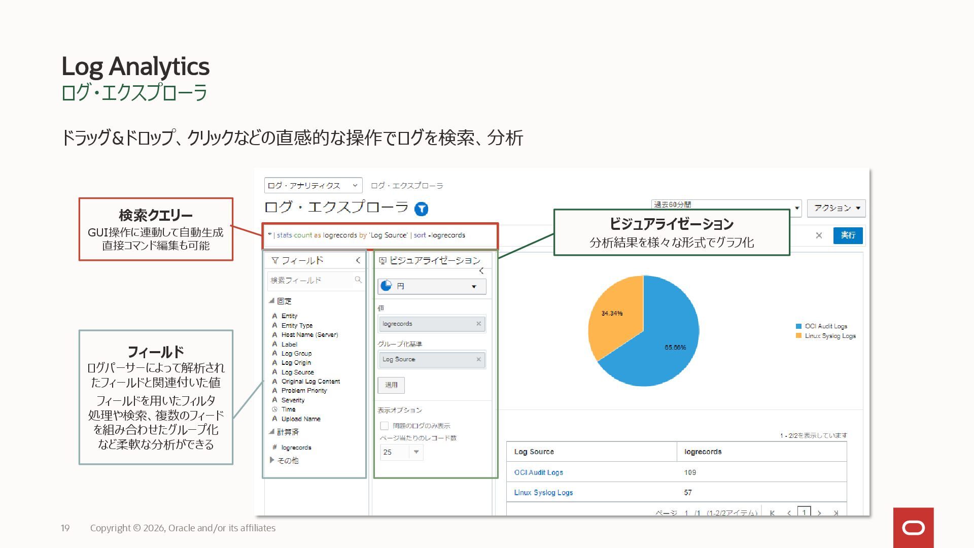 たフィールドと関連付いた値 フィールドを用いたフィルタ 処理や検索、複数のフィード を組み合わせたグループ化 など柔軟な分析ができる ビジュアライゼーション 分析結果を様々な形式でグラフ化 Copyright © 2026, Oracle and/or its affiliates