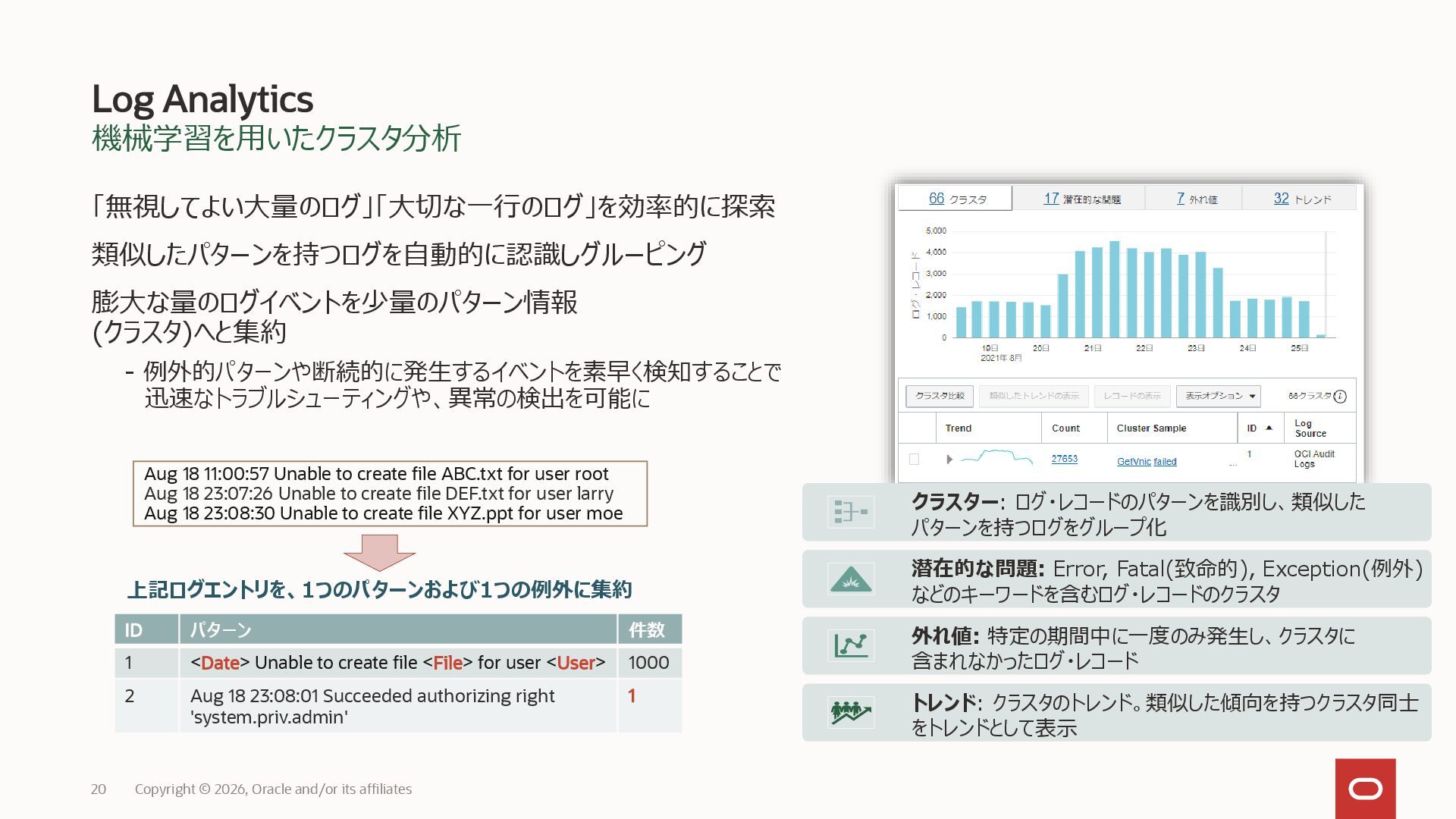 20 クラスター: ログ・レコードのパターンを識別し、類似した パターンを持つログをグループ化 潜在的な問題: Error, Fatal(致命的), Exception(例外) などのキーワードを含むログ・レコードのクラスタ 外れ値: 特定の期間中に一度のみ発生し、クラスタに 含まれなかったログ・レコード トレンド: クラスタのトレンド。類似した傾向を持つクラスタ同士 をトレンドとして表示 Aug 18 11:00:57 Unable to create file ABC.txt for user root Aug 18 23:07:26 Unable to create file DEF.txt for user larry Aug 18 23:08:30 Unable to create file XYZ.ppt for user moe 上記ログエントリを、1つのパターンおよび1つの例外に集約 ID パターン 件数 1 <Date> Unable to create file <File> for user <User> 1000 2 Aug 18 23:08:01 Succeeded authorizing right 'system.priv.admin' 1 Copyright © 2026, Oracle and/or its affiliates