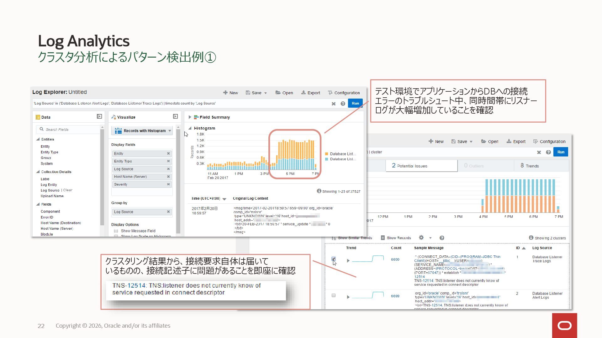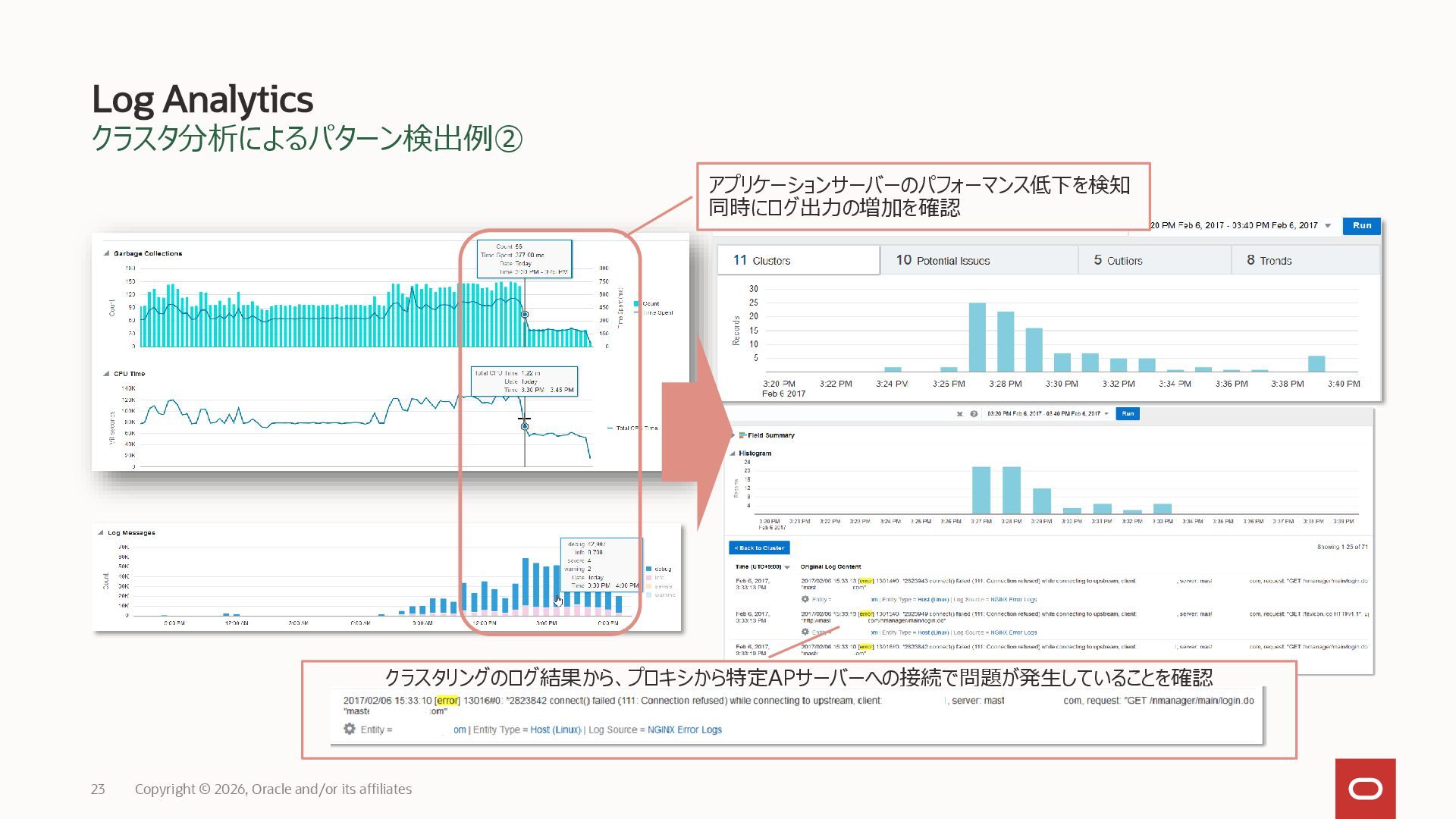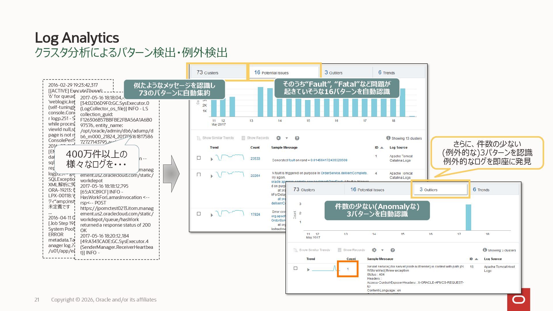 for queue: 'weblogic.kernel.Default (self-tuning)'] ERROR console.ConsolePerfCollecto r logp.251 - Session Expired while processing page with viewId null,so tracing for the page is not recorded. ConsolePerfTraceData is... 2016-03-11 17:10:08,130 [EMUI_17_10_08_/console/ database/instance/orarep/ sqlmonitor/list] ERROR reports.ReportXmlBean logp.251 - getReportXML SQLException: ORA-31011: XML解析に失敗しました ORA-19213: 行 1 LPX-00118: Warning: エンティ ティ“amp;inst_id=1&amp”が 未定義です ... 2016-04-11 04:30:10,069 [Job Step 19871 Job Long- System Pool:JobWorker] ERROR metadata.TargetMetadataM anager log.? - /u01/app/em/oracle_ 2017-05-16 18:18:04,464 [34:D2D6D9F0:GC.SysExecutor.0 (LogCollector_os_file)] INFO - LS collection_guid: F126306B57BBFBE2FBA56A1A6B0 97576, entity_name: /opt/oracle/admin/db6/adump/d b6_m000_21824_201705161817586 72727143795.aud 2017-05-16 18:18:12,182 [65:A1C89CF] INFO - HasWorkForLamasInvocation -- >req--> https://jpomctest0213.itom.manag ement.us2.oraclecloud.com/static/ workdepot 2017-05-16 18:18:12,795 [65:A1C89CF] INFO - HasWorkForLamasInvocation <-- rsp<-- POST https://jpomctest0213.itom.manag ement.us2.oraclecloud.com/static/ workdepot/queue/hasWork returned a response status of 200 OK 2017-05-16 18:20:12,184 [49:A343CA0E:GC.SysExecutor.4 (SenderManager.ReceiverHeartbea t)] INFO - 400万件以上の 様々なログを・・・ さらに、件数の少ない (例外的な)3パターンを認識 例外的なログを即座に発見 似たようなメッセージを認識し 73のパターンに自動集約 そのうち“Fault”, “Fatal”など問題が 起きていそうな16パターンを自動認識 件数の少ない(Anomalyな) 3パターンを自動認識 Copyright © 2026, Oracle and/or its affiliates