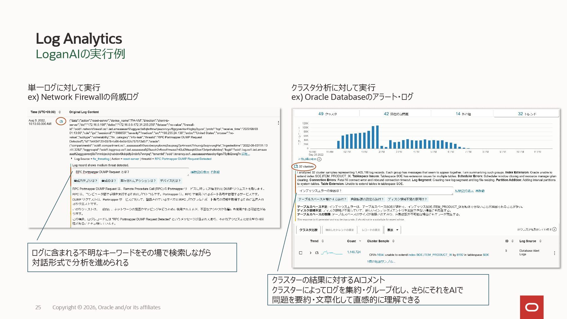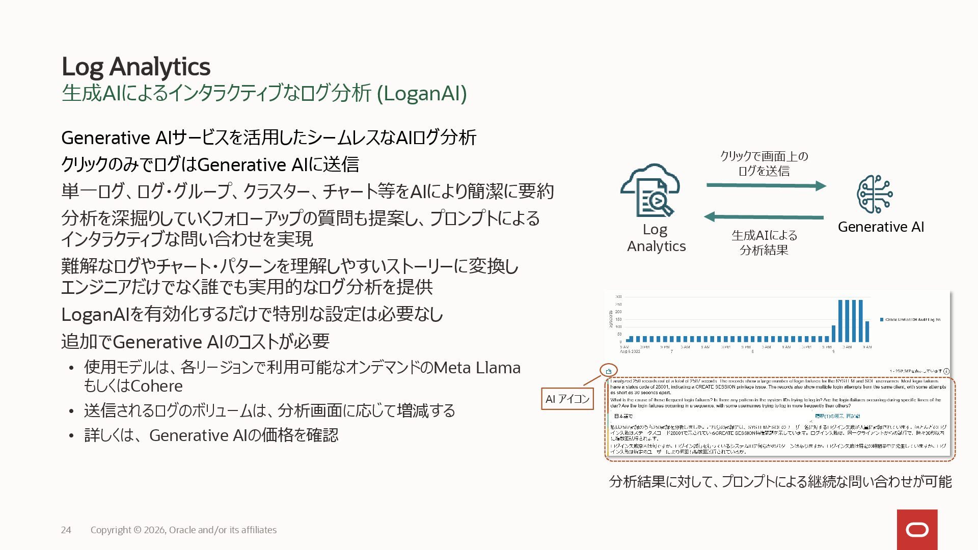 エンジニアだけでなく誰でも実用的なログ分析を提供 LoganAIを有効化するだけで特別な設定は必要なし 追加でGenerative AIのコストが必要 • 使用モデルは、各リージョンで利用可能なオンデマンドのMeta Llama もしくはCohere • 送信されるログのボリュームは、分析画面に応じて増減する • 詳しくは、 Generative AIの価格を確認 Log Analytics Copyright © 2026, Oracle and/or its affiliates 24 Generative AI Log Analytics クリックで画面上の ログを送信 生成AIによる 分析結果 分析結果に対して、プロンプトによる継続な問い合わせが可能 AI アイコン