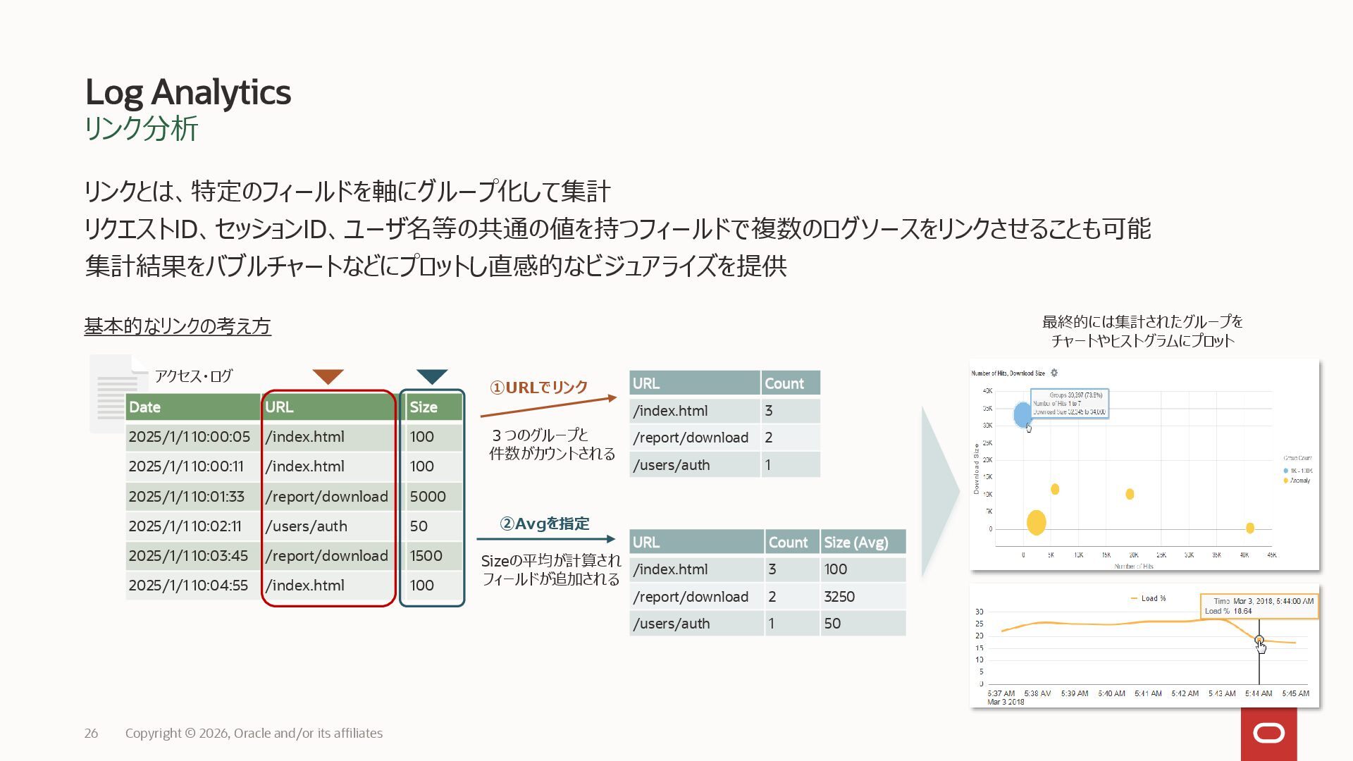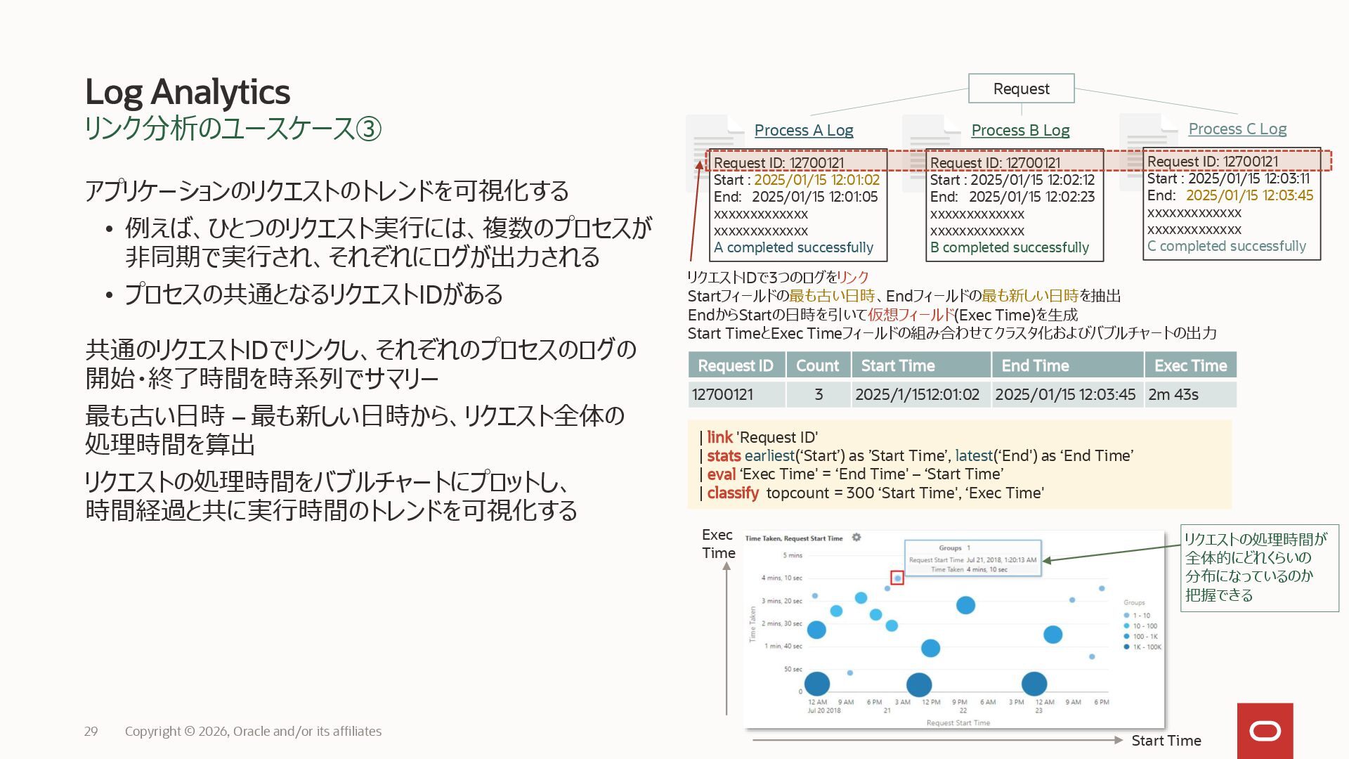 – 最も新しい日時から、リクエスト全体の 処理時間を算出 リクエストの処理時間をバブルチャートにプロットし、 時間経過と共に実行時間のトレンドを可視化する Log Analytics Copyright © 2026, Oracle and/or its affiliates 29 Request ID: 12700121 Start : 2025/01/15 12:01:02 End: 2025/01/15 12:01:05 xxxxxxxxxxxxx xxxxxxxxxxxxx A completed successfully Process A Log Request ID: 12700121 Start : 2025/01/15 12:02:12 End: 2025/01/15 12:02:23 xxxxxxxxxxxxx xxxxxxxxxxxxx B completed successfully Process B Log Request ID: 12700121 Start : 2025/01/15 12:03:11 End: 2025/01/15 12:03:45 xxxxxxxxxxxxx xxxxxxxxxxxxx C completed successfully Process C Log リクエストIDで3つのログをリンク Startフィールドの最も古い日時、Endフィールドの最も新しい日時を抽出 EndからStartの日時を引いて仮想フィールド(Exec Time)を生成 Start TimeとExec Timeフィールドの組み合わせてクラスタ化およびバブルチャートの出力 Request ID Count Start Time End Time Exec Time 12700121 3 2025/1/1512:01:02 2025/01/15 12:03:45 2m 43s | link 'Request ID' | stats earliest(‘Start’) as ’Start Time’, latest(‘End') as ‘End Time’ | eval ‘Exec Time' = ‘End Time' – ‘Start Time’ | classify topcount = 300 ‘Start Time', ‘Exec Time' Start Time Exec Time リクエストの処理時間が 全体的にどれくらいの 分布になっているのか 把握できる Request