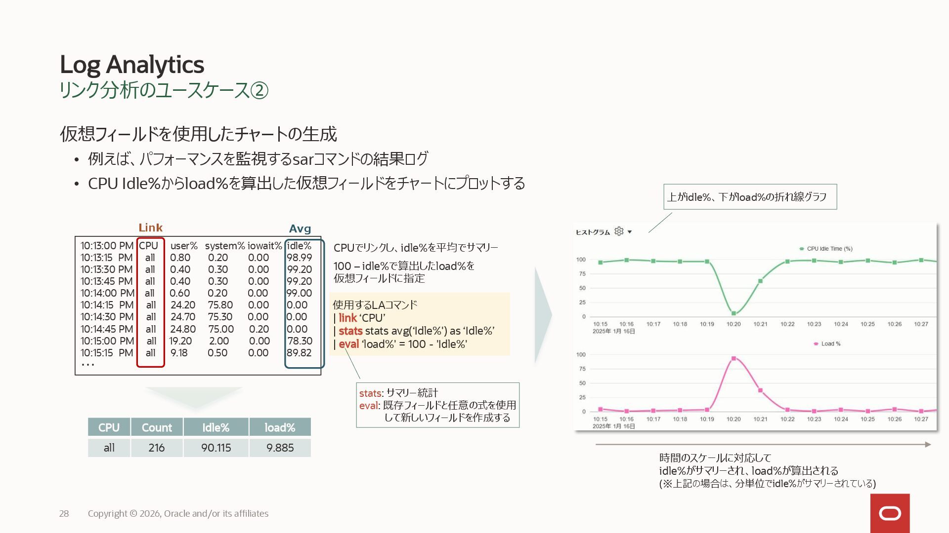 © 2026, Oracle and/or its affiliates 28 10:13:00 PM CPU user% system% iowait% idle% 10:13:15 PM all 0.80 0.20 0.00 98.99 10:13:30 PM all 0.40 0.30 0.00 99.20 10:13:45 PM all 0.40 0.30 0.00 99.20 10:14:00 PM all 0.60 0.20 0.00 99.00 10:14:15 PM all 24.20 75.80 0.00 0.00 10:14:30 PM all 24.70 75.30 0.00 0.00 10:14:45 PM all 24.80 75.00 0.20 0.00 10:15:00 PM all 19.20 2.00 0.00 78.30 10:15:15 PM all 9.18 0.50 0.00 89.82 ・・・ Link Avg CPU Count Idle% load% all 216 90.115 9.885 使用するLAコマンド | link ‘CPU’ | stats stats avg(‘Idle%') as ‘Idle%’ | eval ‘load%' = 100 - 'Idle%' CPUでリンクし、idle%を平均でサマリー 100 – idle%で算出したload%を 仮想フィールドに指定 stats: サマリー統計 eval: 既存フィールドと任意の式を使用 して新しいフィールドを作成する 時間のスケールに対応して idle%がサマリーされ、load%が算出される (※上記の場合は、分単位でidle%がサマリーされている) 上がidle%、下がload%の折れ線グラフ