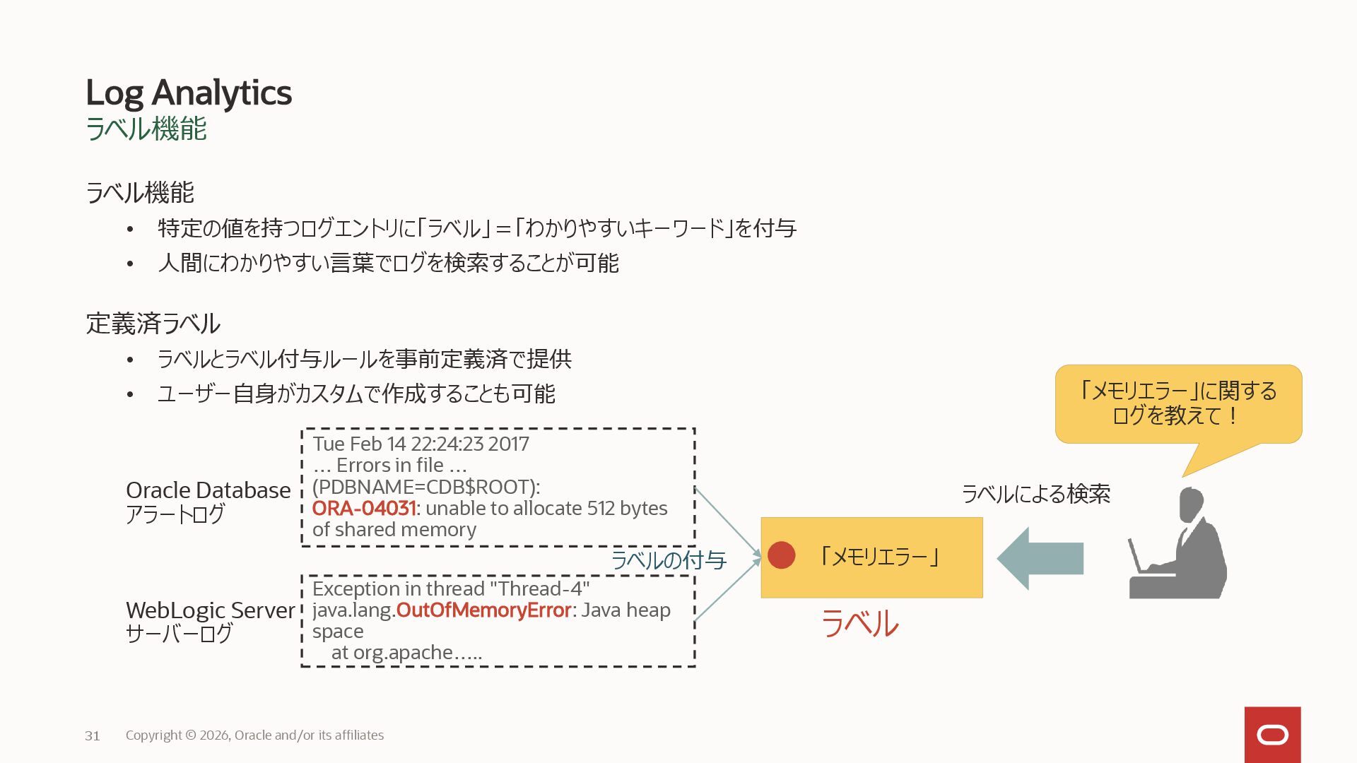ユーザー自身がカスタムで作成することも可能 Log Analytics 31 Tue Feb 14 22:24:23 2017 … Errors in file … (PDBNAME=CDB$ROOT): ORA-04031: unable to allocate 512 bytes of shared memory Exception in thread "Thread-4" java.lang.OutOfMemoryError: Java heap space at org.apache….. 「メモリエラー」 Oracle Database アラートログ WebLogic Server サーバーログ ラベル ラベルの付与 ラベルによる検索 「メモリエラー」に関する ログを教えて! Copyright © 2026, Oracle and/or its affiliates