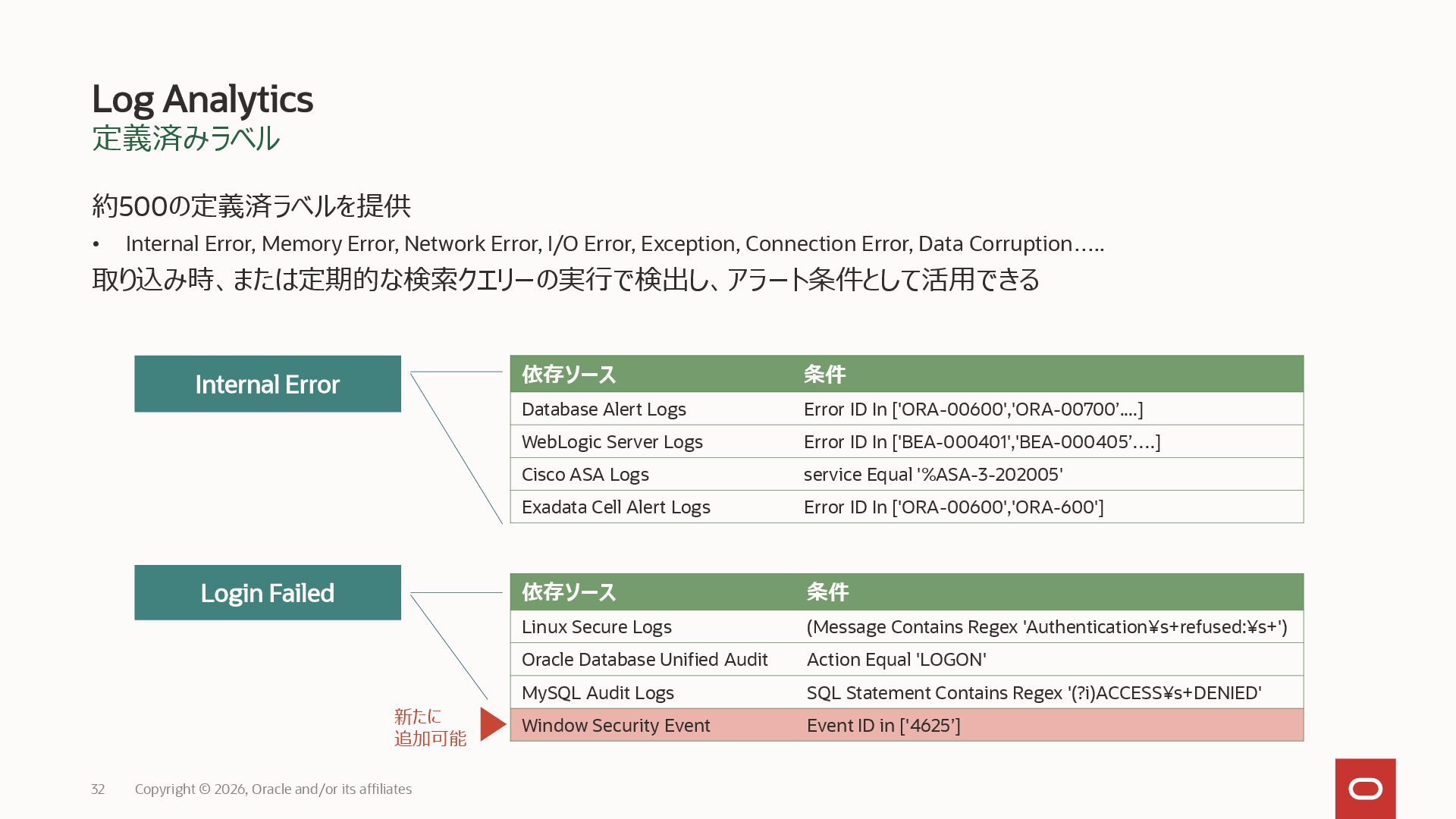 Error, Exception, Connection Error, Data Corruption….. 取り込み時、または定期的な検索クエリーの実行で検出し、アラート条件として活用できる Log Analytics Copyright © 2026, Oracle and/or its affiliates 32 Internal Error 依存ソース 条件 Database Alert Logs Error ID In ['ORA-00600','ORA-00700’....] WebLogic Server Logs Error ID In ['BEA-000401','BEA-000405’….] Cisco ASA Logs service Equal '%ASA-3-202005' Exadata Cell Alert Logs Error ID In ['ORA-00600','ORA-600'] Login Failed 依存ソース 条件 Linux Secure Logs (Message Contains Regex 'Authentication¥s+refused:¥s+') Oracle Database Unified Audit Action Equal 'LOGON' MySQL Audit Logs SQL Statement Contains Regex '(?i)ACCESS¥s+DENIED' Window Security Event Event ID in ['4625’] 新たに 追加可能