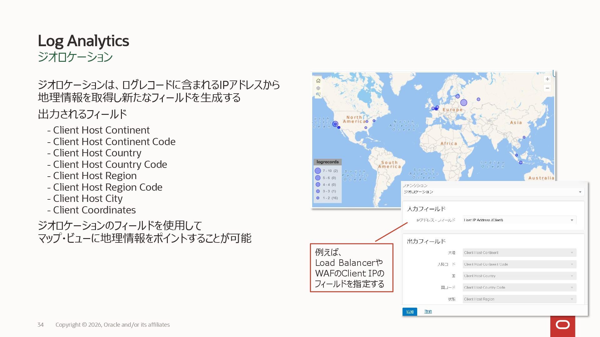 Host Continent Code - Client Host Country - Client Host Country Code - Client Host Region - Client Host Region Code - Client Host City - Client Coordinates ジオロケーションのフィールドを使用して マップ・ビューに地理情報をポイントすることが可能 Log Analytics 34 例えば、 Load Balancerや WAFのClient IPの フィールドを指定する Copyright © 2026, Oracle and/or its affiliates