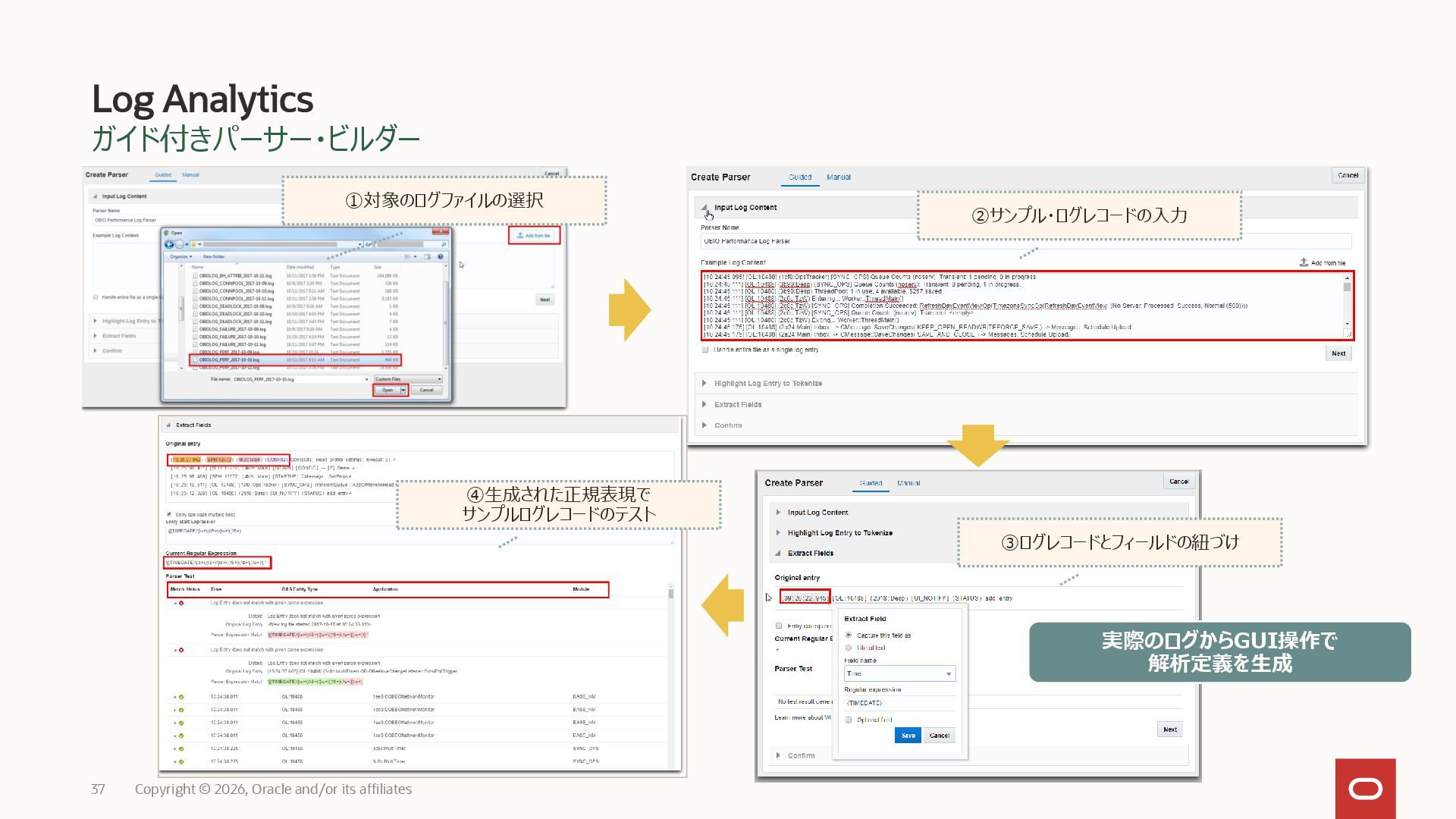 Server, Tomcat, Jboss,IIS等のAP関連ログ Palo Altto, Bluecoat,F5等のネットワーク機器関連ログ OCI Audit, VPN Flow Logなどクラウドサービス関連ログ テキスト、XML、JSON、データベース表のログにも対応 SaaSログをREST APIで直接取得可能 マルチライン対応 事前定義済みのパーサーにない未対応のミドルウェアや アプリケーションのログには、ガイド付きパーサー・ビルダーで 簡単に正規表現のパーサー作成が可能 Log Analytics 36 フィールド分割の作業や場所の指定なしで すぐに分析に取りかかることが可能 ログ・パーサー ログレコードの解析定義(正規表現) ログ・ソース ログの場所やログに対する前処理の設定 Copyright © 2026, Oracle and/or its affiliates