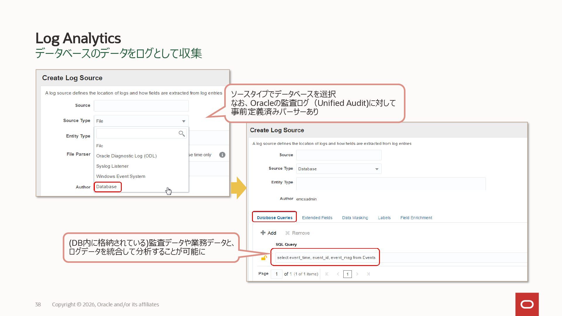 36. データベース関連のログ収集 Log Analytics Copyright © 2026, Oracle and/or its affiliates
