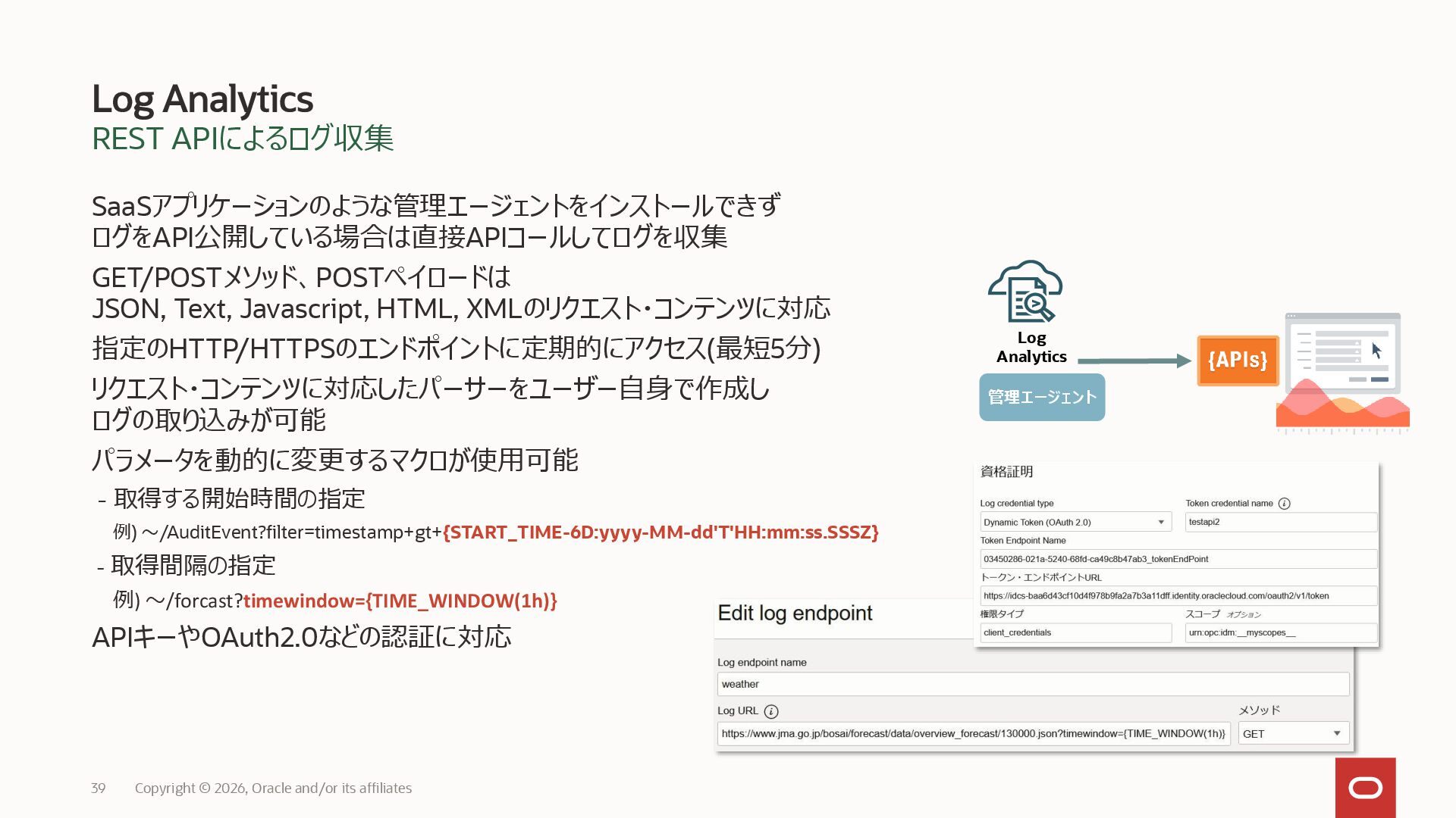 指定のHTTP/HTTPSのエンドポイントに定期的にアクセス(最短5分) リクエスト・コンテンツに対応したパーサーをユーザー自身で作成し ログの取り込みが可能 パラメータを動的に変更するマクロが使用可能 - 取得する開始時間の指定 例) ~/AuditEvent?filter=timestamp+gt+{START_TIME-6D:yyyy-MM-dd'T'HH:mm:ss.SSSZ} - 取得間隔の指定 例) ~/forcast?timewindow={TIME_WINDOW(1h)} APIキーやOAuth2.0などの認証に対応 Log Analytics Copyright © 2026, Oracle and/or its affiliates 39 Log Analytics 管理エージェント