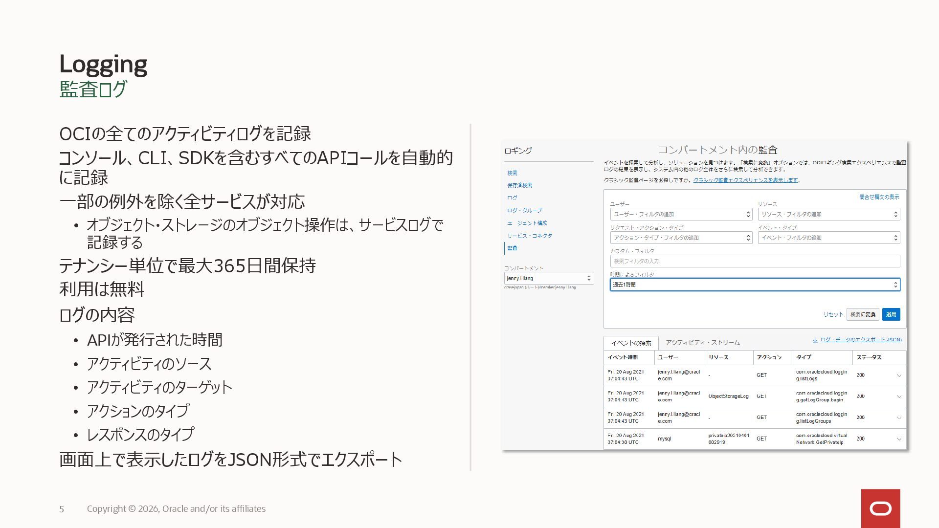 Flow Logs, Load Balancers, Object Storage, Functionsなど カスタム・ログ - OSやミドルウェア、データベースなどのOSシステム内で管理されるログ - コンピュートにインストールされているCloud Agentがログを収集し転送 監査ログは最大365日、サービス/カスタムログは最大6カ月保持 Log AnalyticsやObject Storageにログデータを移動することで 永続的な保管が可能 ログの分析やレポーティングは、操作性が高いLog Analytics に集約して使用するのが効果的 Logging 4 Logging Auditing Object Storage VCN Flow Logs 監査ログ サービス・ログ カスタム・ログ Compute Instance Cloud Agent 経由 etc Connector Hub Log Analytics Copyright © 2026, Oracle and/or its affiliates