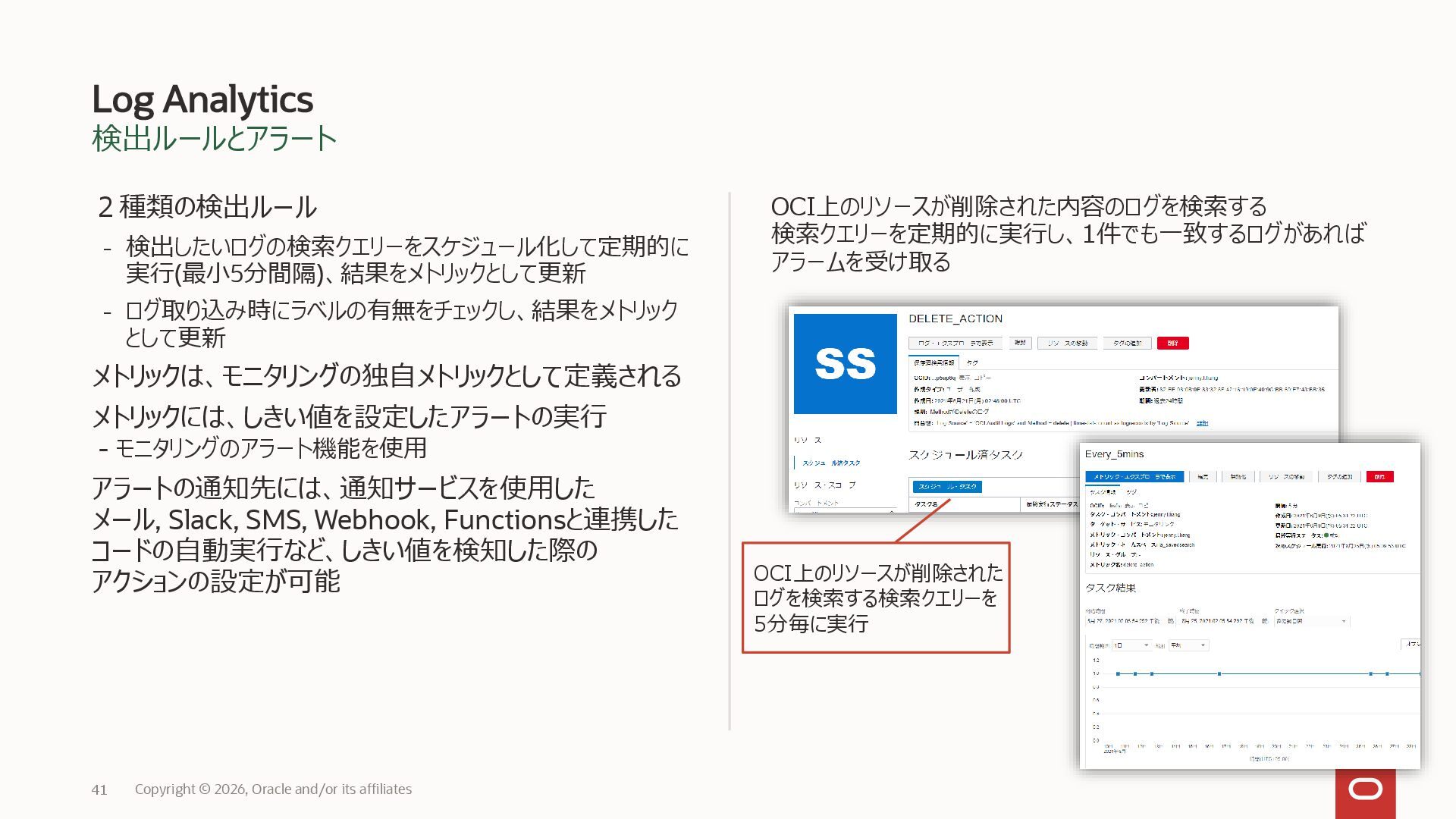 - モニタリングのアラート機能を使用 アラートの通知先には、通知サービスを使用した メール, Slack, SMS, Webhook, Functionsと連携した コードの自動実行など、しきい値を検知した際の アクションの設定が可能 OCI上のリソースが削除された内容のログを検索する 検索クエリーを定期的に実行し、1件でも一致するログがあれば アラームを受け取る Log Analytics 41 OCI上のリソースが削除された ログを検索する検索クエリーを 5分毎に実行 Copyright © 2026, Oracle and/or its affiliates