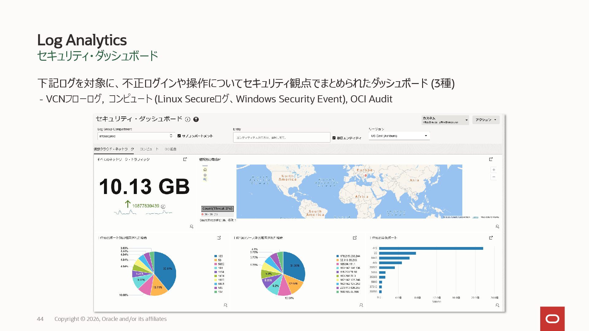 Integration (所要時間、ヘルス、主要なメトリック • OCI Audit、VCNフロー・ログ、APIゲートウェイ、OKEクラスタ, VCN 期間指定でダッシュボード内の全アイテムの一括リフレッシュ ログ・エクスプローラーの画面に遷移し、さらに詳細な 分析を行うことも可能 ダッシュボードの定義をエクスポートし、異なるリージョンや テナントにインポート可能 43 ダッシュボード Log Analytics Copyright © 2026, Oracle and/or its affiliates
