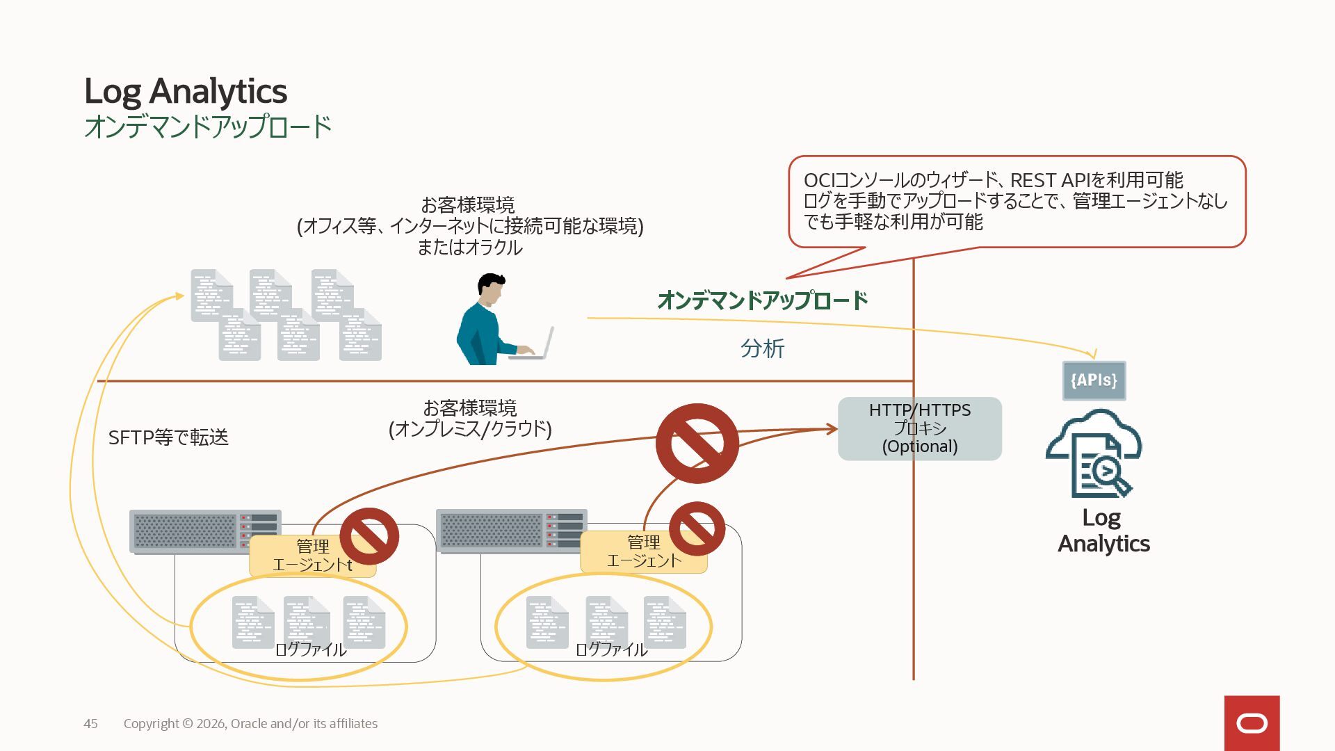 (オンプレミス/クラウド) オンデマンドアップロード 分析 管理 エージェント お客様環境 (オフィス等、インターネットに接続可能な環境) またはオラクル SFTP等で転送 ログファイル ログファイル OCIコンソールのウィザード、REST APIを利用可能 ログを手動でアップロードすることで、管理エージェントなし でも手軽な利用が可能 Log Analytics Copyright © 2026, Oracle and/or its affiliates