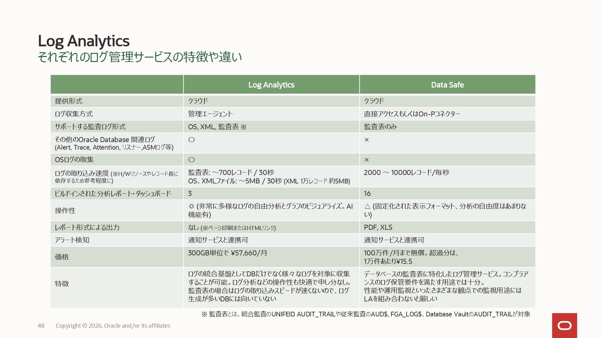 48 Log Analytics Data Safe 提供形式 クラウド クラウド ログ収集方式 管理エージェント 直接アクセスもしくはOn-Pコネクター サポートする監査ログ形式 OS, XML, 監査表 ※ 監査表のみ その他のOracle Database 関連ログ (Alert, Trace, Attention, リスナー,ASMログ等) 〇 × OSログの取集 〇 × ログの取り込み速度 (※H/Wリソースやレコード長に 依存するため参考程度に) 監査表: ~700レコード / 30秒 OS、XMLファイル: ~5MB / 30秒 (XML 1万レコード 約5MB) 2000 ~ 10000レコード/毎秒 ビルドインされた分析レポート・ダッシュボード 3 16 操作性 ◎ (非常に多様なログの自由分析とグラフのビジュアライズ。AI 機能有) △ (固定化された表示フォーマット、分析の自由度はあまりな い) レポート形式による出力 なし (※ページ印刷またはHTMLリンク) PDF, XLS アラート検知 通知サービスと連携可 通知サービスと連携可 価格 300GB単位で ¥57,660/月 100万件/月まで無償。超過分は、 1万件あたり¥15.5 特徴 ログの統合基盤としてDBだけでなく様々なログを対象に収集 することが可能。ログ分析などの操作性も快適で申し分なし。 監査表の場合はログの取り込みスピードが速くないので、ログ 生成が多いDBには向いていない データベースの監査表に特化したログ管理サービス。コンプラア ンスのログ保管要件を満たす用途では十分。 性能や運用監視といったさまざまな観点での監視用途には LAを組み合わないと厳しい ※ 監査表とは、統合監査のUNIFEID AUDIT_TRAILや従来監査のAUD$, FGA_LOG$、Database VaultのAUDIT_TRAILが対象