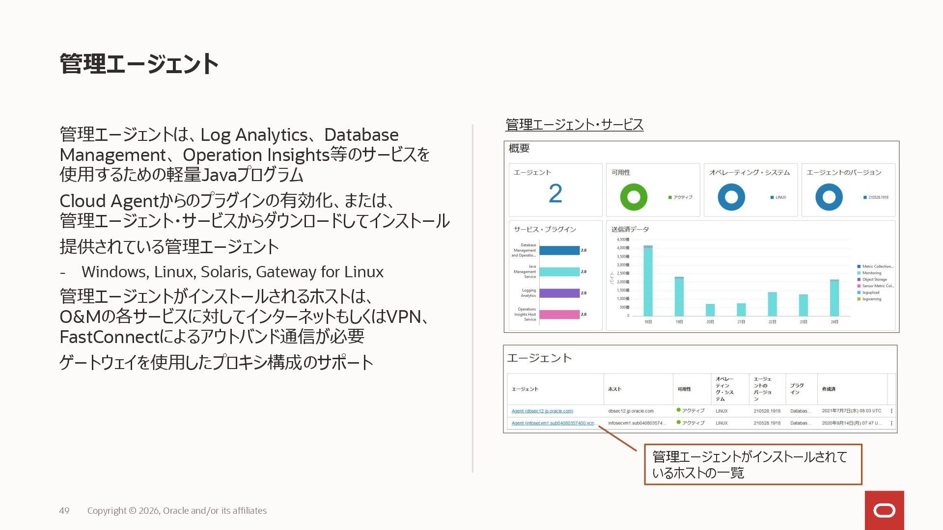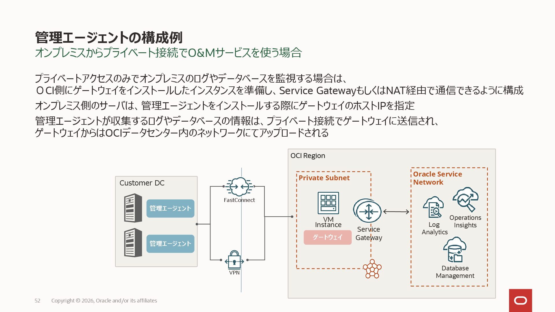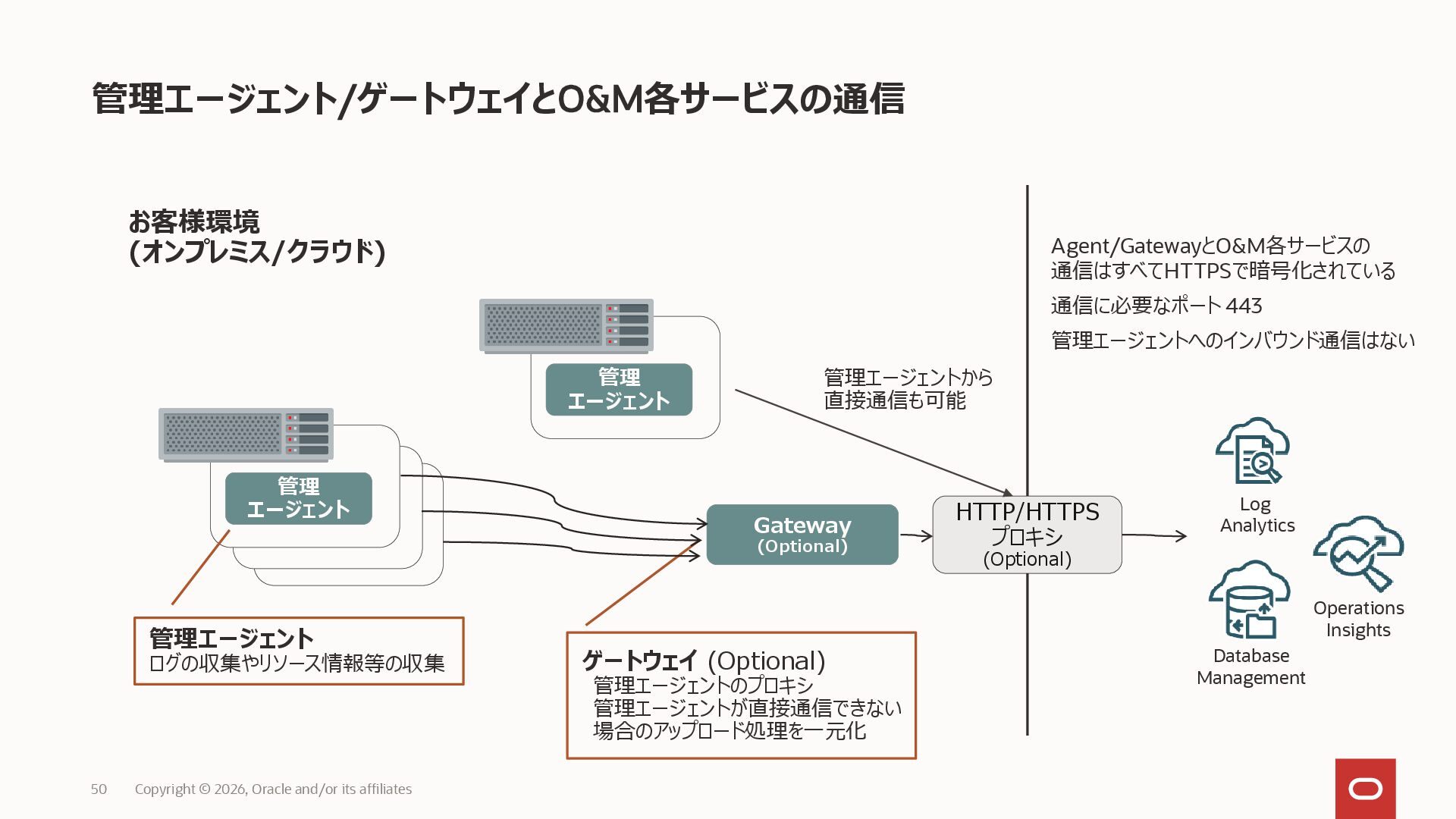 エージェント 管理 エージェント 管理エージェント ログの収集やリソース情報等の収集 ゲートウェイ (Optional) 管理エージェントのプロキシ 管理エージェントが直接通信できない 場合のアップロード処理を一元化 管理エージェントから 直接通信も可能 Agent/GatewayとO&M各サービスの 通信はすべてHTTPSで暗号化されている 通信に必要なポート 443 管理エージェントへのインバウンド通信はない Operations Insights Log Analytics Database Management Copyright © 2026, Oracle and/or its affiliates