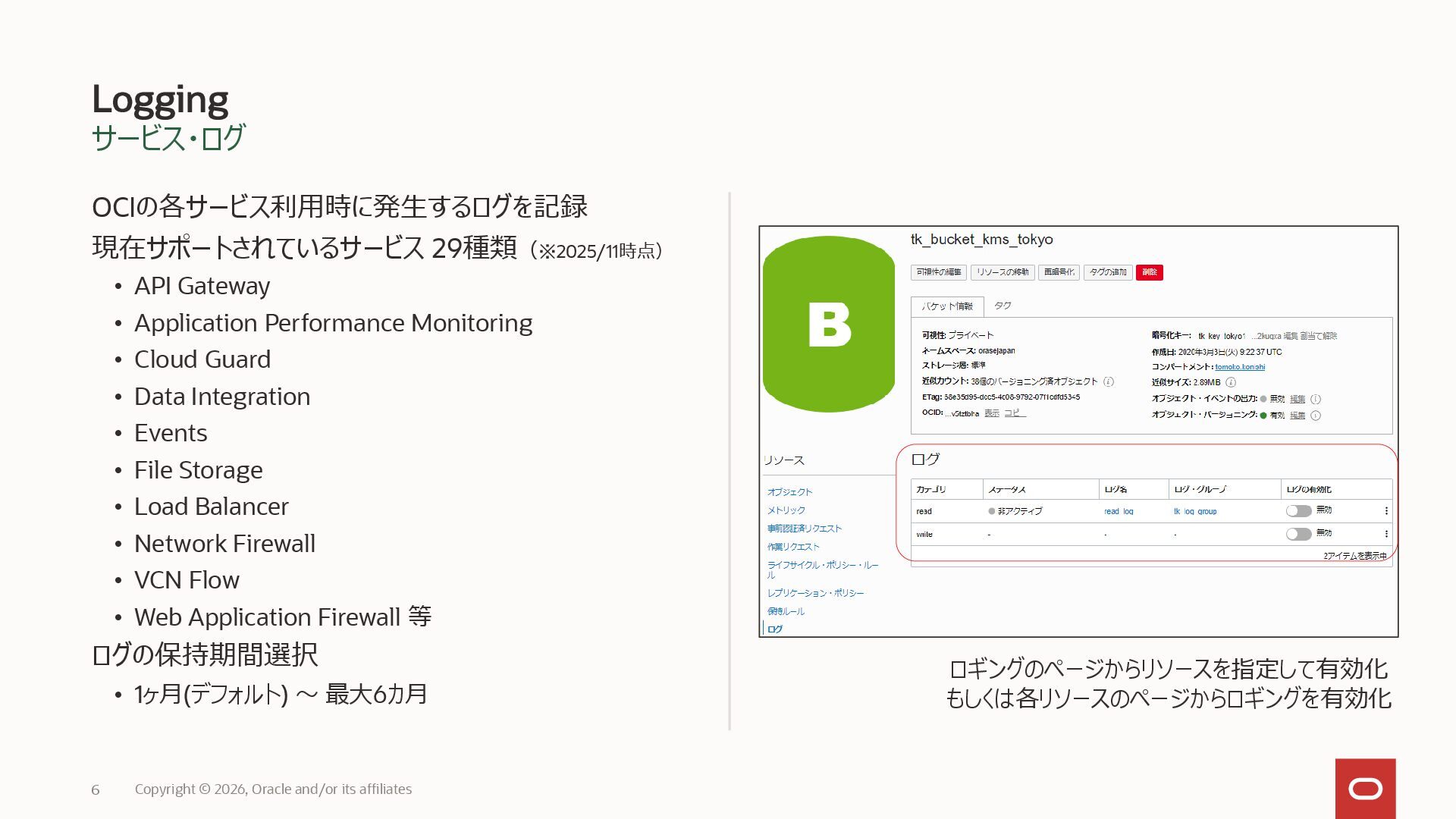 ログの内容 • APIが発行された時間 • アクティビティのソース • アクティビティのターゲット • アクションのタイプ • レスポンスのタイプ 画面上で表示したログをJSON形式でエクスポート Logging 5 Copyright © 2026, Oracle and/or its affiliates
