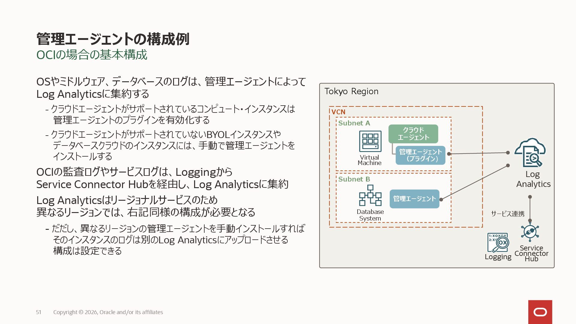 クラウドエージェントがサポートされていないBYOLインスタンスや データベースクラウドのインスタンスには、手動で管理エージェントを インストールする OCIの監査ログやサービスログは、Loggingから Service Connector Hubを経由し、Log Analyticsに集約 Log Analyticsはリージョナルサービスのため 異なるリージョンでは、右記同様の構成が必要となる - だだし、異なるリージョンの管理エージェントを手動インストールすれば そのインスタンスのログは別のLog Analyticsにアップロードさせる 構成は設定できる Tokyo Region VCN Subnet A Subnet B Virtual Machine Database System クラウド エージェント Log Analytics 管理エージェント (プラグイン) 管理エージェント Logging Service Connector Hub サービス連携 Copyright © 2026, Oracle and/or its affiliates