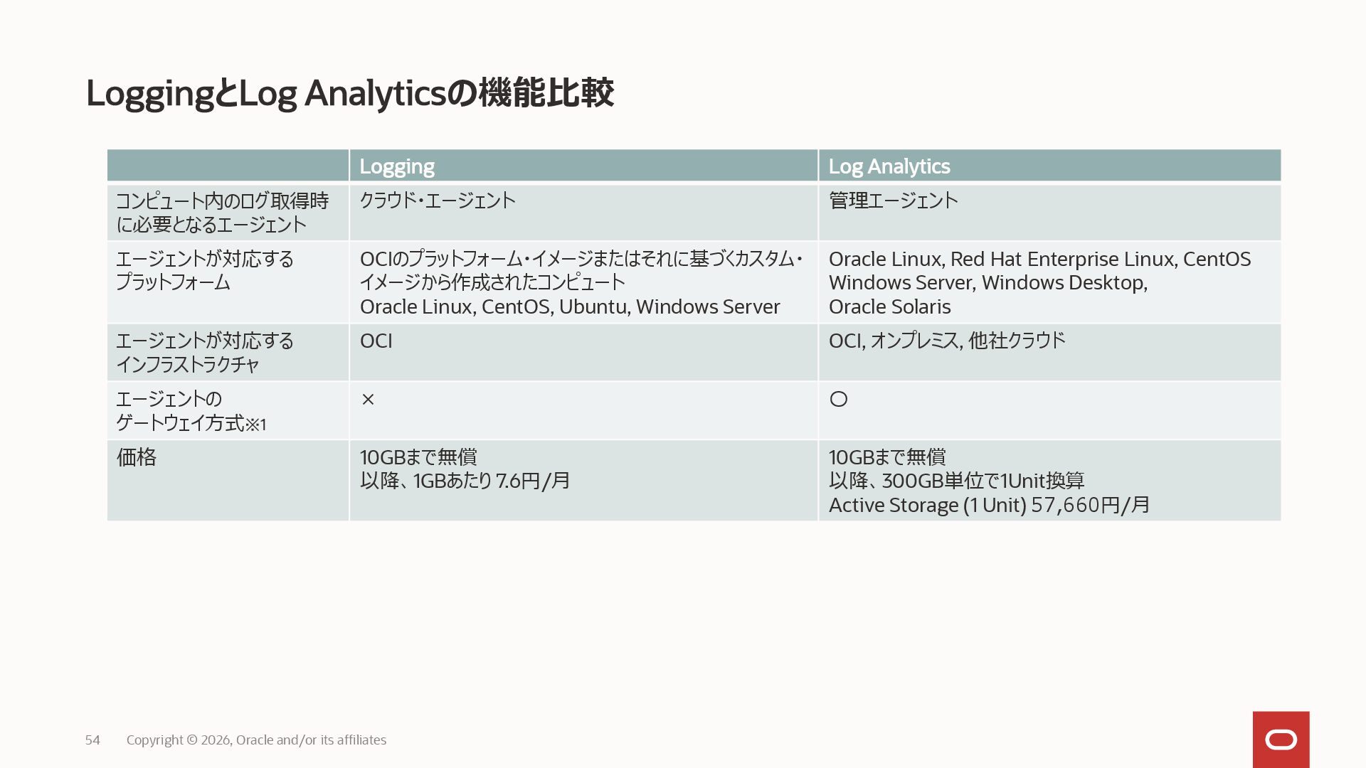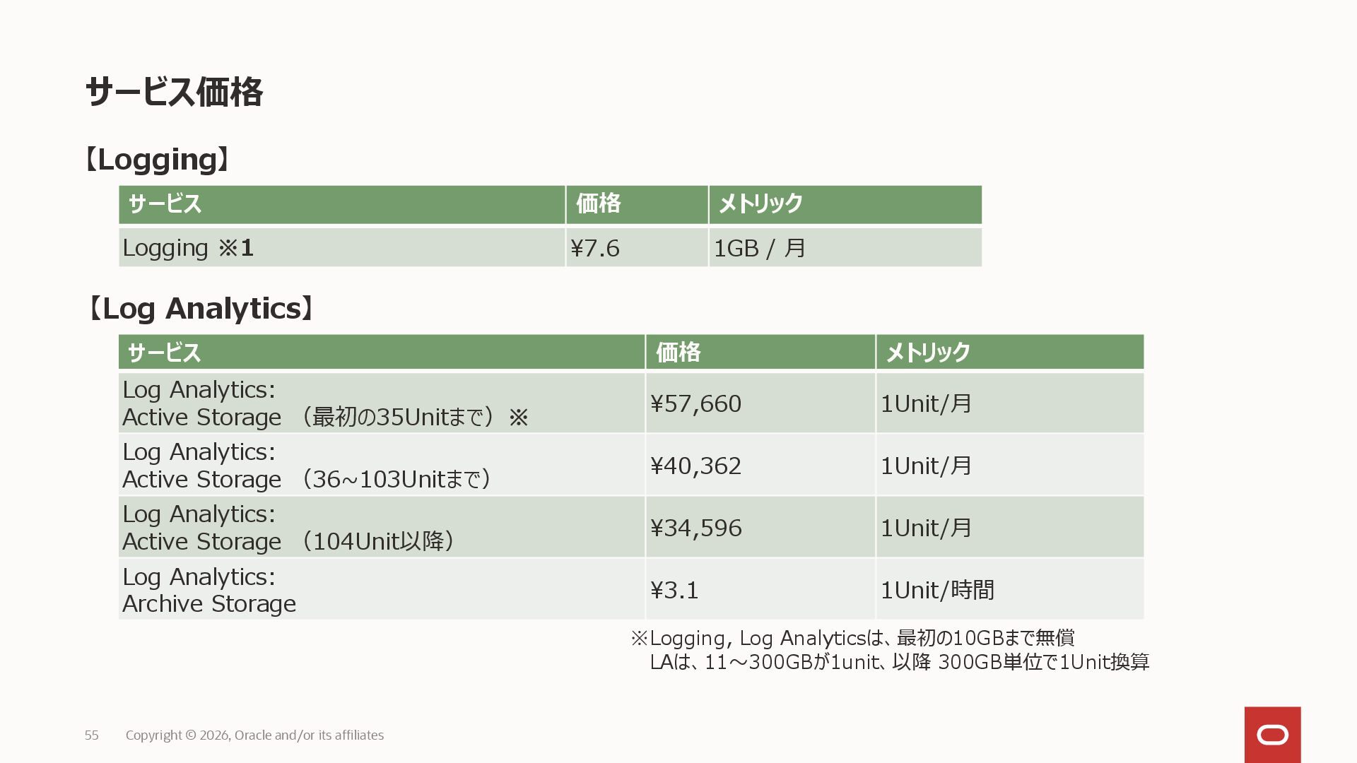 Storage (最初の35Unitまで)※ ¥57,660 1Unit/月 Log Analytics: Active Storage (36~103Unitまで) ¥40,362 1Unit/月 Log Analytics: Active Storage (104Unit以降) ¥34,596 1Unit/月 Log Analytics: Archive Storage ¥3.1 1Unit/時間 ※Logging, Log Analyticsは、最初の10GBまで無償 LAは、11~300GBが1unit、以降 300GB単位で1Unit換算 【Logging】 サービス 価格 メトリック Logging ※1 ¥7.6 1GB / 月 Copyright © 2026, Oracle and/or its affiliates
