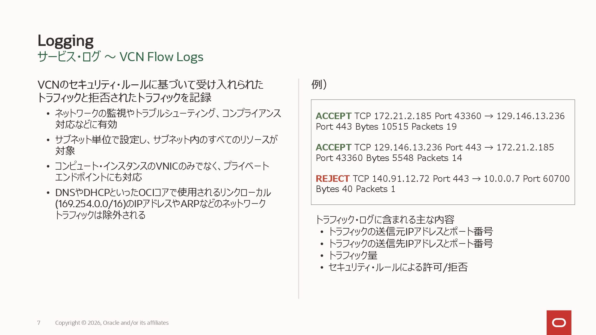 • サブネット単位で設定し、サブネット内のすべてのリソースが 対象 • コンピュート・インスタンスのVNICのみでなく、プライベート エンドポイントにも対応 • DNSやDHCPといったOCIコアで使用されるリンクローカル (169.254.0.0/16)のIPアドレスやARPなどのネットワーク トラフィックは除外される 例) Logging 7 ACCEPT TCP 172.21.2.185 Port 43360 → 129.146.13.236 Port 443 Bytes 10515 Packets 19 ACCEPT TCP 129.146.13.236 Port 443 → 172.21.2.185 Port 43360 Bytes 5548 Packets 14 REJECT TCP 140.91.12.72 Port 443 → 10.0.0.7 Port 60700 Bytes 40 Packets 1 トラフィック・ログに含まれる主な内容 • トラフィックの送信元IPアドレスとポート番号 • トラフィックの送信先IPアドレスとポート番号 • トラフィック量 • セキュリティ・ルールによる許可/拒否 Copyright © 2026, Oracle and/or its affiliates