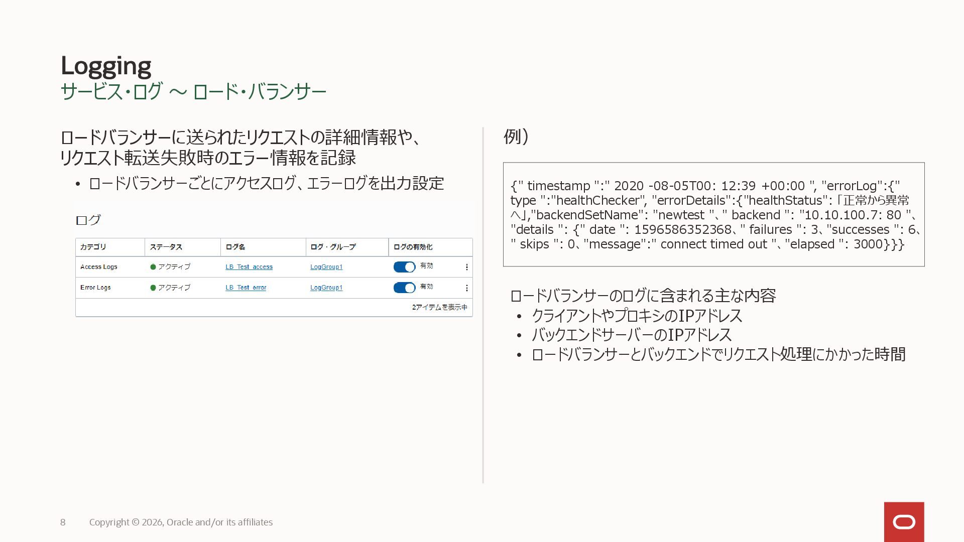 -08-05T00: 12:39 +00:00 ", "errorLog":{" type ":"healthChecker", "errorDetails":{"healthStatus": 「正常から異常 へ」,"backendSetName": "newtest "、" backend ": "10.10.100.7: 80 "、 "details ": {" date ": 1596586352368、" failures ": 3、"successes ": 6、 " skips ": 0、"message":" connect timed out "、"elapsed ": 3000}}} ロードバランサーのログに含まれる主な内容 • クライアントやプロキシのIPアドレス • バックエンドサーバーのIPアドレス • ロードバランサーとバックエンドでリクエスト処理にかかった時間 ロードバランサーに送られたリクエストの詳細情報や、 リクエスト転送失敗時のエラー情報を記録 • ロードバランサーごとにアクセスログ、エラーログを出力設定 Copyright © 2026, Oracle and/or its affiliates