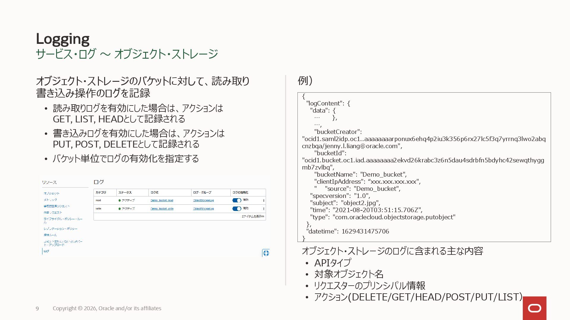 { … }, …, "bucketCreator": "ocid1.saml2idp.oc1..aaaaaaaarponux6ehq4p2iu3k356p6rx27lc5f3q7yrrnq3lwo2abq cnzbqa/[email protected]", "bucketId": "ocid1.bucket.oc1.iad.aaaaaaaa2ekvd26krabc3z6n5dau4sdrbfn5bdyhc42sewqthygg mb7zvlbq", "bucketName": "Demo_bucket", "clientIpAddress": “xxx.xxx.xxx.xxx", " "source": "Demo_bucket", "specversion": "1.0", "subject": "object2.jpg", "time": "2021-08-20T03:51:15.706Z", "type": "com.oraclecloud.objectstorage.putobject" }, "datetime": 1629431475706 } オブジェクト・ストレージのログに含まれる主な内容 • APIタイプ • 対象オブジェクト名 • リクエスターのプリンシパル情報 • アクション(DELETE/GET/HEAD/POST/PUT/LIST) オブジェクト・ストレージのバケットに対して、読み取り 書き込み操作のログを記録 • 読み取りログを有効にした場合は、アクションは GET, LIST, HEADとして記録される • 書き込みログを有効にした場合は、アクションは PUT, POST, DELETEとして記録される • バケット単位でログの有効化を指定する Copyright © 2026, Oracle and/or its affiliates
