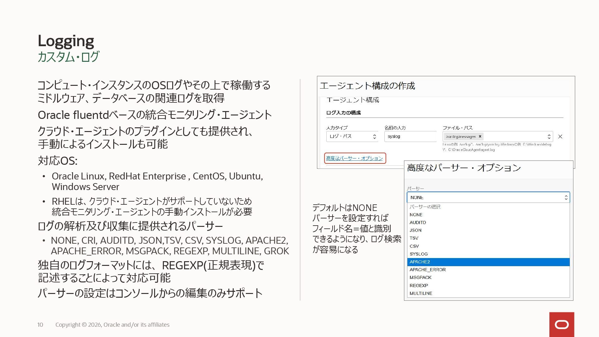 • Oracle Linux, RedHat Enterprise , CentOS, Ubuntu, Windows Server • RHELは、クラウド・エージェントがサポートしていないため 統合モニタリング・エージェントの手動インストールが必要 ログの解析及び収集に提供されるパーサー • NONE, CRI, AUDITD, JSON,TSV, CSV, SYSLOG, APACHE2, APACHE_ERROR, MSGPACK, REGEXP, MULTILINE, GROK 独自のログフォーマットには、 REGEXP(正規表現)で 記述することによって対応可能 パーサーの設定はコンソールからの編集のみサポート デフォルトはNONE パーサーを設定すれば フィールド名=値と識別 できるようになり、ログ検索 が容易になる Copyright © 2026, Oracle and/or its affiliates