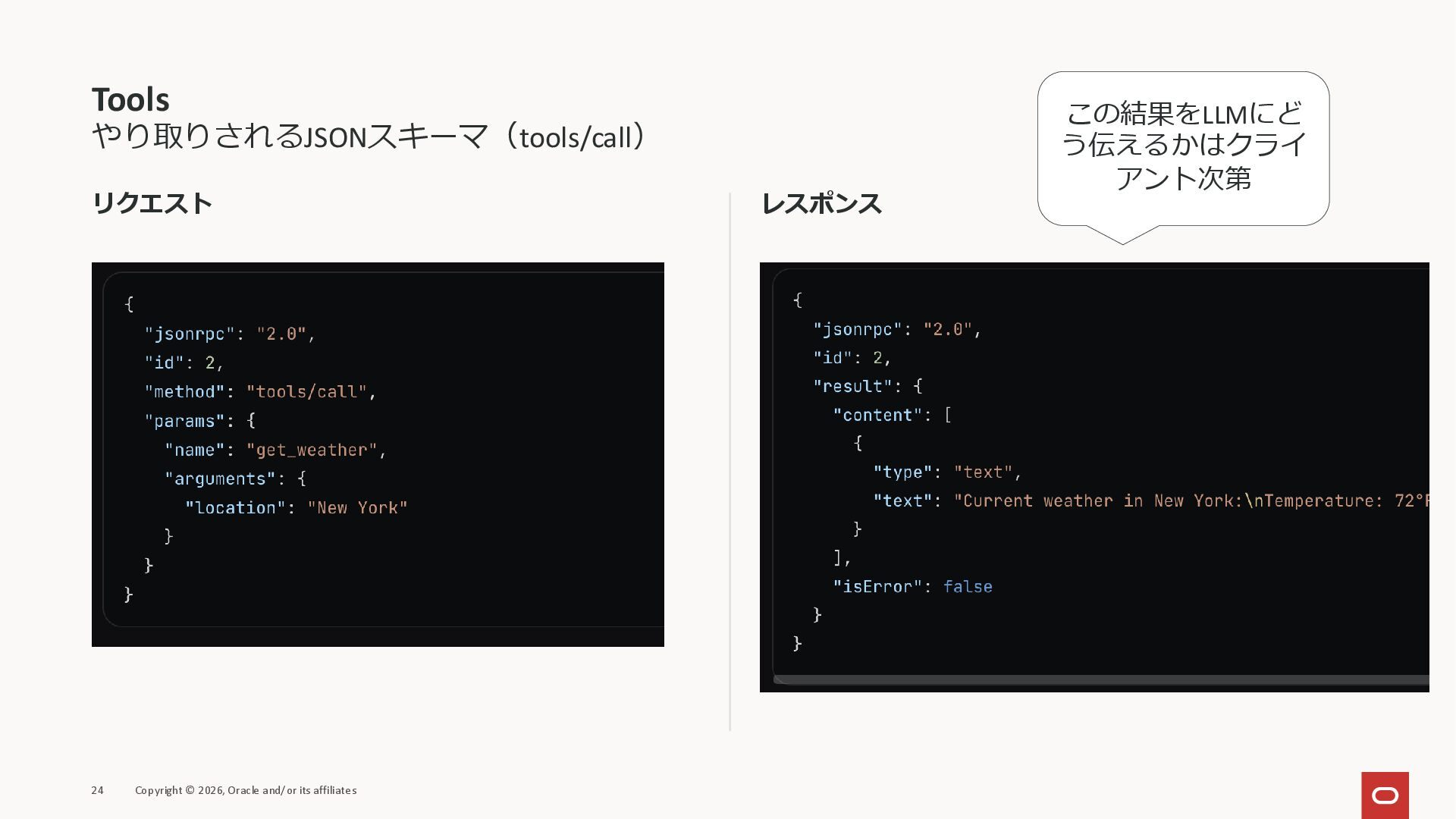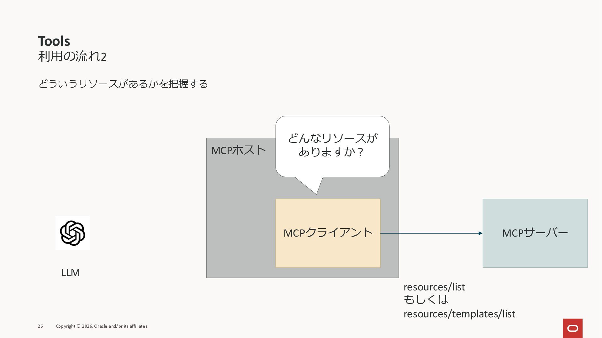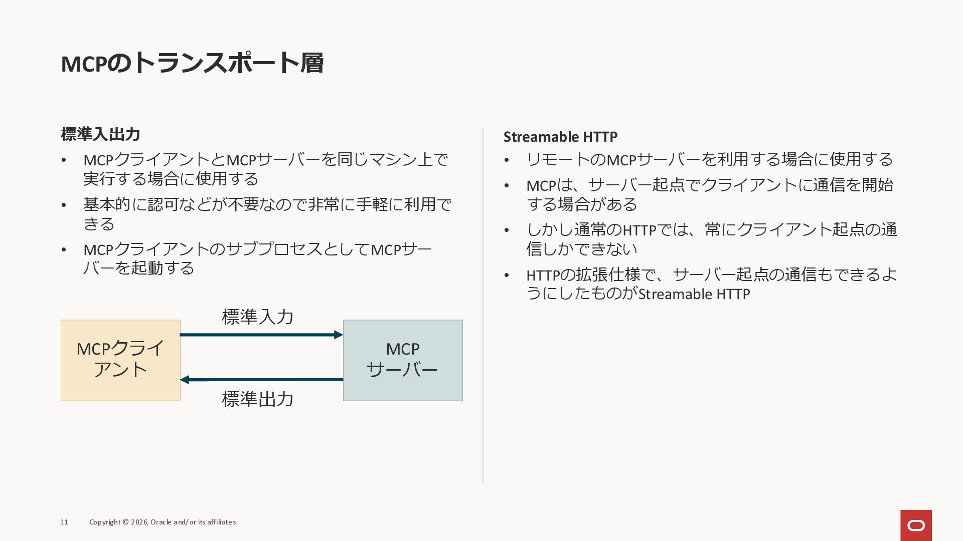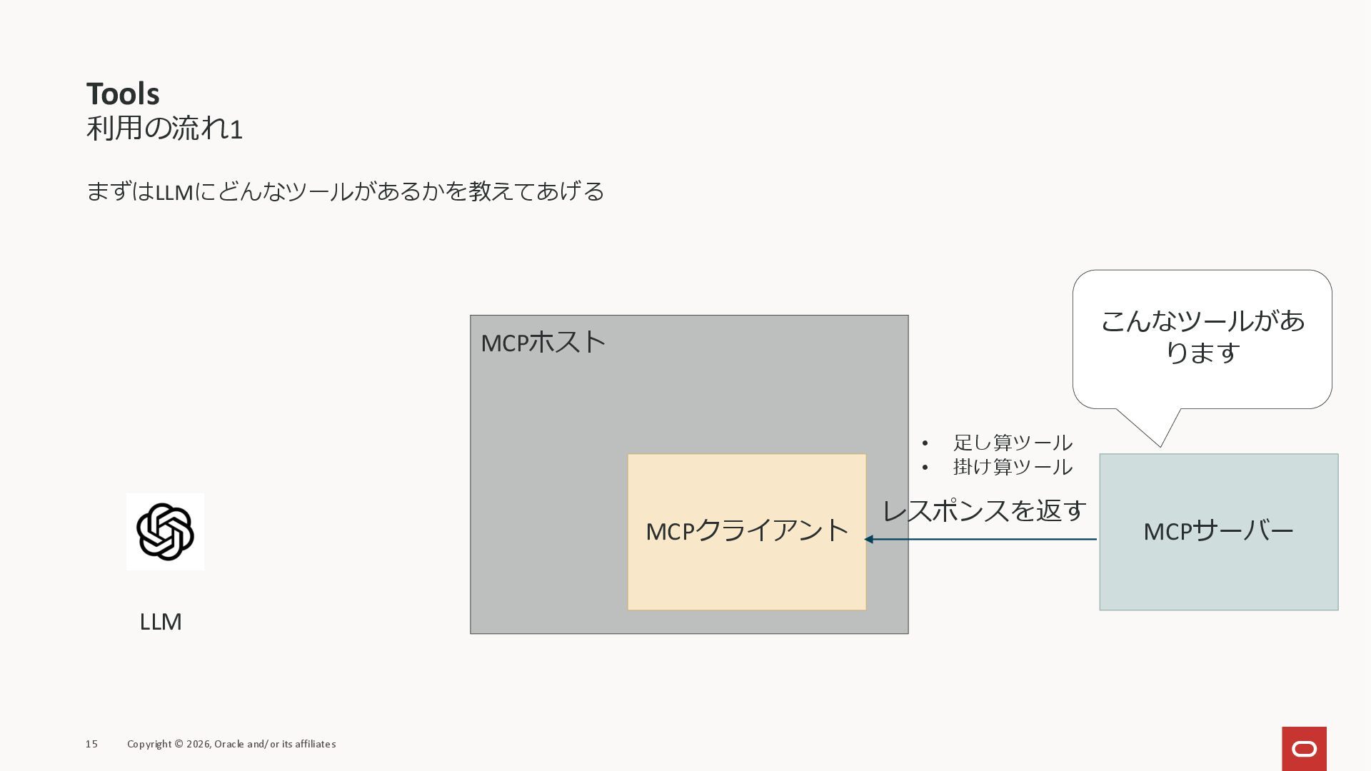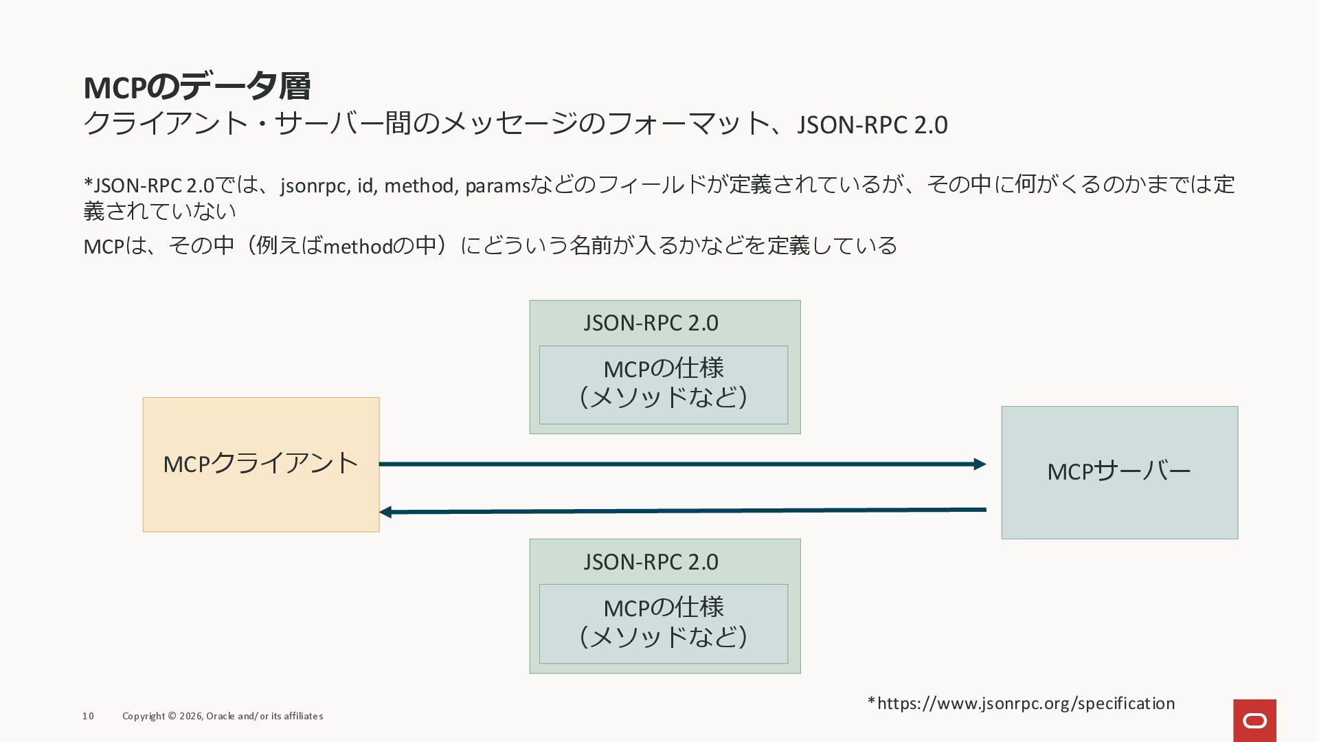 affiliates MCPクライアント MCPサーバー JSON-RPC 2.0 MCPの仕様 (メソッドなど) JSON-RPC 2.0 MCPの仕様 (メソッドなど) *JSON-RPC 2.0では、jsonrpc, id, method, paramsなどのフィールドが定義されているが、その中に何がくるのかまでは定 義されていない MCPは、その中(例えばmethodの中)にどういう名前が入るかなどを定義している *https://www.jsonrpc.org/specification