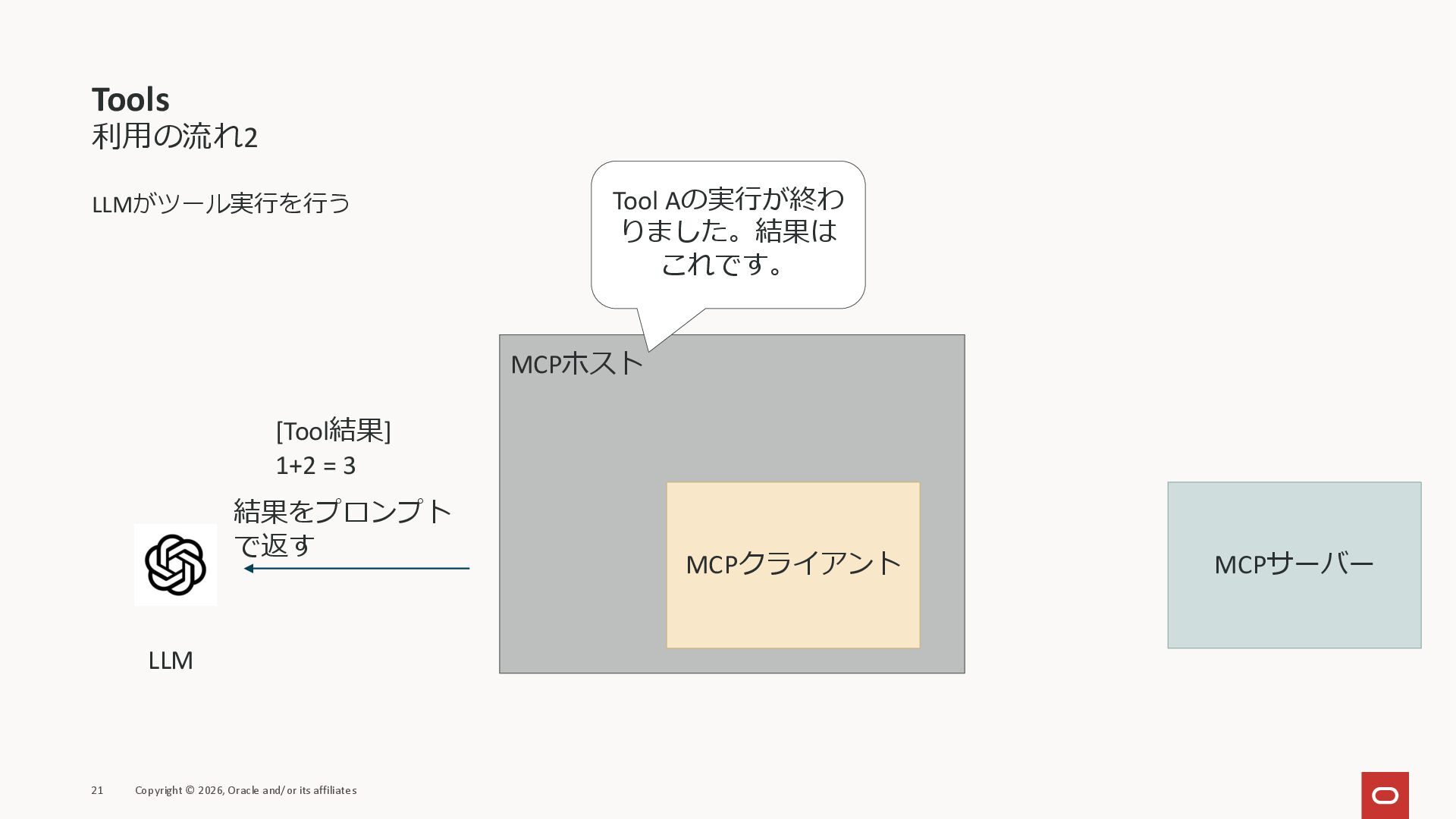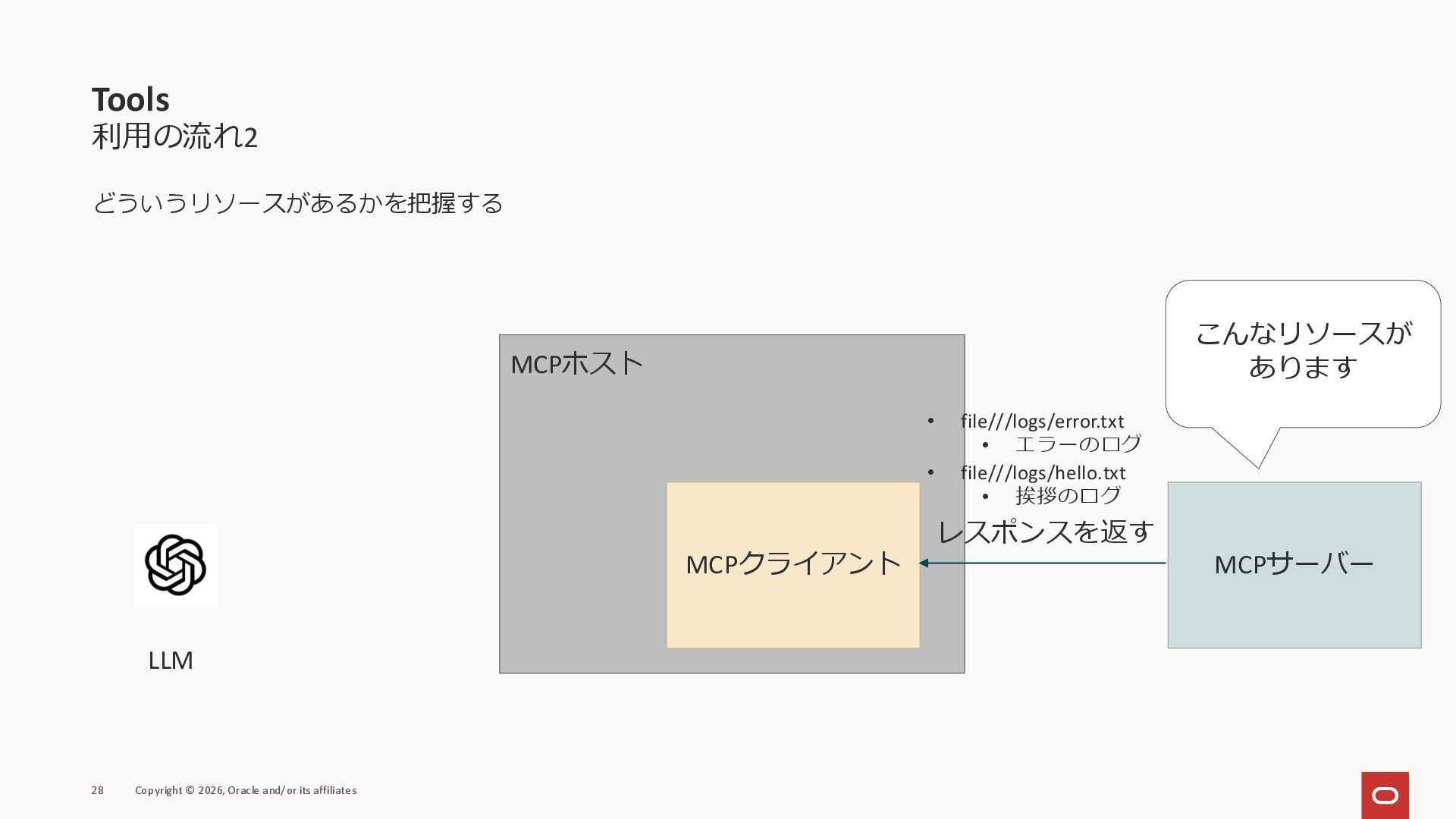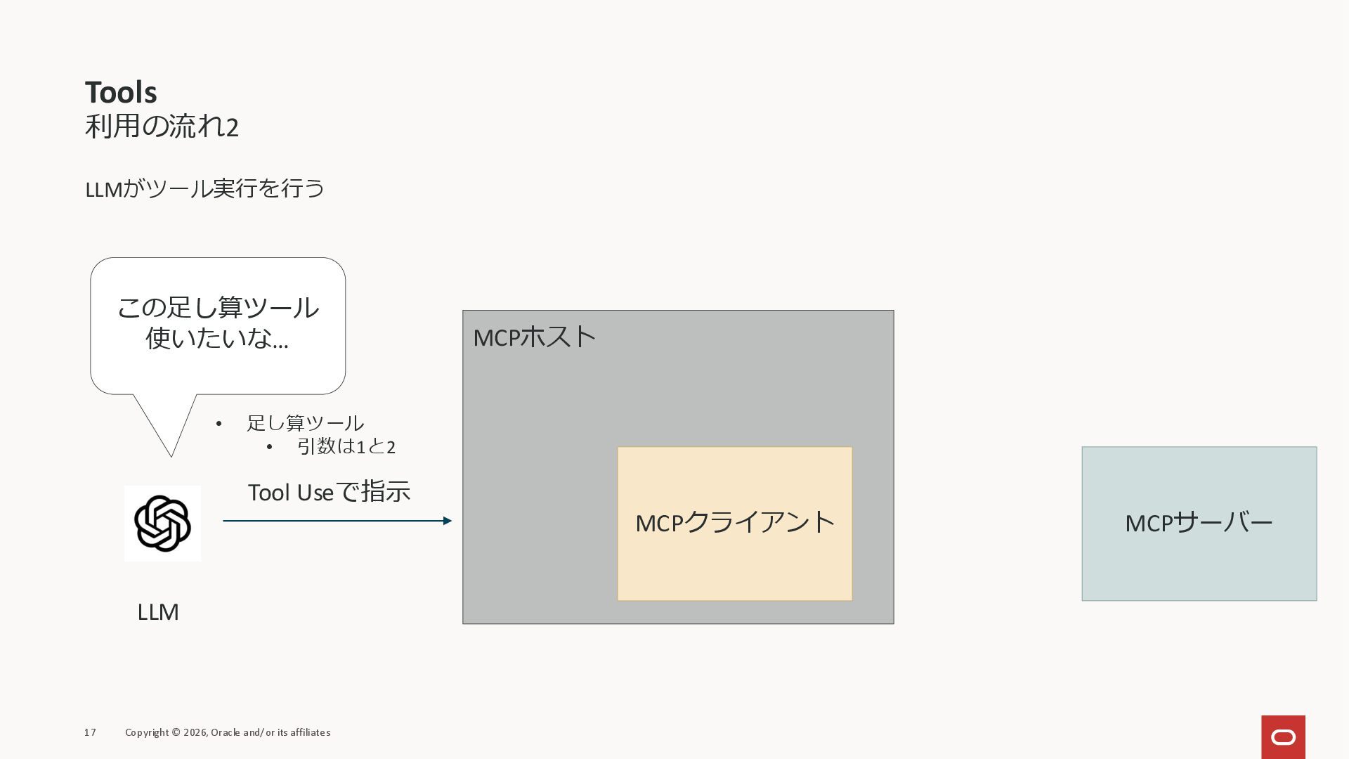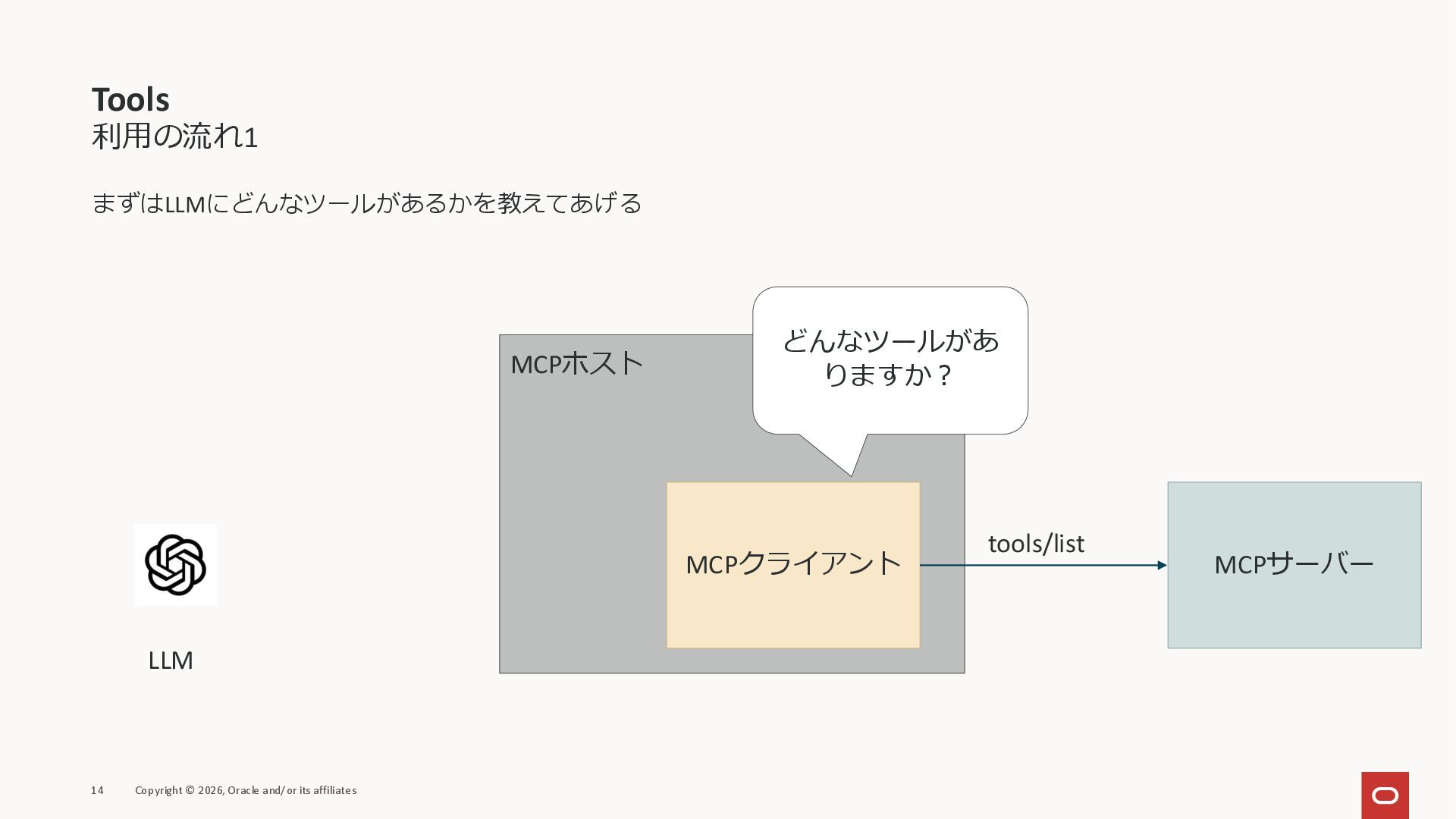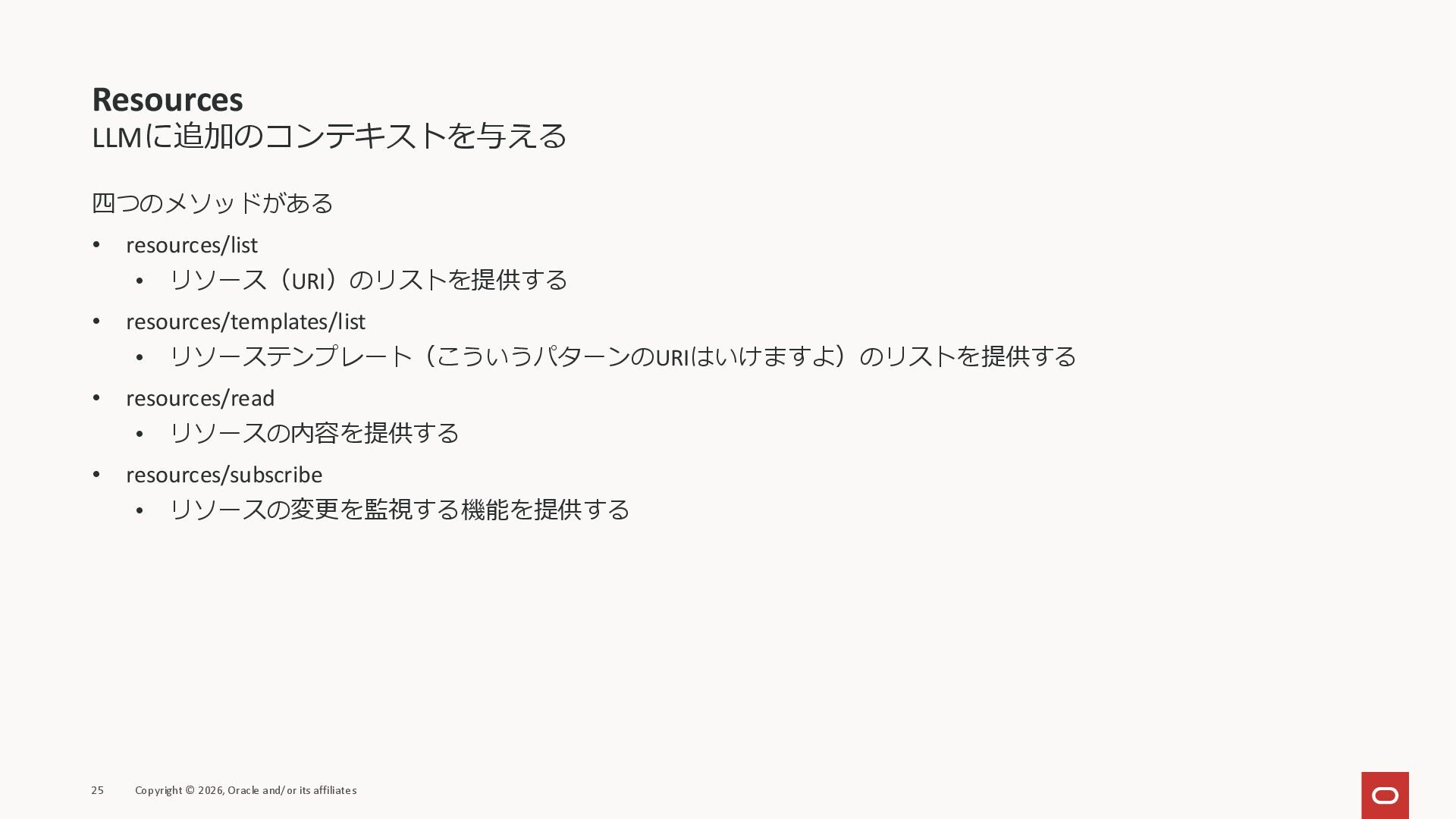 affiliates MCPクライアント MCPサーバー JSON-RPC 2.0 MCPの仕様 (メソッドなど) JSON-RPC 2.0 MCPの仕様 (メソッドなど) *JSON-RPC 2.0では、jsonrpc, id, method, paramsなどのフィールドが定義されているが、その中に何がくるのかまでは定 義されていない MCPは、その中(例えばmethodの中)にどういう名前が入るかなどを定義している *https://www.jsonrpc.org/specification