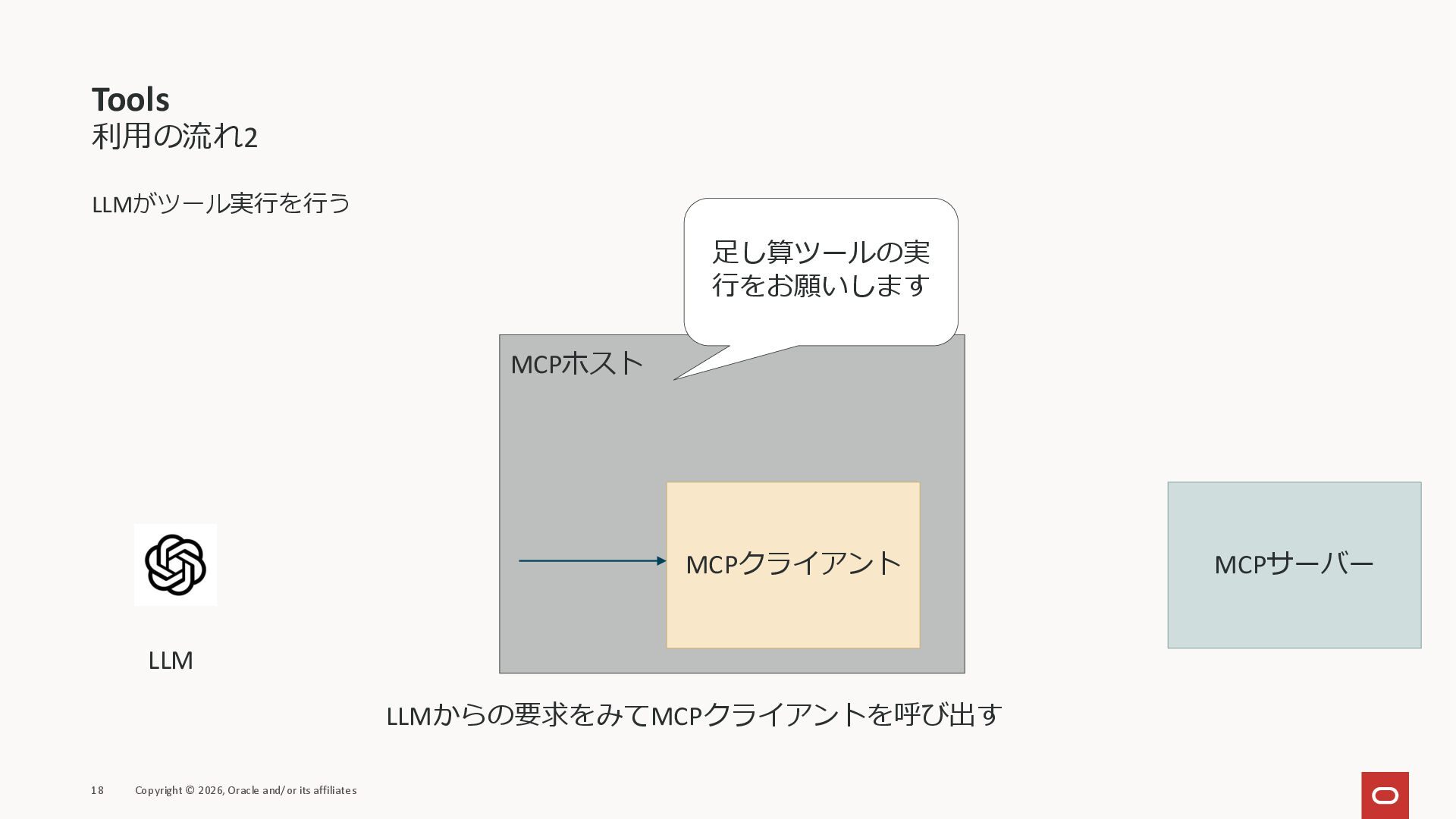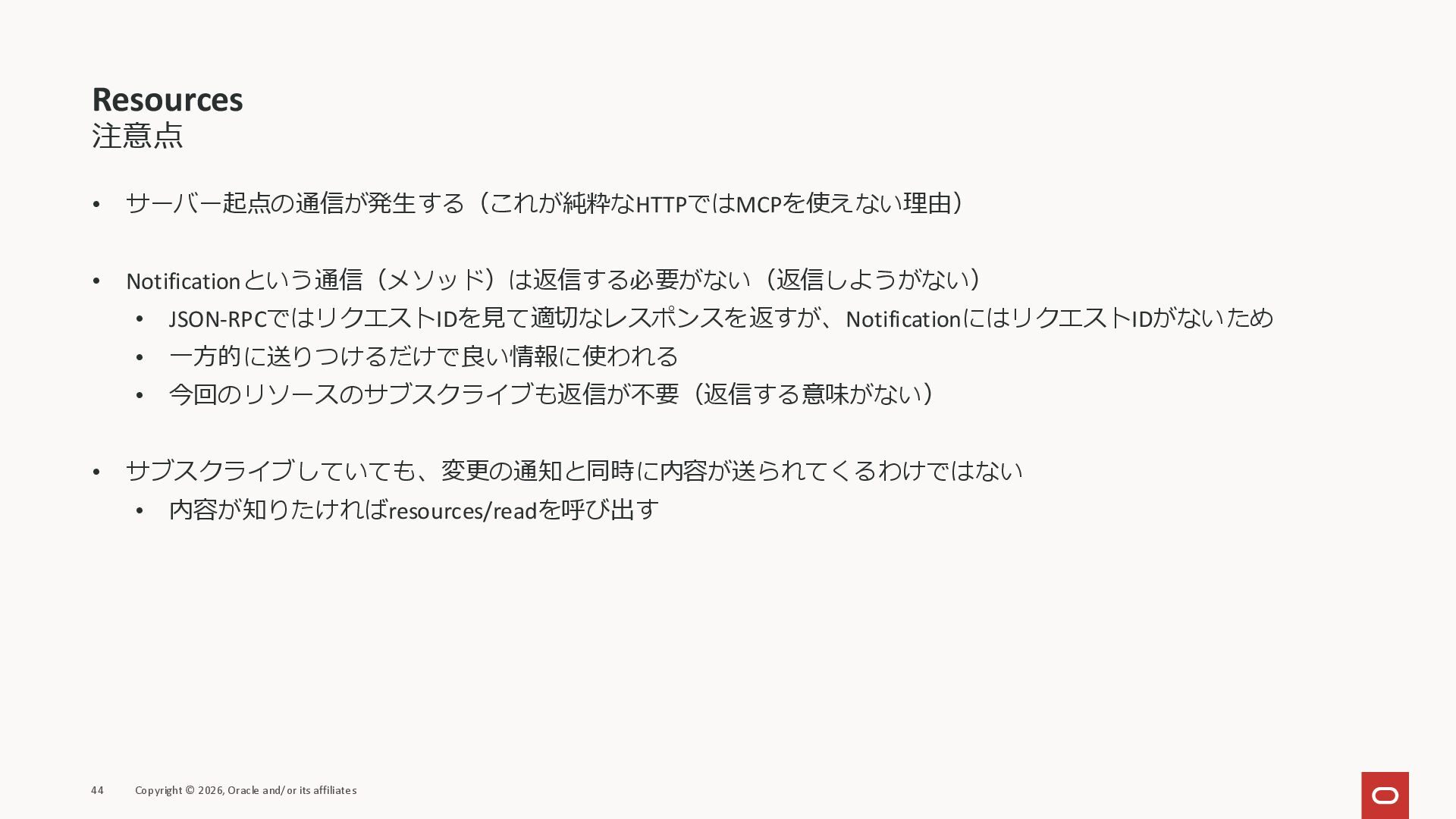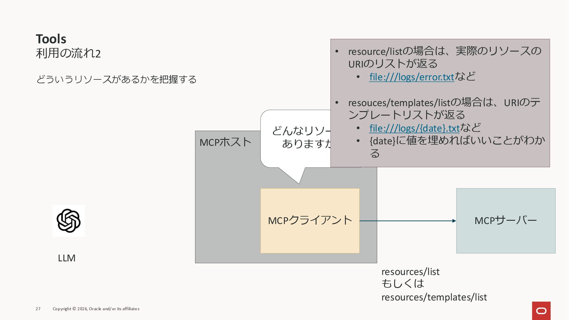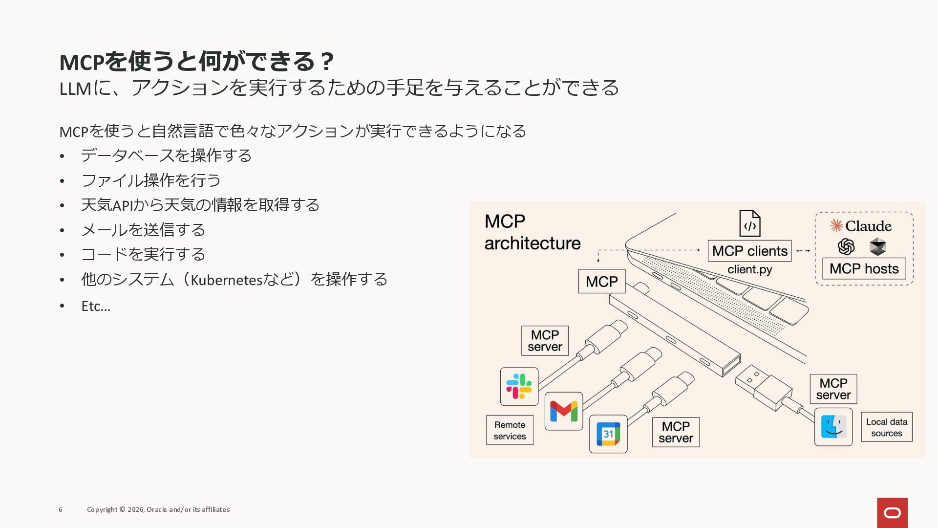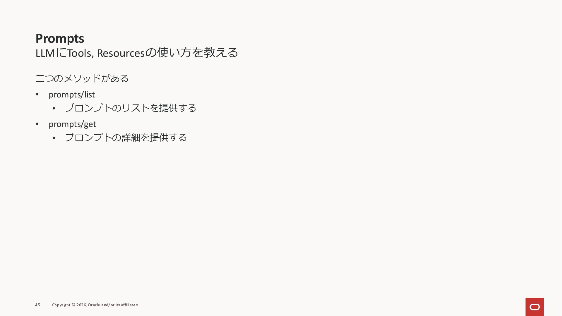 affiliates MCPクライアント MCPサーバー JSON-RPC 2.0 MCPの仕様 (メソッドなど) JSON-RPC 2.0 MCPの仕様 (メソッドなど) *JSON-RPC 2.0では、jsonrpc, id, method, paramsなどのフィールドが定義されているが、その中に何がくるのかまでは定 義されていない MCPは、その中(例えばmethodの中)にどういう名前が入るかなどを定義している *https://www.jsonrpc.org/specification