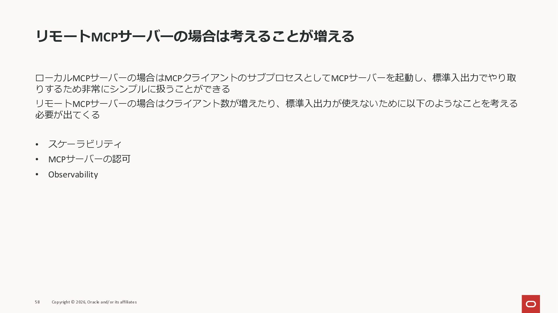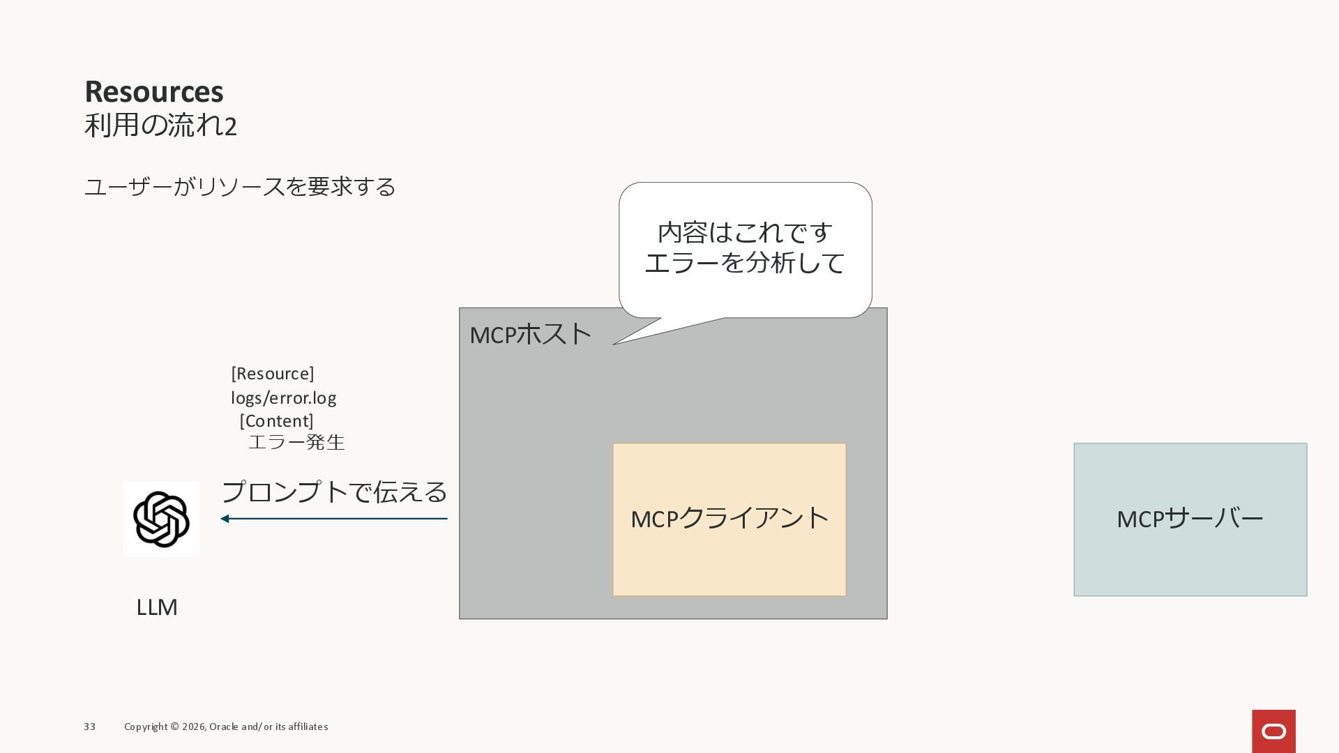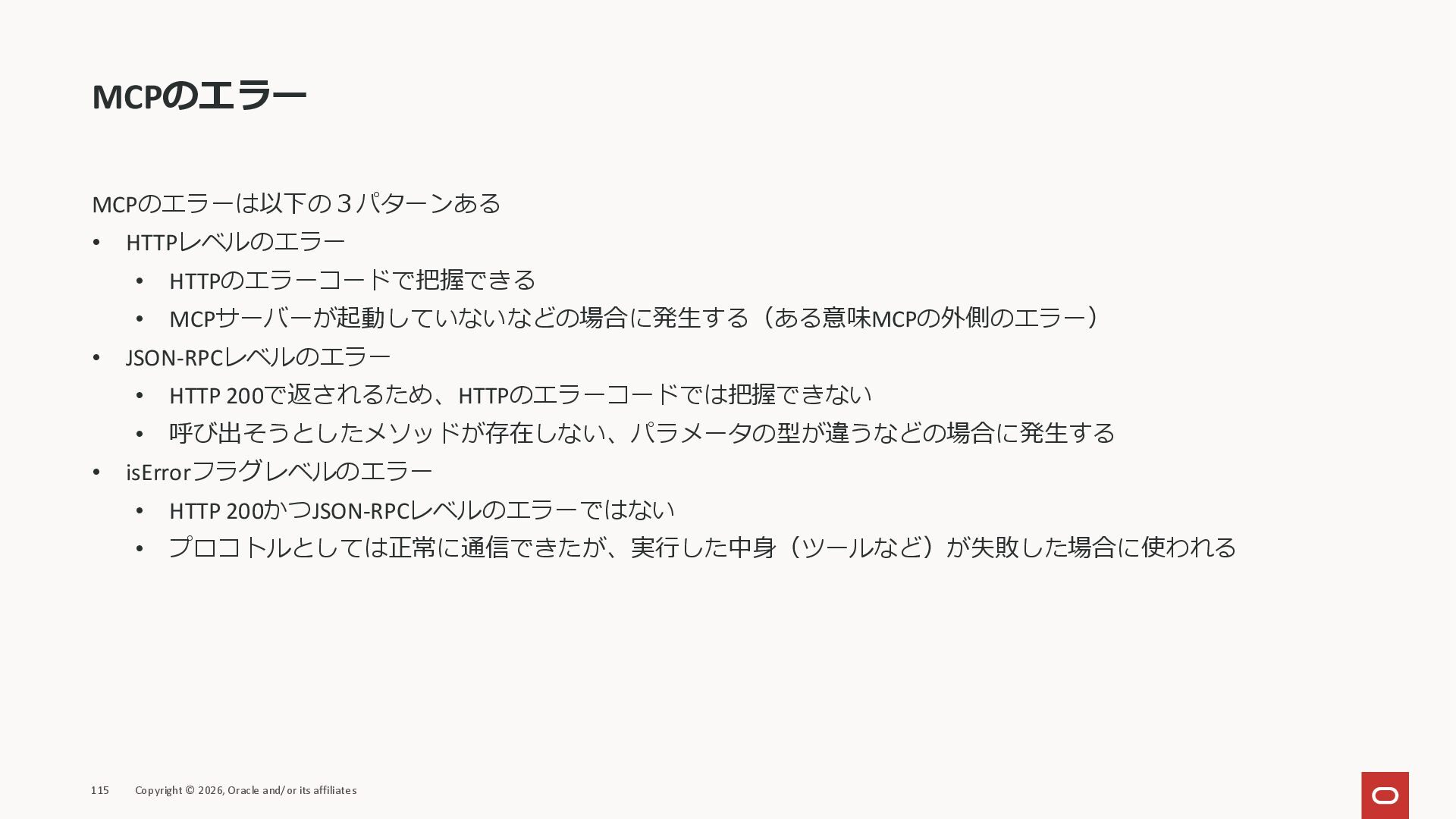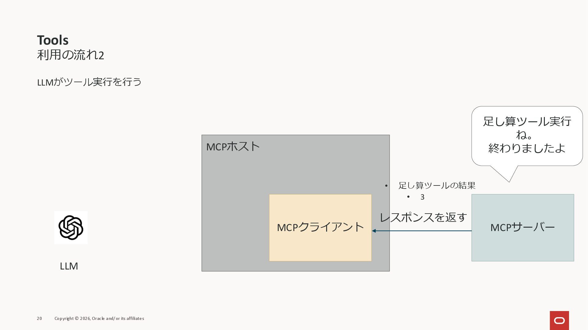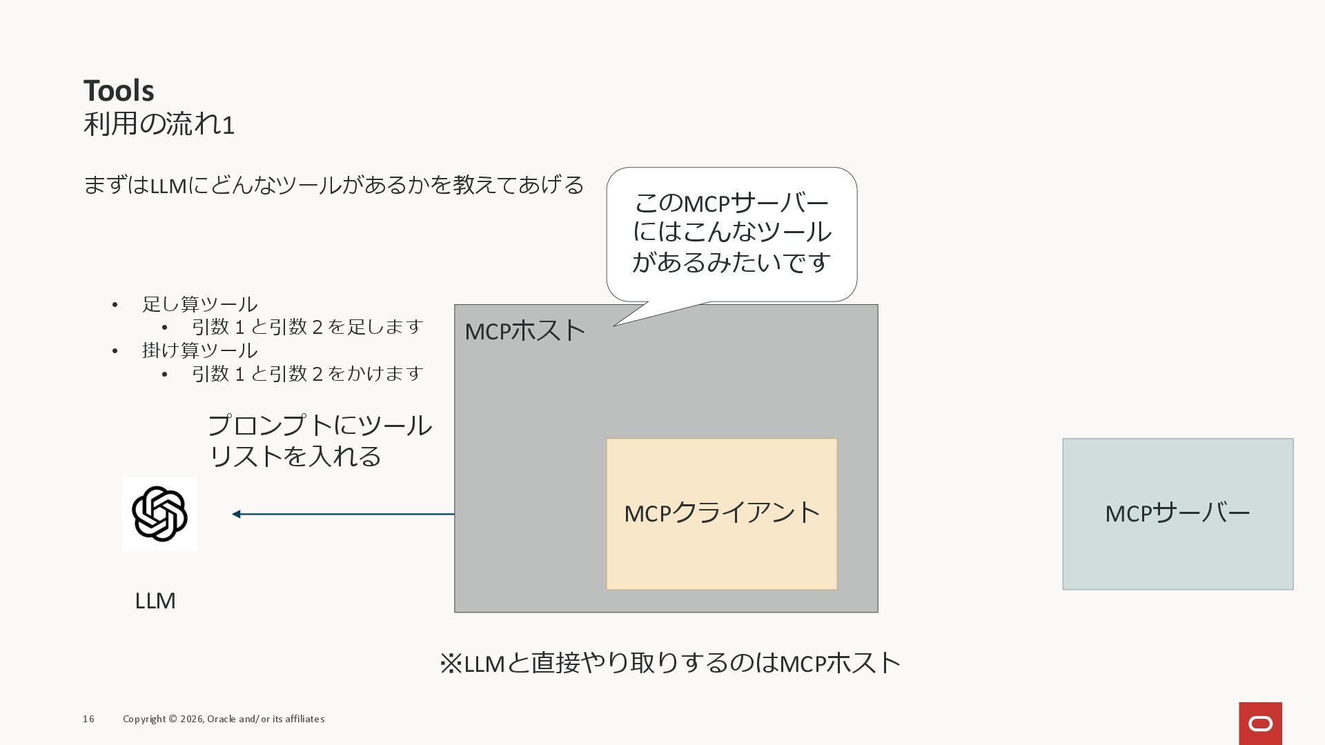 affiliates MCPクライアント MCPサーバー JSON-RPC 2.0 MCPの仕様 (メソッドなど) JSON-RPC 2.0 MCPの仕様 (メソッドなど) *JSON-RPC 2.0では、jsonrpc, id, method, paramsなどのフィールドが定義されているが、その中に何がくるのかまでは定 義されていない MCPは、その中(例えばmethodの中)にどういう名前が入るかなどを定義している *https://www.jsonrpc.org/specification