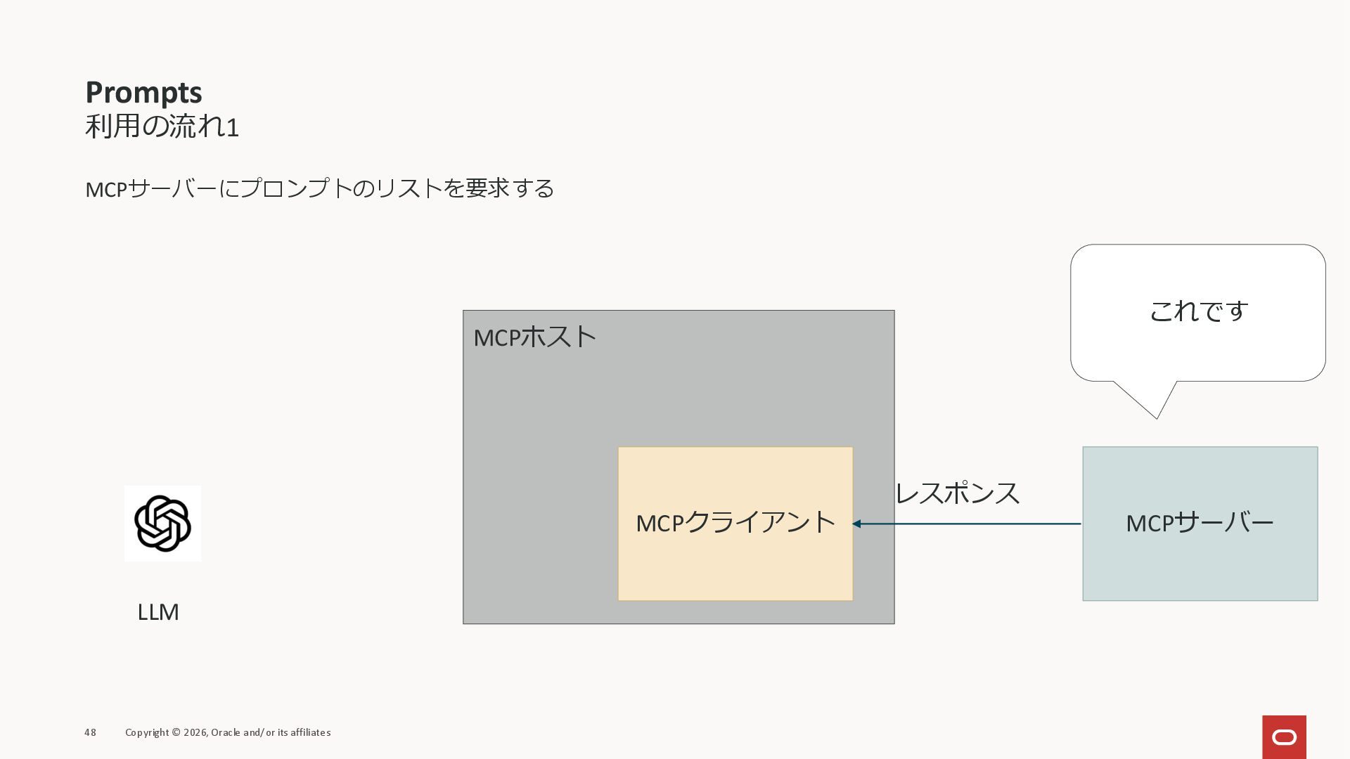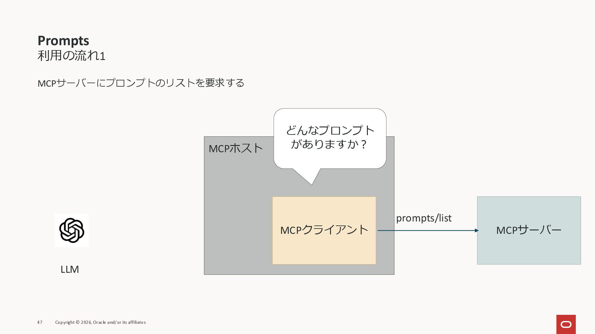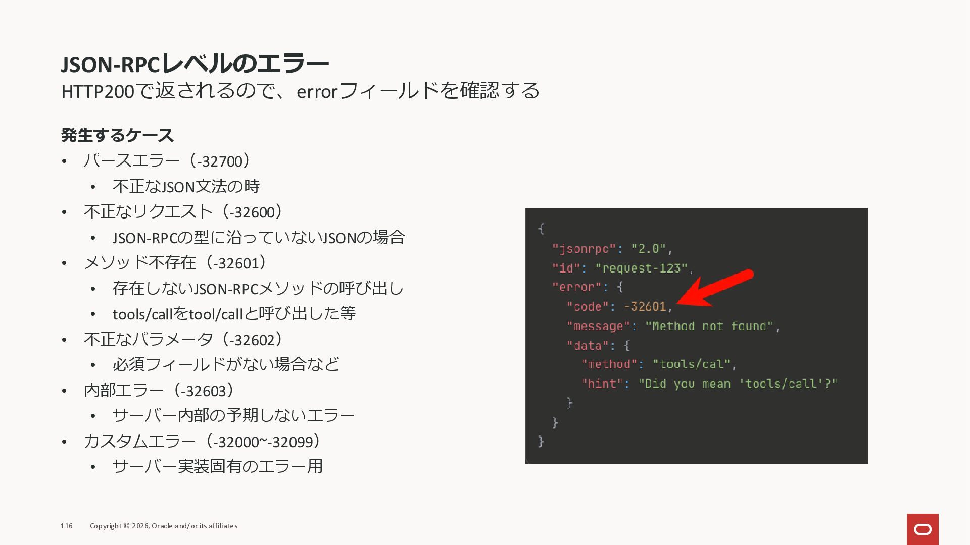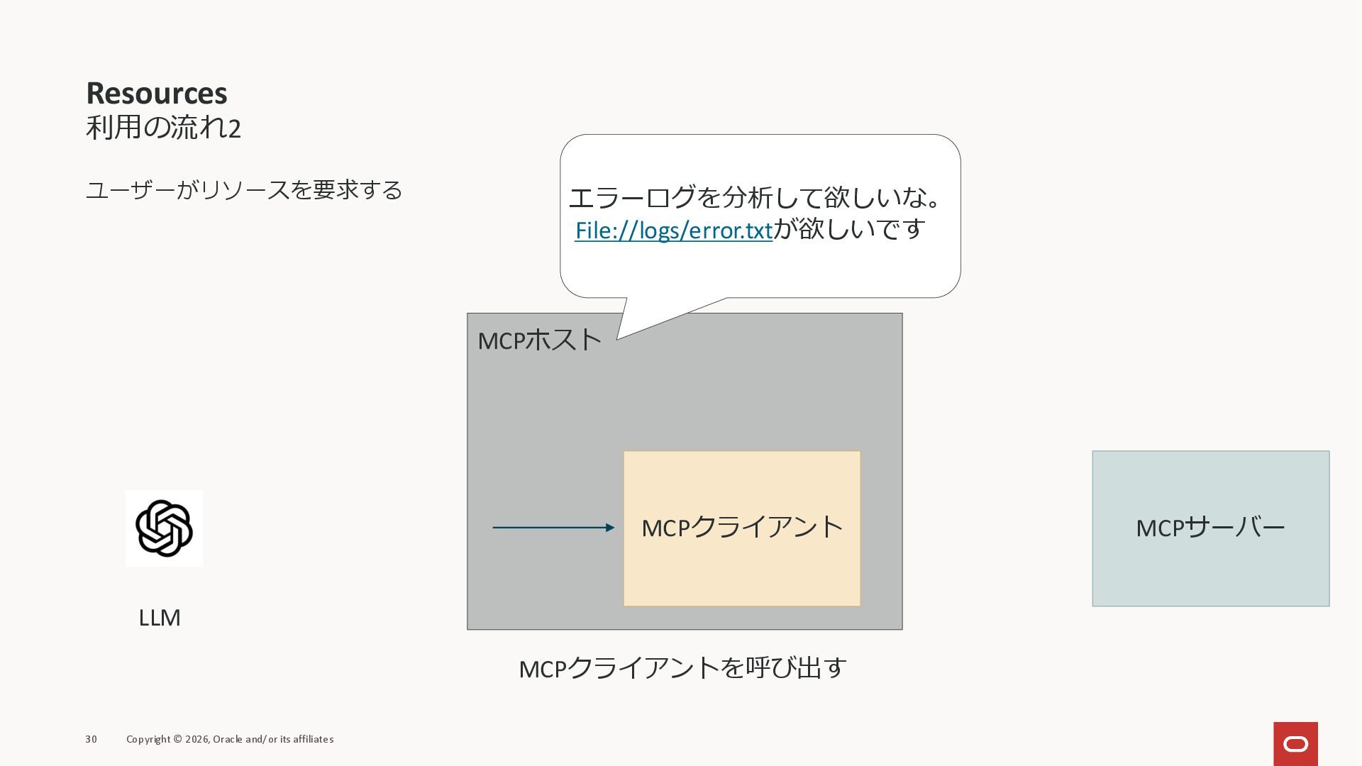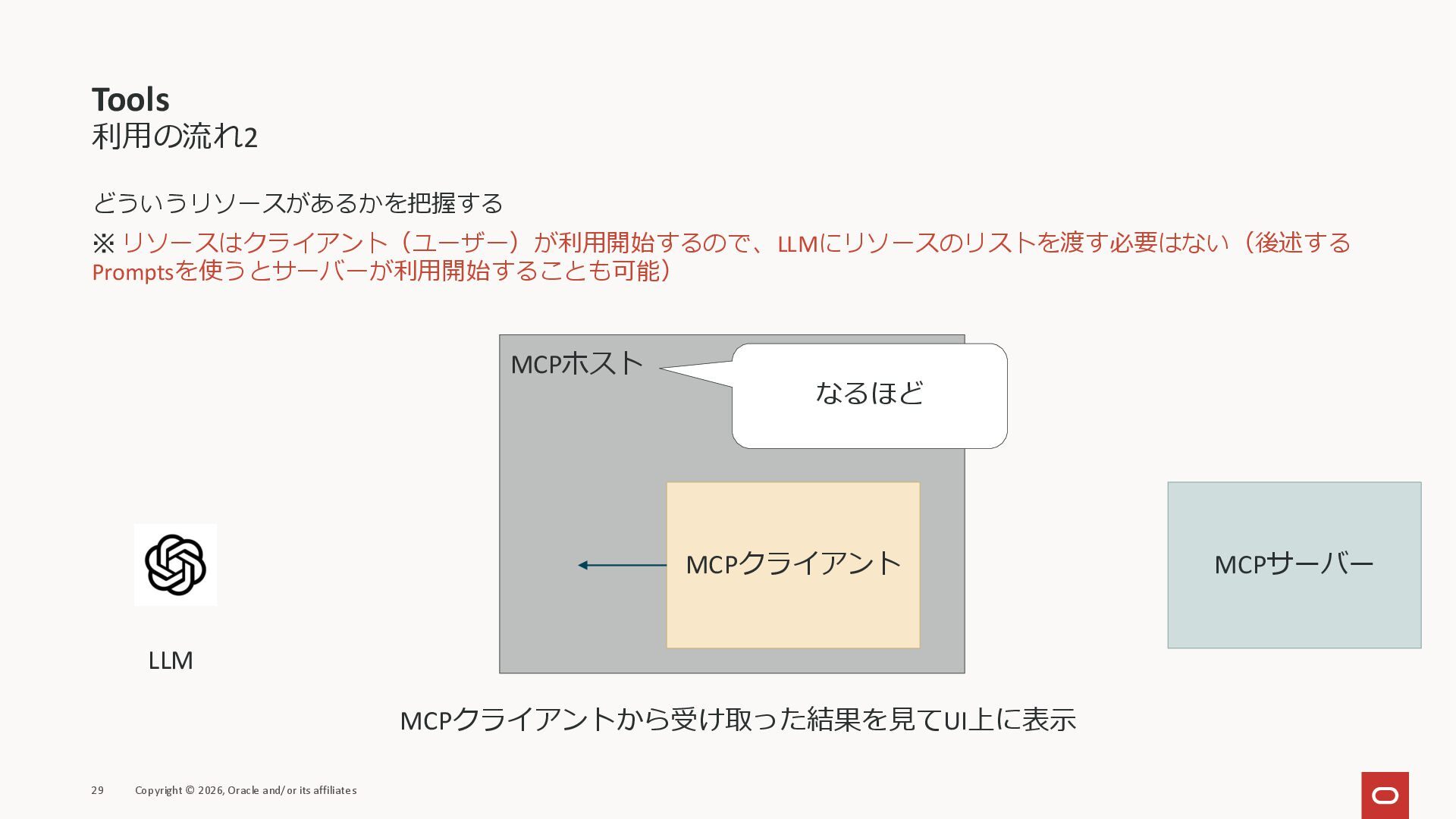 affiliates MCPクライアント MCPサーバー JSON-RPC 2.0 MCPの仕様 (メソッドなど) JSON-RPC 2.0 MCPの仕様 (メソッドなど) *JSON-RPC 2.0では、jsonrpc, id, method, paramsなどのフィールドが定義されているが、その中に何がくるのかまでは定 義されていない MCPは、その中(例えばmethodの中)にどういう名前が入るかなどを定義している *https://www.jsonrpc.org/specification