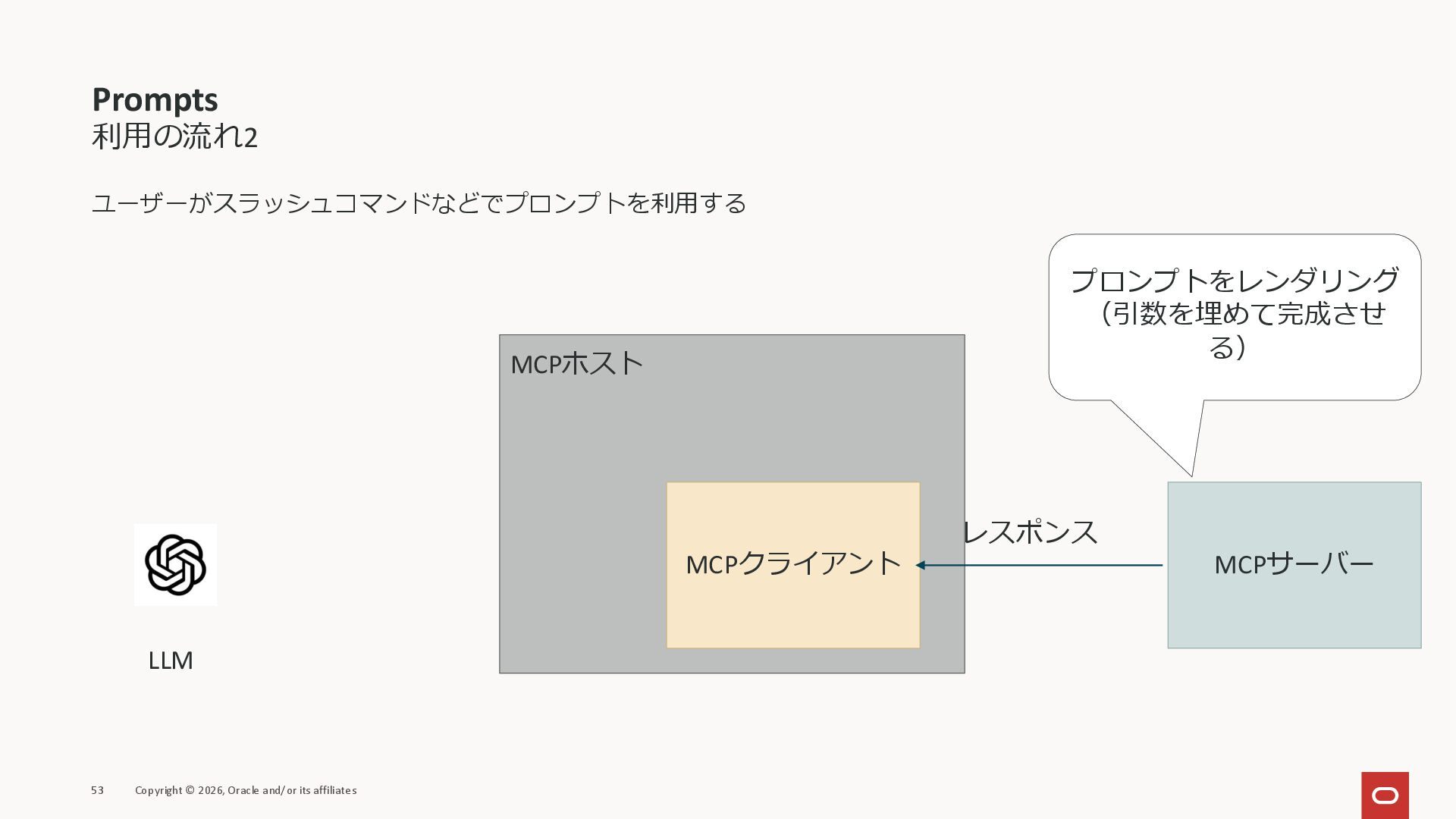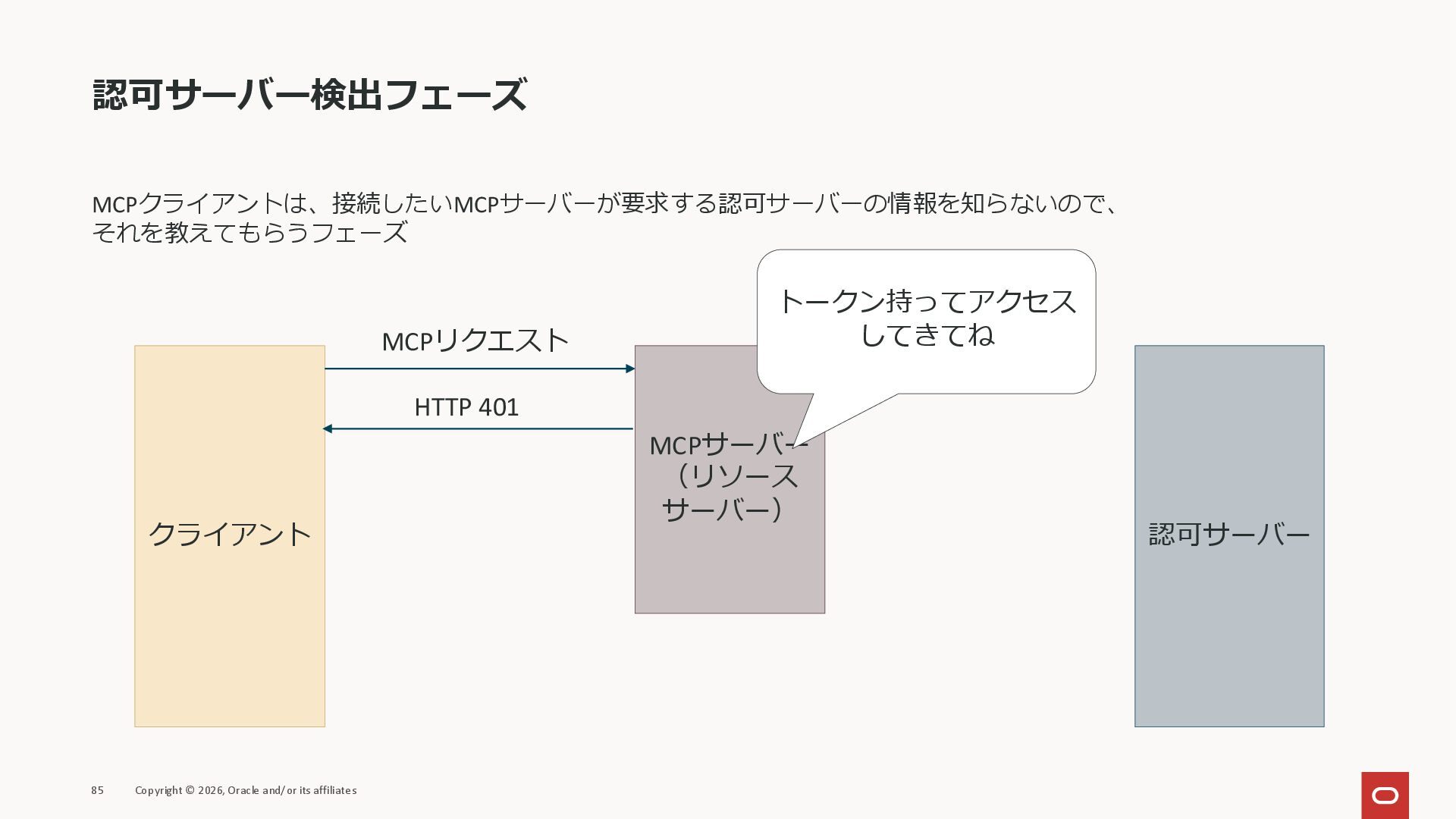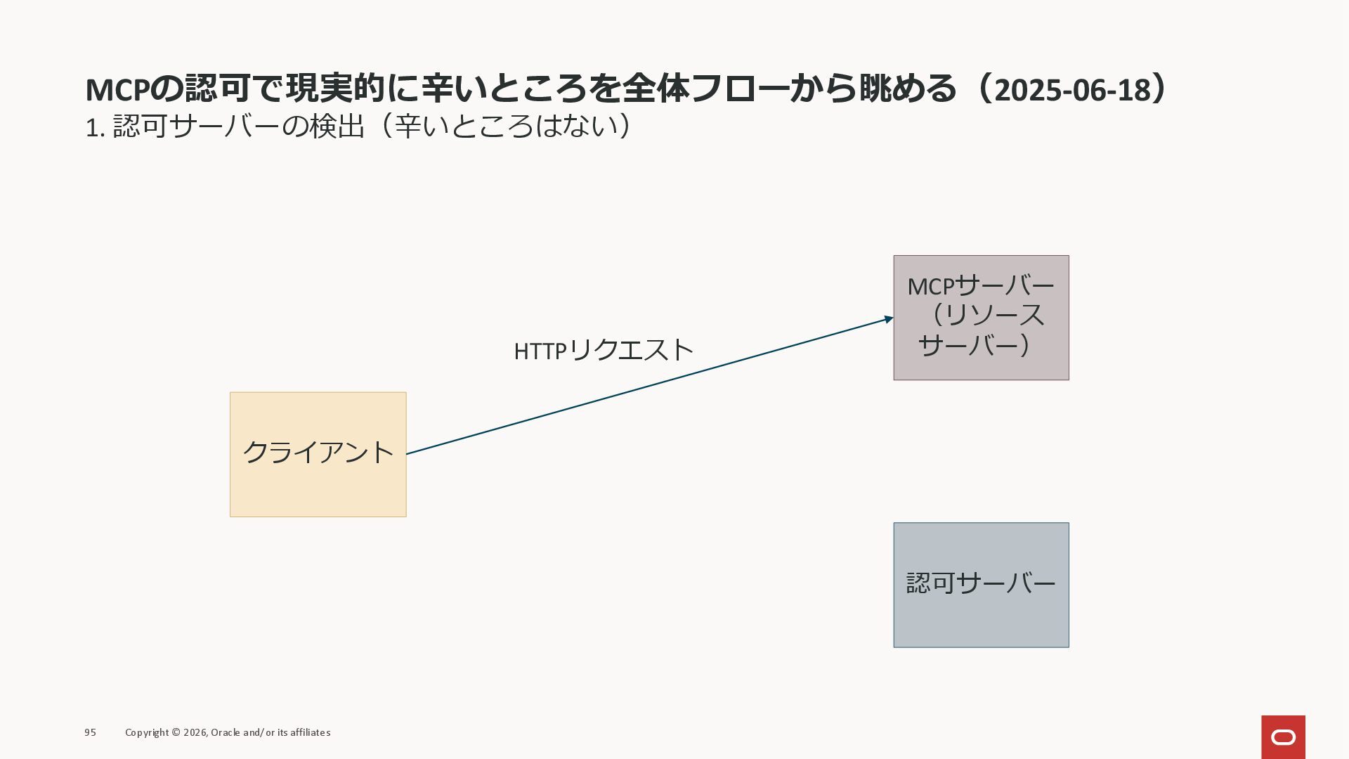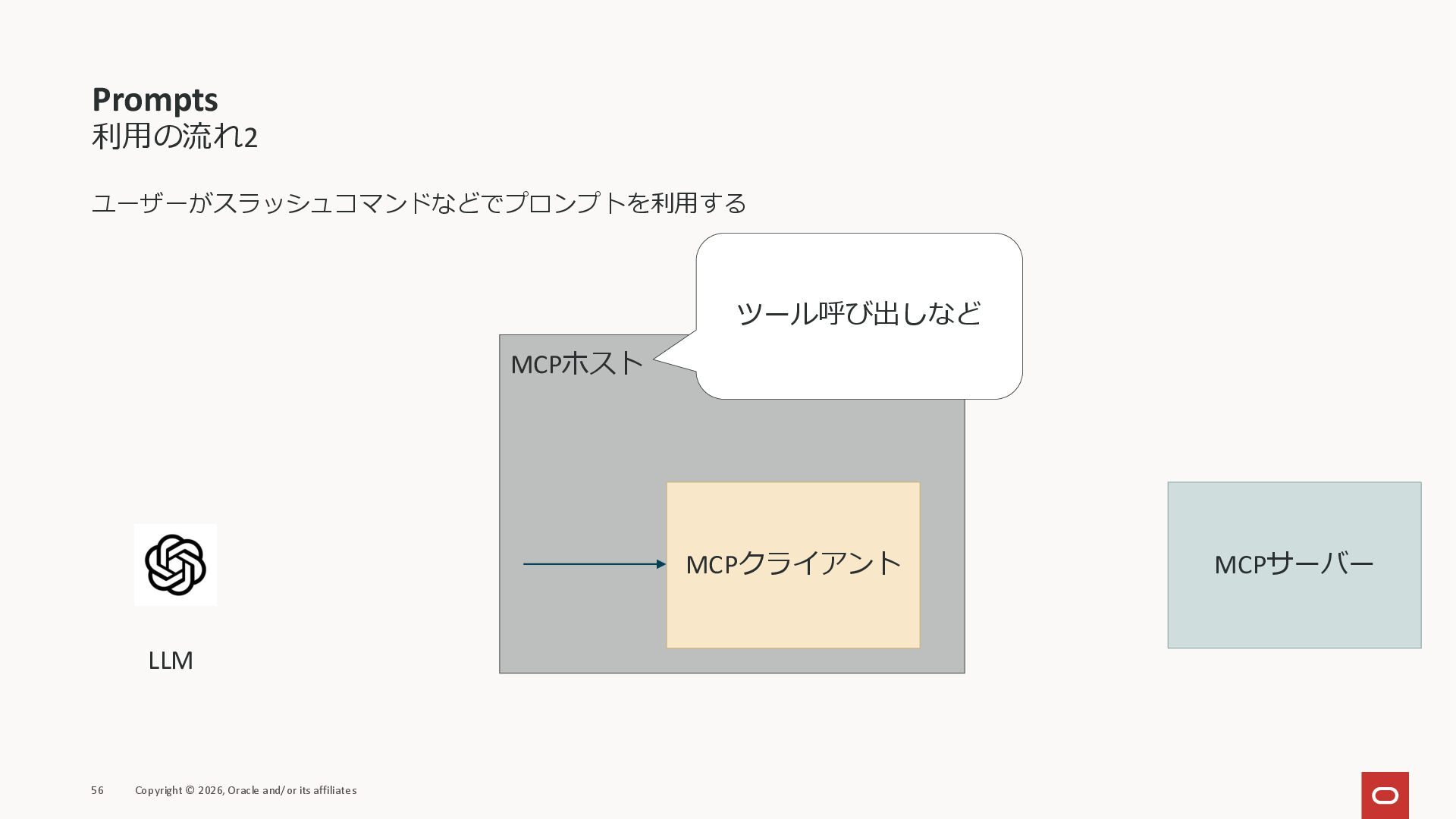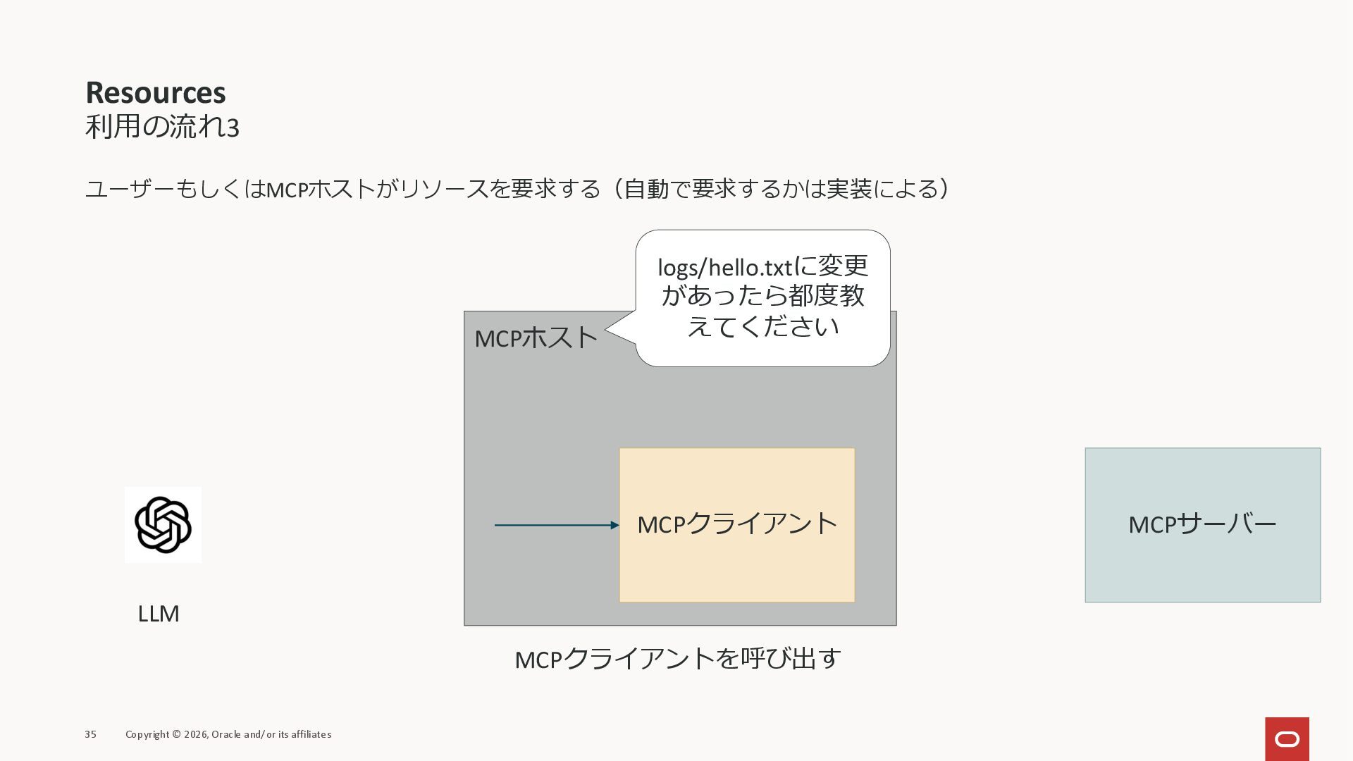 affiliates MCPクライアント MCPサーバー JSON-RPC 2.0 MCPの仕様 (メソッドなど) JSON-RPC 2.0 MCPの仕様 (メソッドなど) *JSON-RPC 2.0では、jsonrpc, id, method, paramsなどのフィールドが定義されているが、その中に何がくるのかまでは定 義されていない MCPは、その中(例えばmethodの中)にどういう名前が入るかなどを定義している *https://www.jsonrpc.org/specification