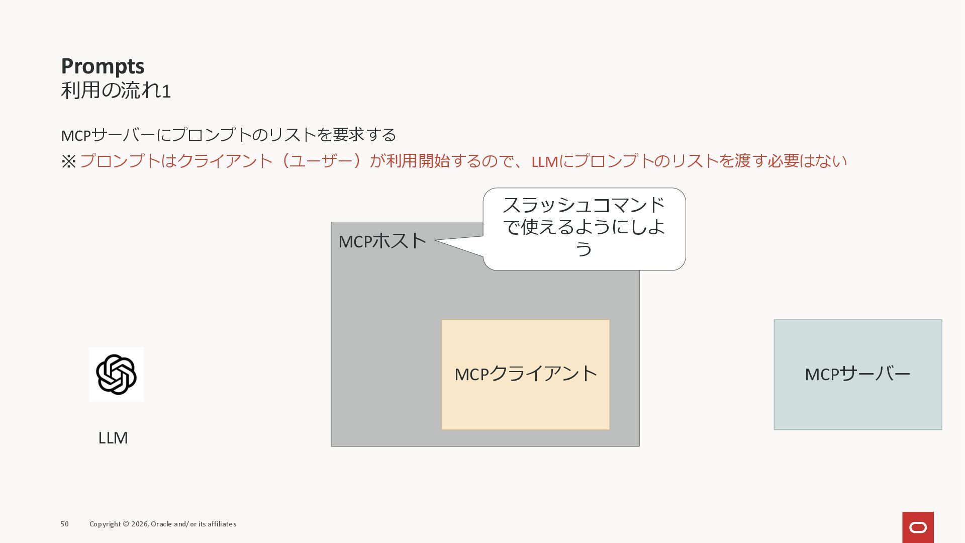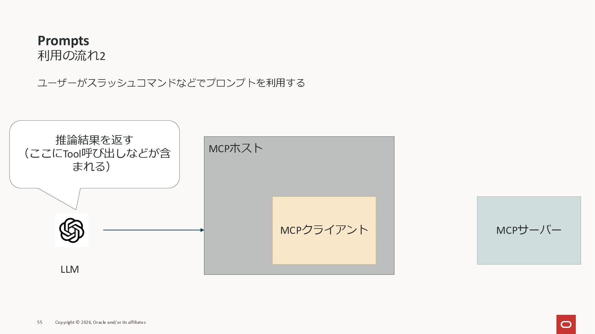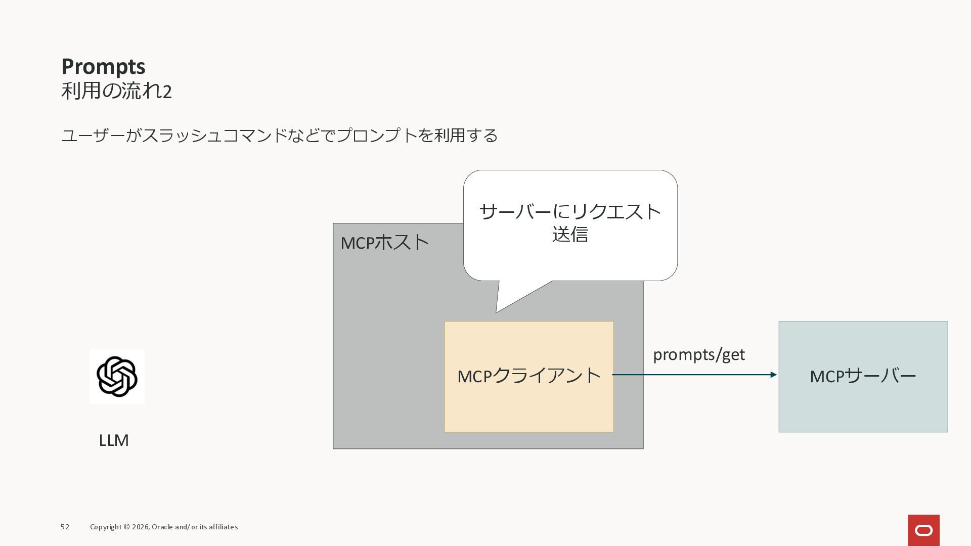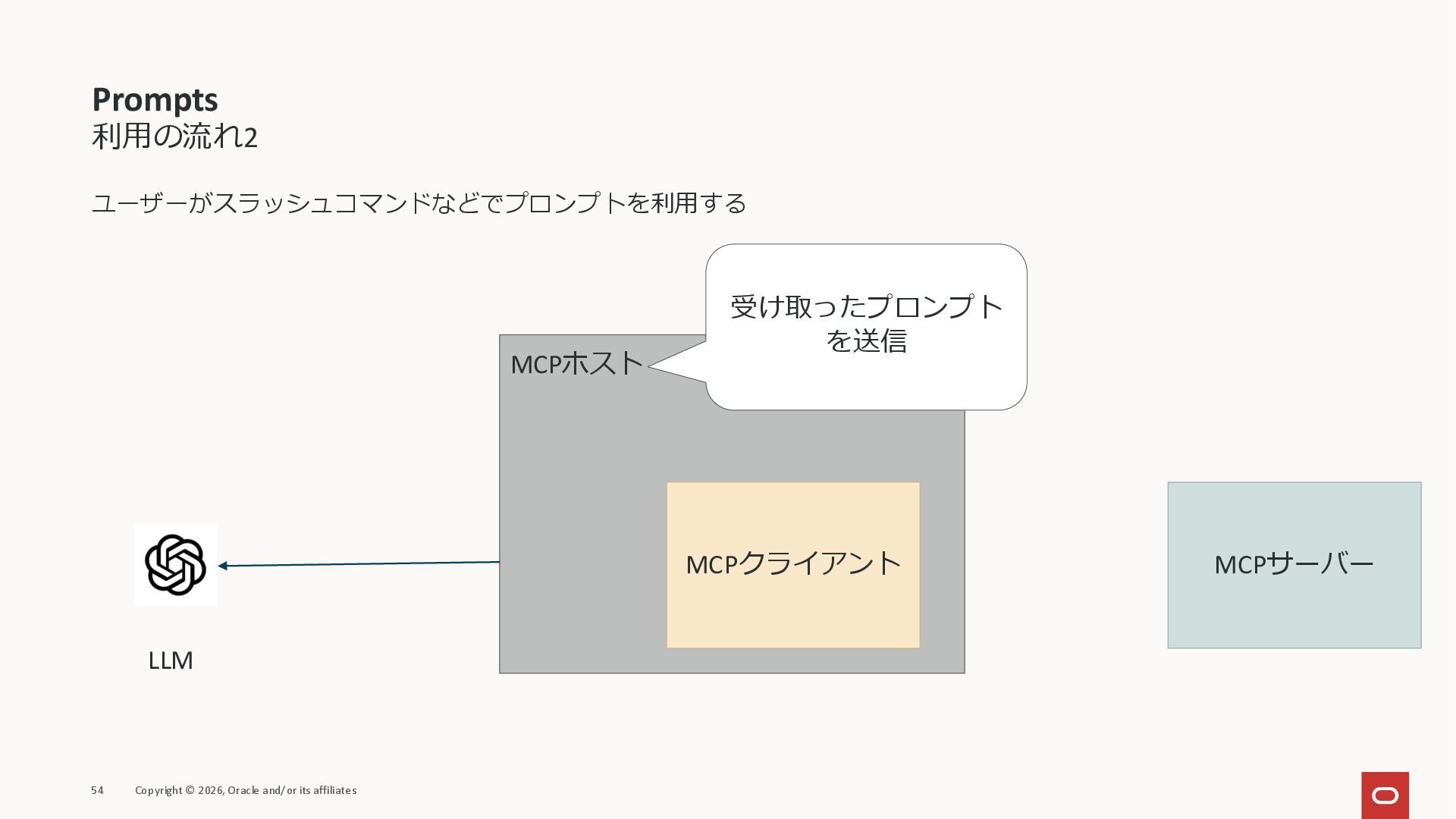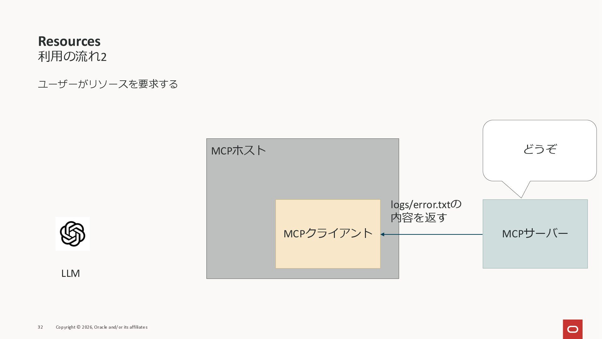 affiliates MCPクライアント MCPサーバー JSON-RPC 2.0 MCPの仕様 (メソッドなど) JSON-RPC 2.0 MCPの仕様 (メソッドなど) *JSON-RPC 2.0では、jsonrpc, id, method, paramsなどのフィールドが定義されているが、その中に何がくるのかまでは定 義されていない MCPは、その中(例えばmethodの中)にどういう名前が入るかなどを定義している *https://www.jsonrpc.org/specification