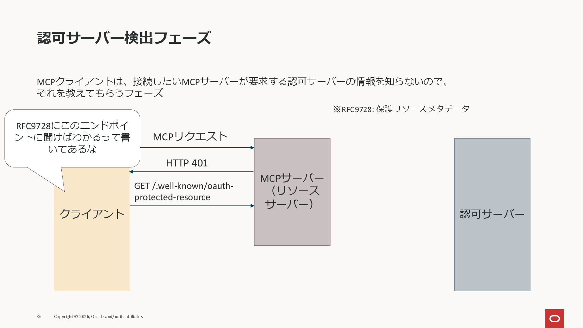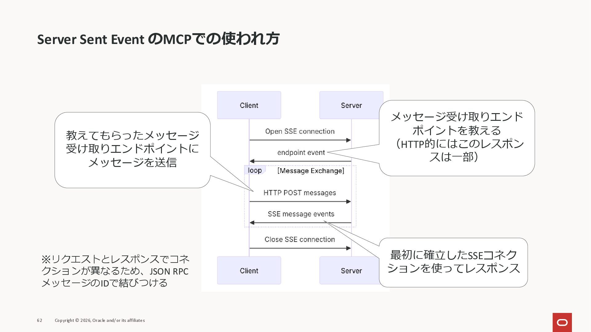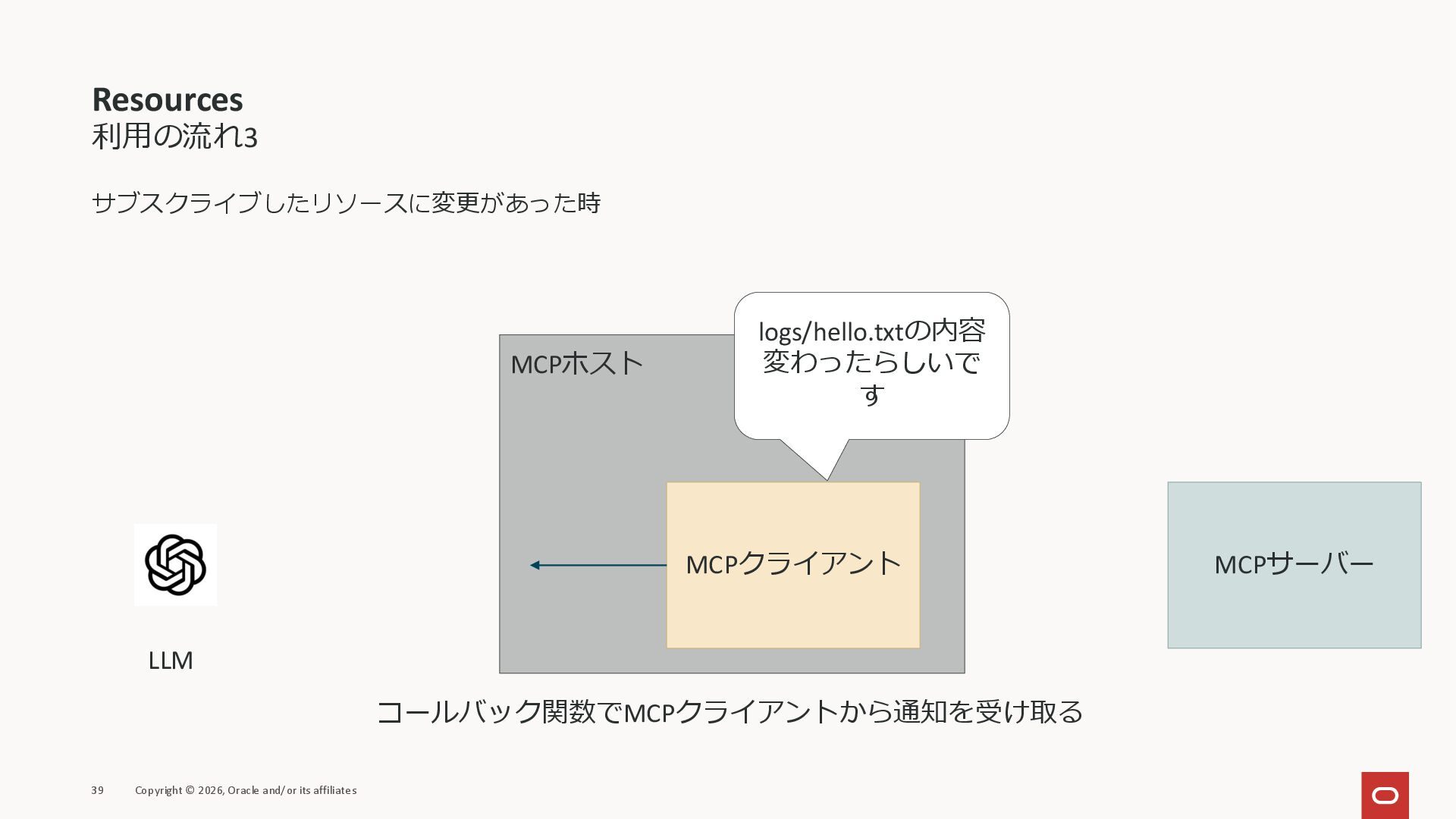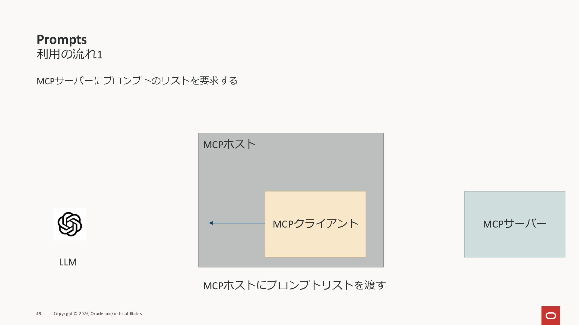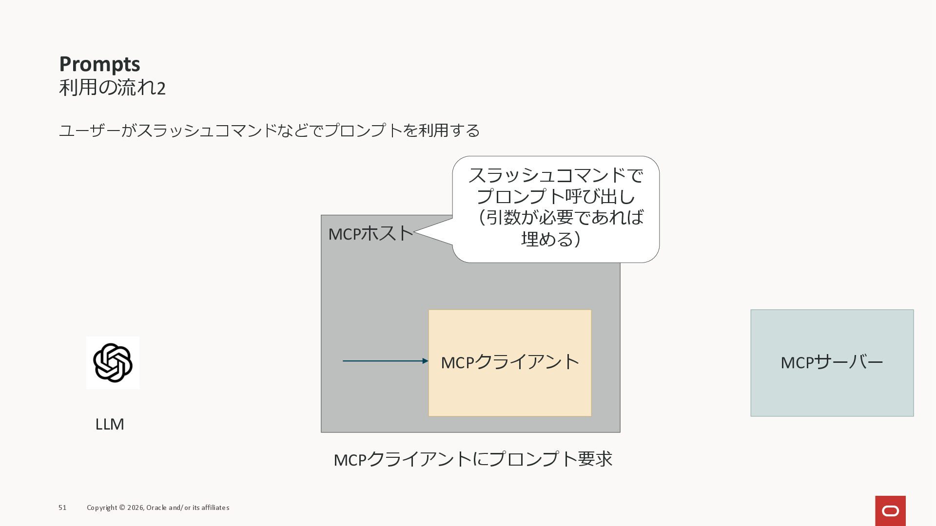 affiliates MCPクライアント MCPサーバー JSON-RPC 2.0 MCPの仕様 (メソッドなど) JSON-RPC 2.0 MCPの仕様 (メソッドなど) *JSON-RPC 2.0では、jsonrpc, id, method, paramsなどのフィールドが定義されているが、その中に何がくるのかまでは定 義されていない MCPは、その中(例えばmethodの中)にどういう名前が入るかなどを定義している *https://www.jsonrpc.org/specification