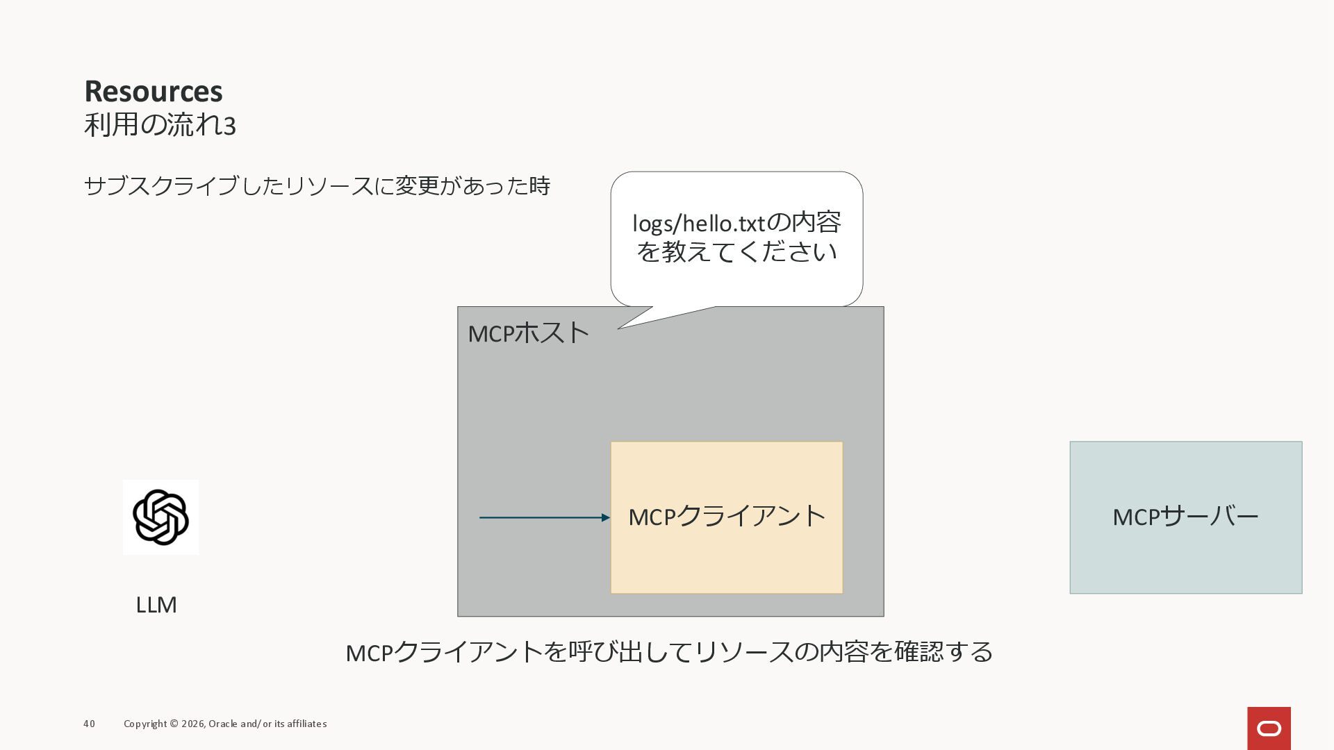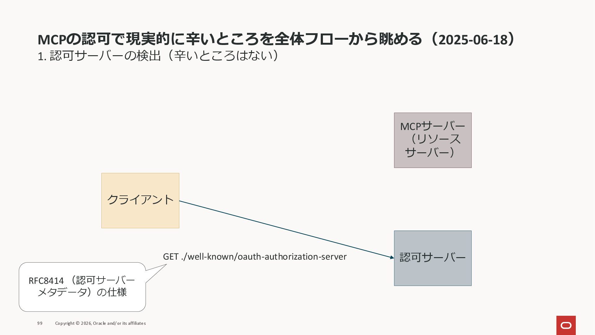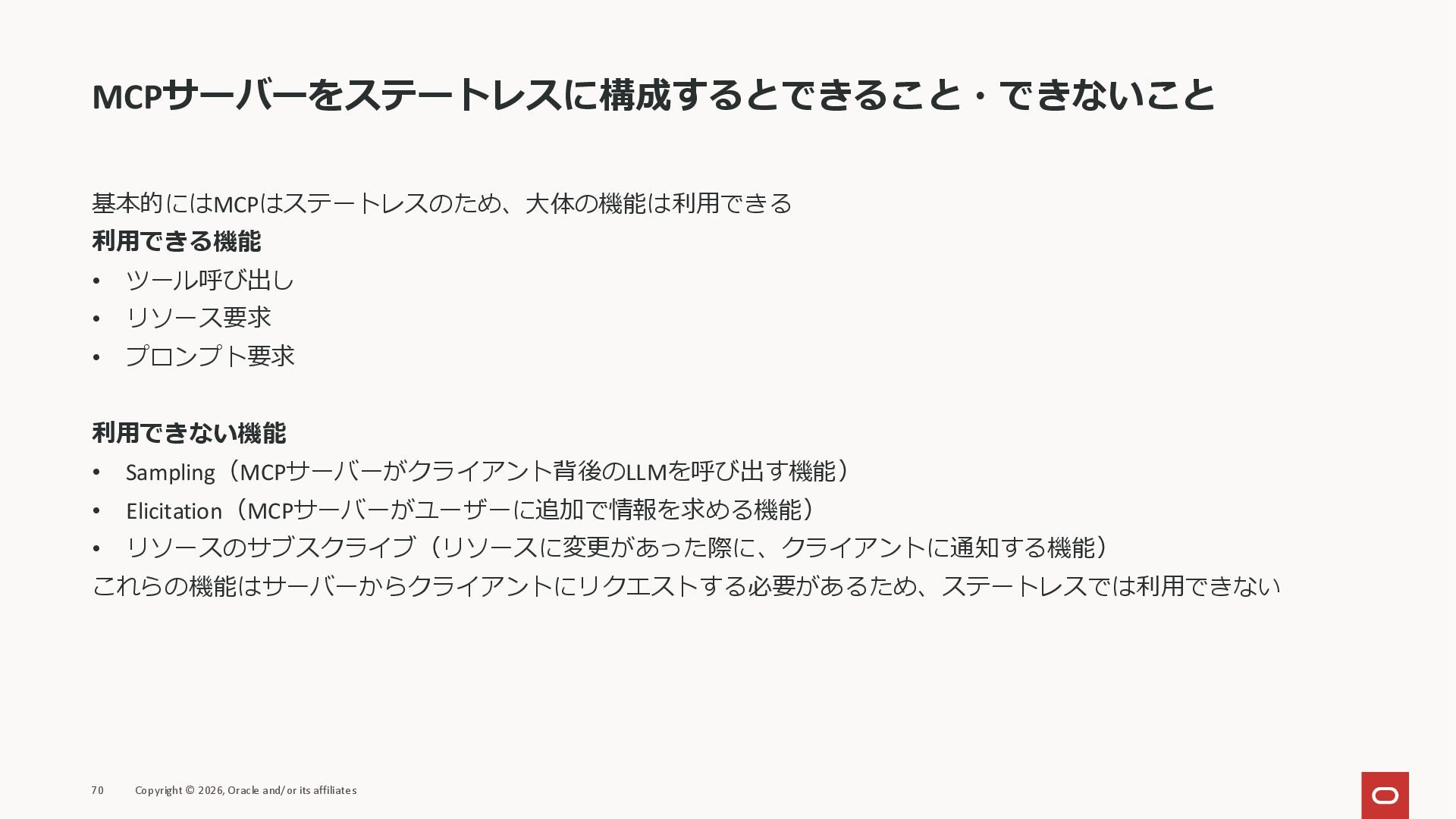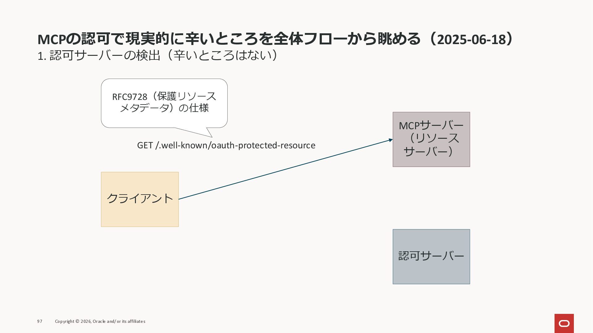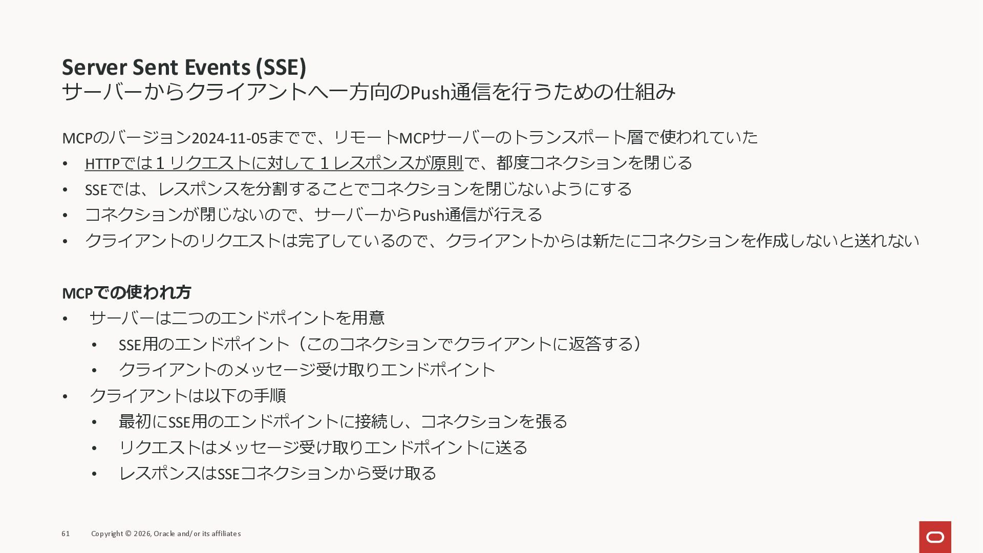 affiliates MCPクライアント MCPサーバー JSON-RPC 2.0 MCPの仕様 (メソッドなど) JSON-RPC 2.0 MCPの仕様 (メソッドなど) *JSON-RPC 2.0では、jsonrpc, id, method, paramsなどのフィールドが定義されているが、その中に何がくるのかまでは定 義されていない MCPは、その中(例えばmethodの中)にどういう名前が入るかなどを定義している *https://www.jsonrpc.org/specification