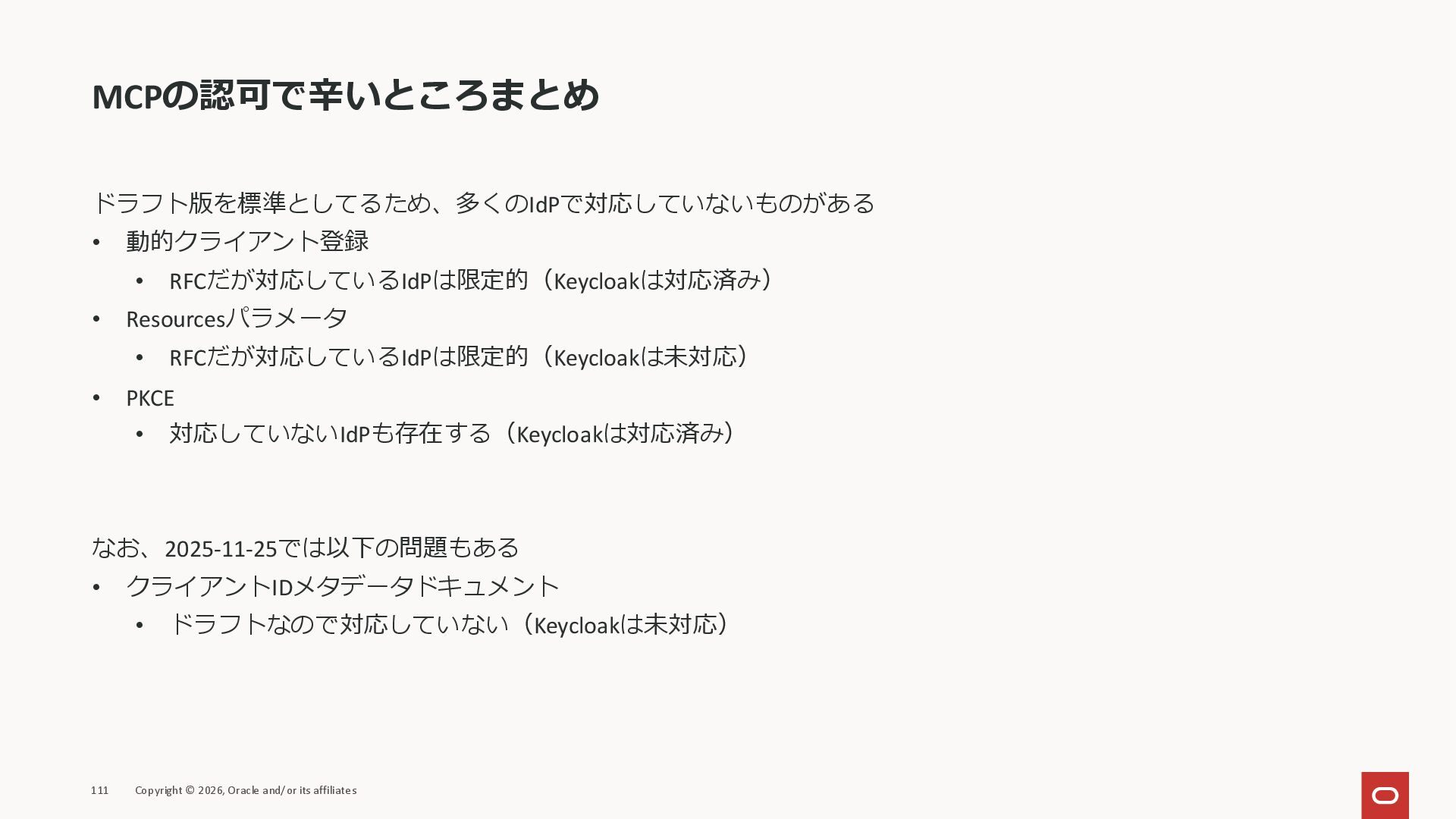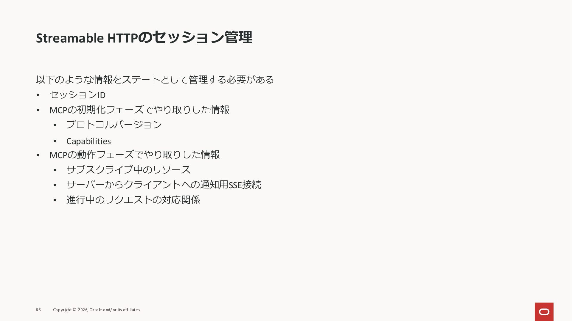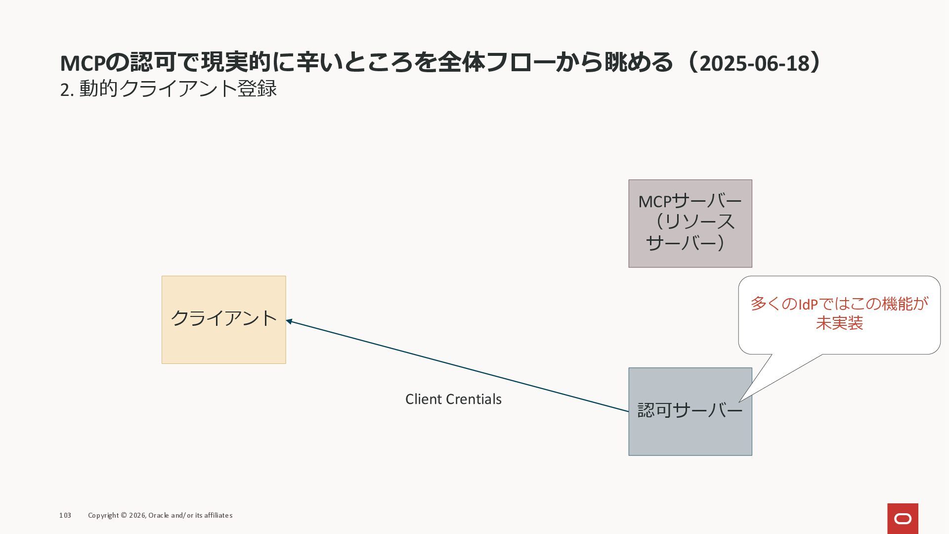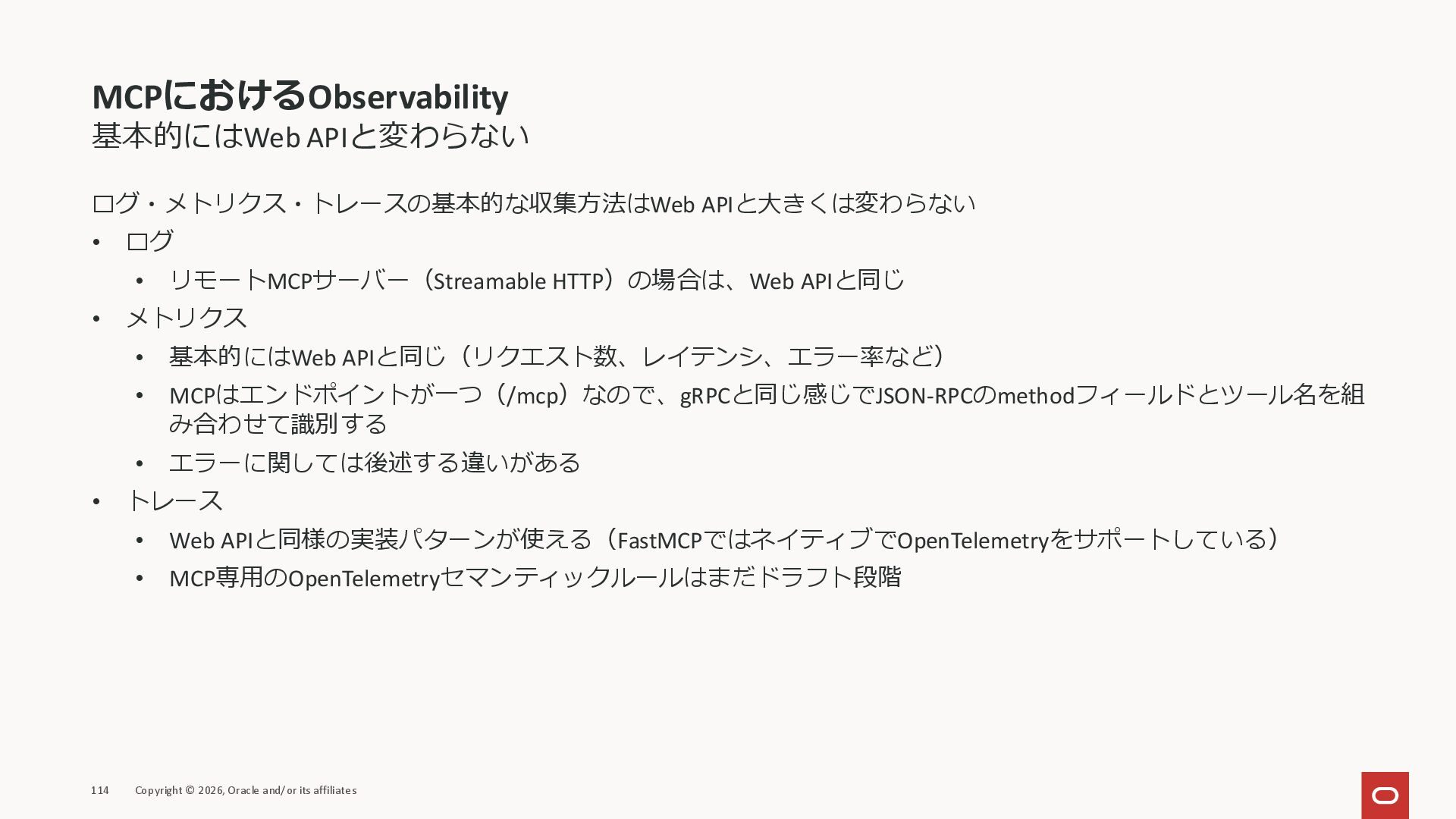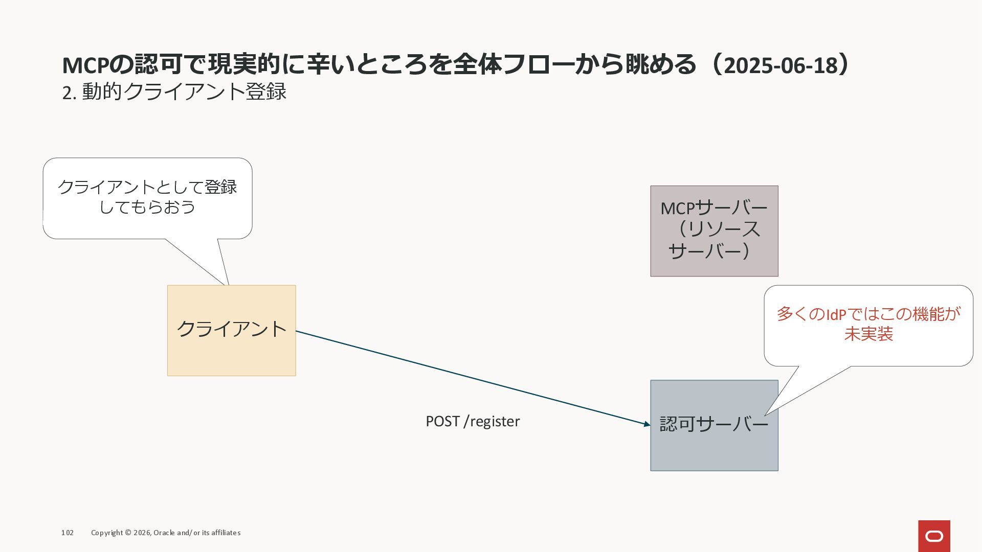 affiliates MCPクライアント MCPサーバー JSON-RPC 2.0 MCPの仕様 (メソッドなど) JSON-RPC 2.0 MCPの仕様 (メソッドなど) *JSON-RPC 2.0では、jsonrpc, id, method, paramsなどのフィールドが定義されているが、その中に何がくるのかまでは定 義されていない MCPは、その中(例えばmethodの中)にどういう名前が入るかなどを定義している *https://www.jsonrpc.org/specification